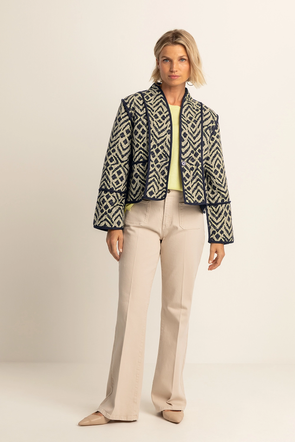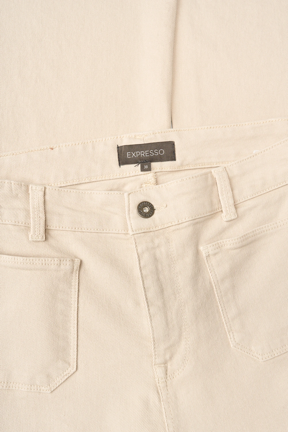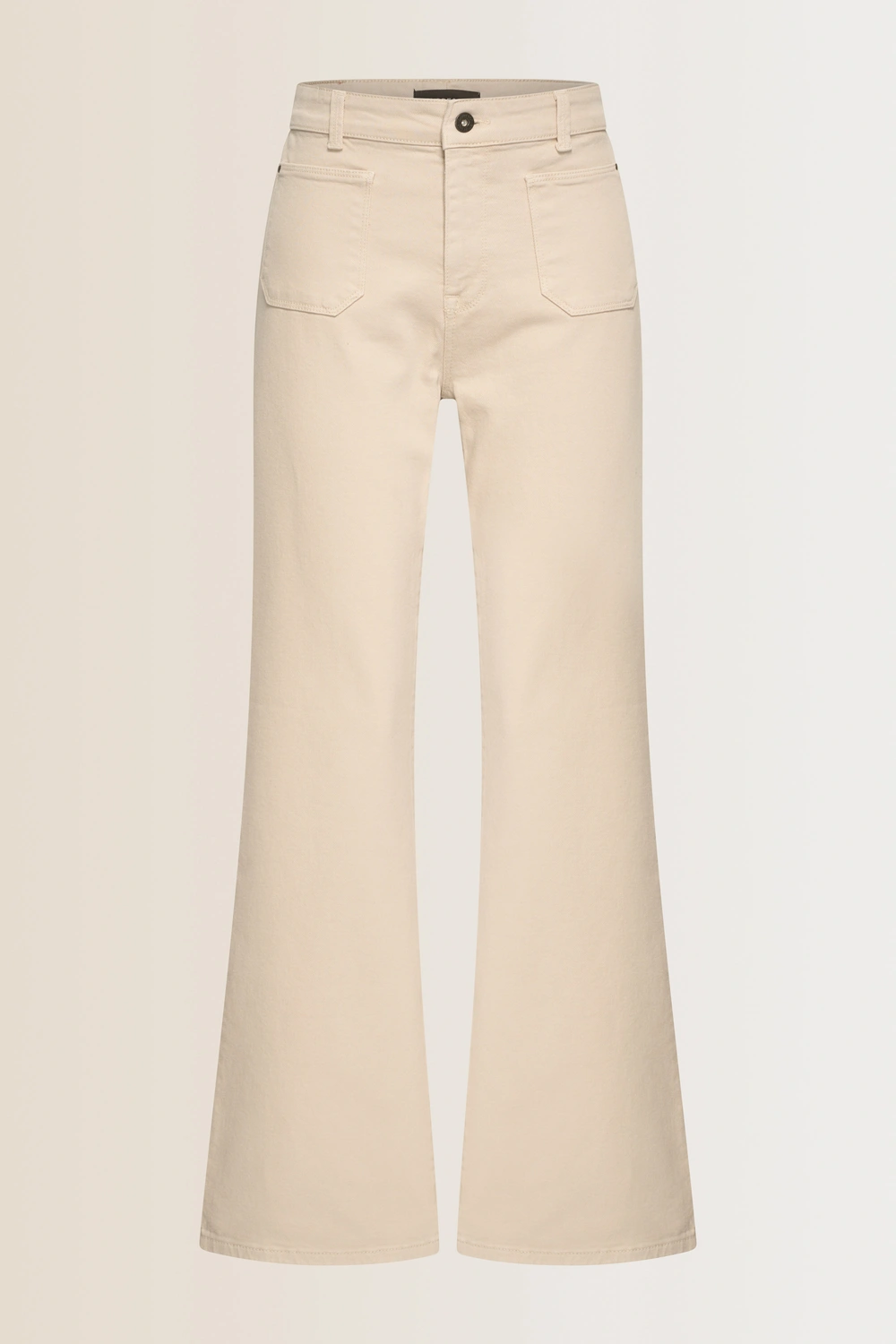 Zandkleurige flared jeans – stevige denim met een beetje stretch. High rise model met een aangesloten pasvorm tot aan de knie en een elegante uitlopende pijp. De opgestikte zakken geven deze jeans een moderne seventies-vibe. Een perfecte basic met een twist: draag met een blouse en blazer voor een casual-chique look, of combineer met een T-shirt en sneakers voor een relaxte look.