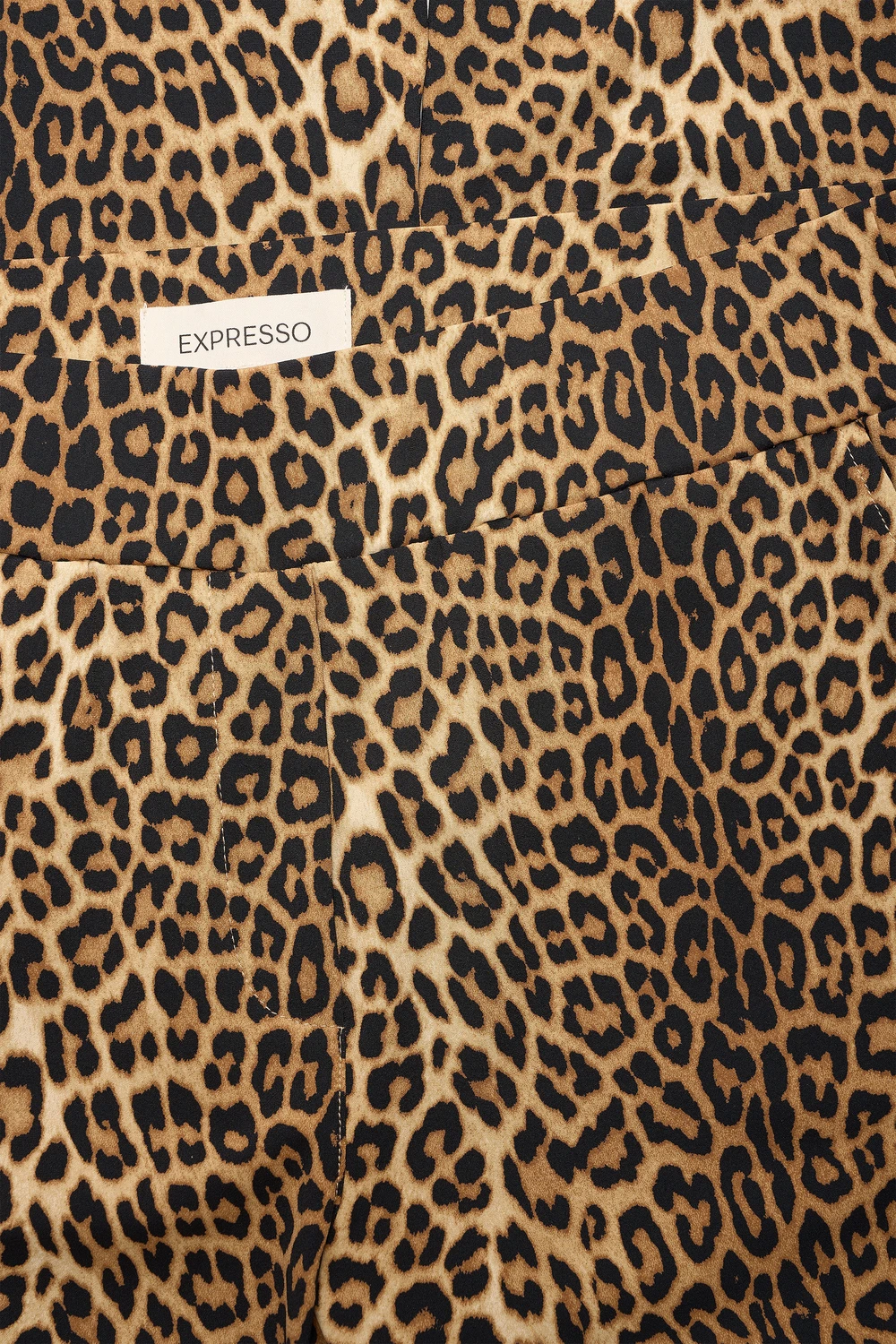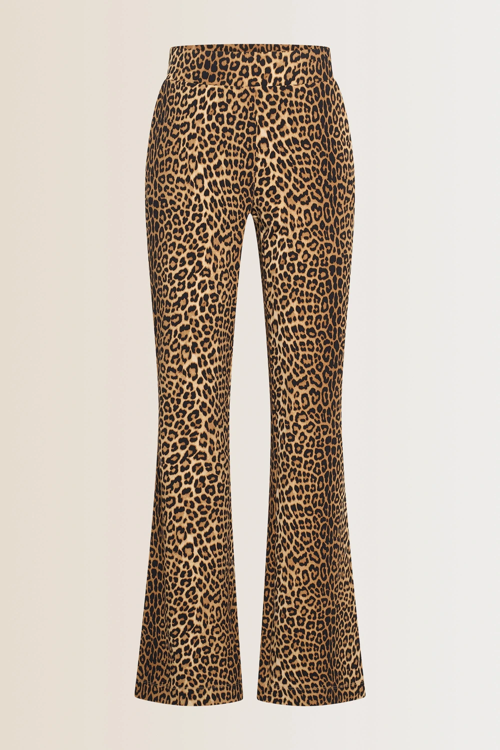 Flared broek met luipaardprint – travelstretchkwaliteit. De nauwsluitende pasvorm rond de heup en het dijbeen loopt uit in een licht uitlopende pijp, wat zorgt voor een flatterend silhouet. De elastische tailleband biedt optimaal draagcomfort, terwijl de opvallende animalprint elke look een krachtige, modieuze twist geeft. Combineer met een effen top voor balans of ga voor all-over print voor een statement outfit.