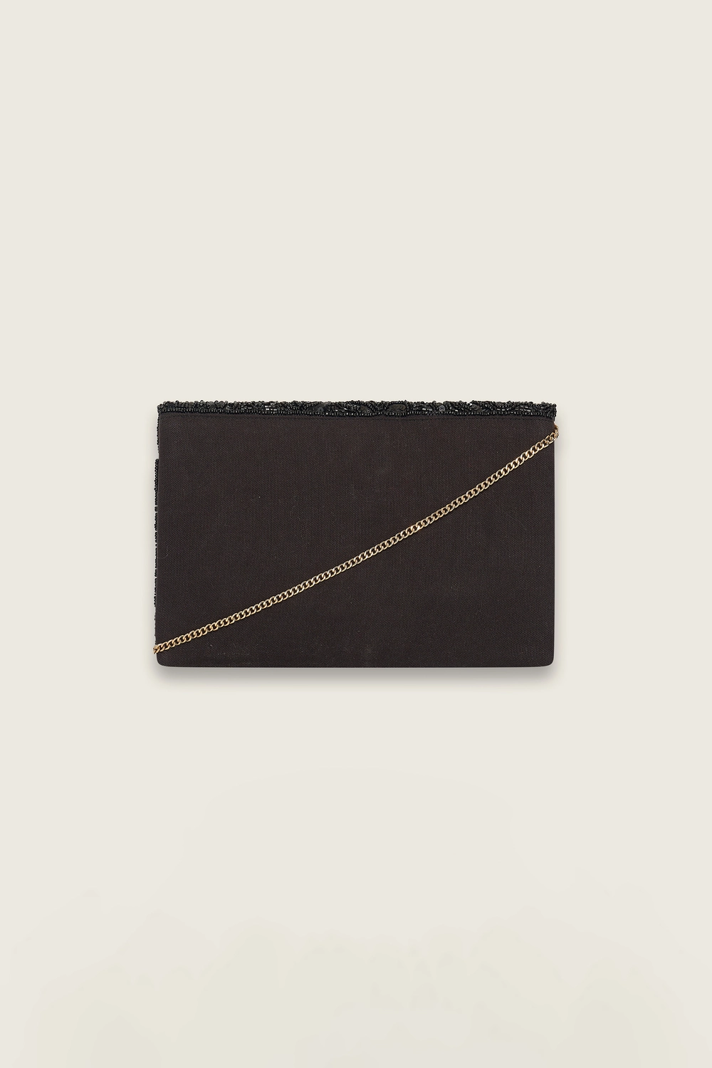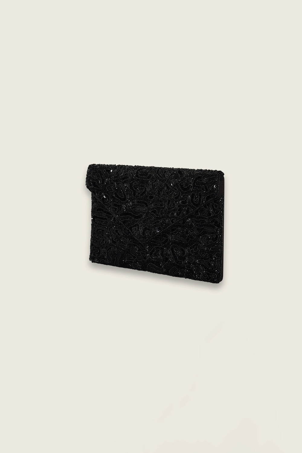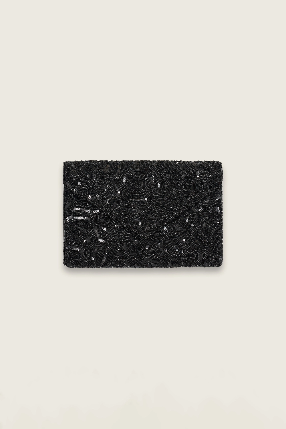Zwarte clutch – met kraaltjes en pailletten. Compact en elegant, uitgevoerd in een envelopmodel met subtiele glans die licht vangt bij elke beweging. De verfijnde details geven deze tas een luxe uitstraling, ideaal voor feestelijke gelegenheden en avondlooks.
