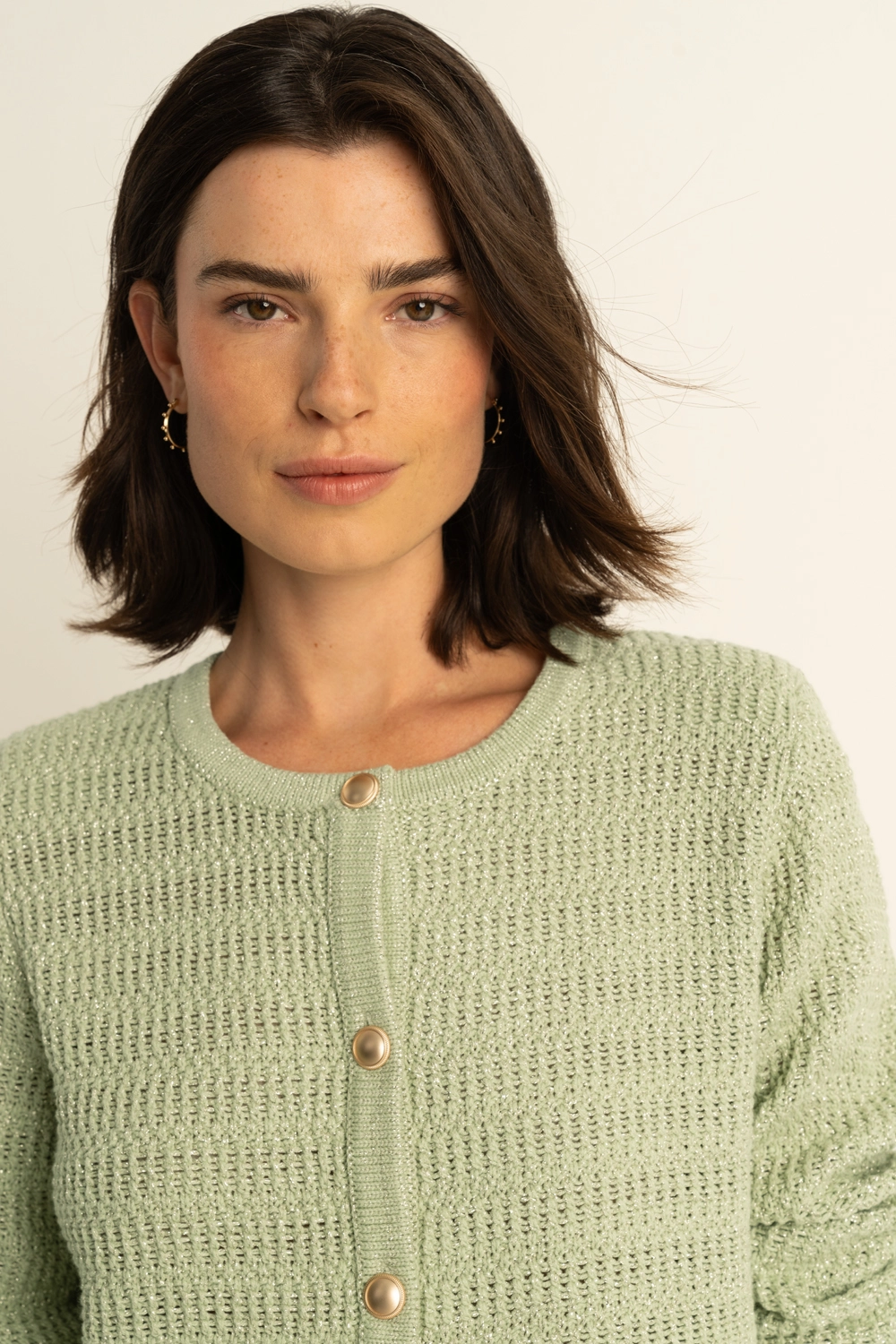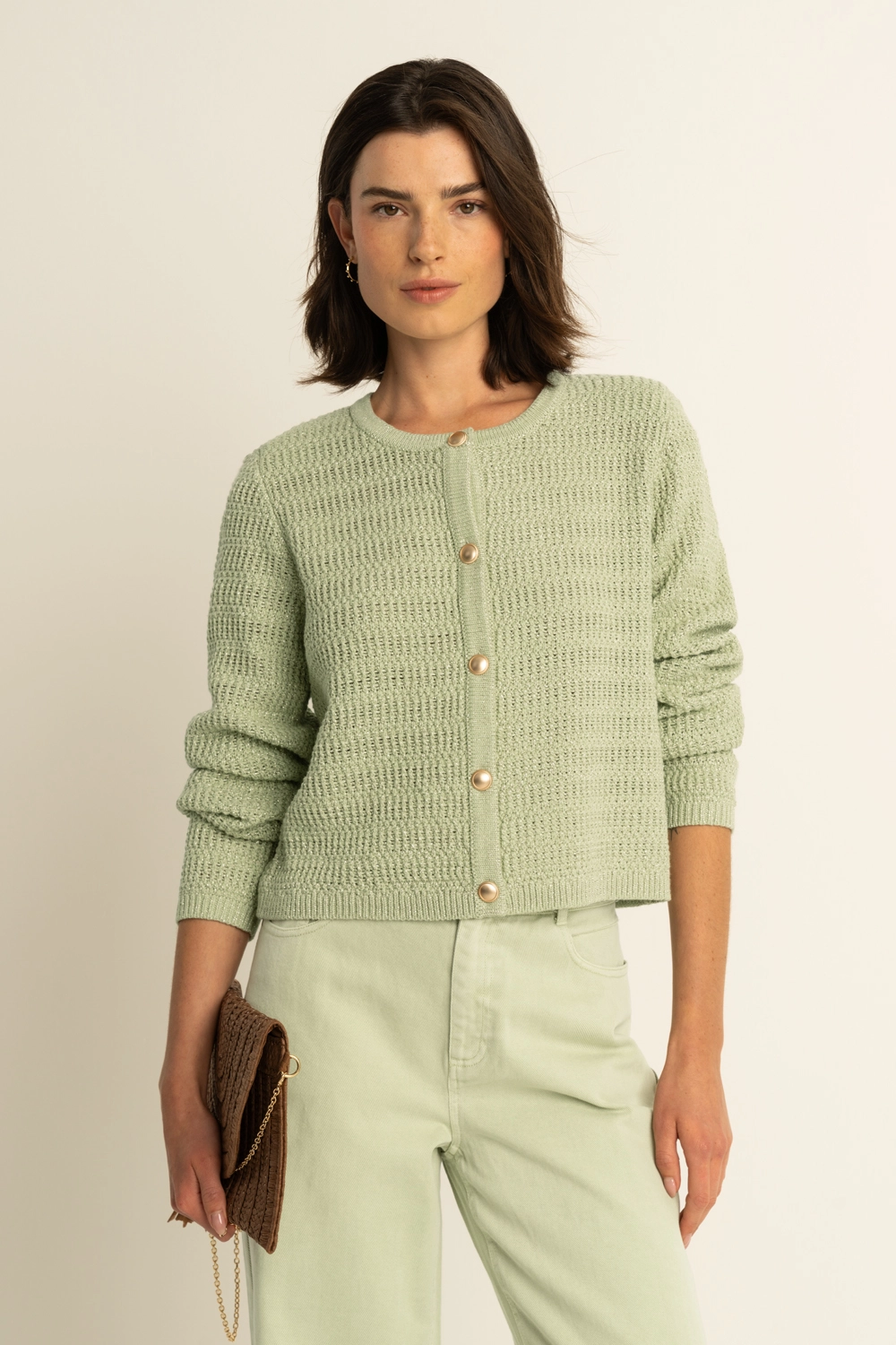 Lichtgroen vest – fijngebreide knit met een open structuur, een ronde hals en knopen. De opengewerkte structuur geeft dit vest een luchtige, uitstraling draag ‘m losjes over een top of dichtgeknoopt als trui, perfect om casual looks net wat chiquer te maken