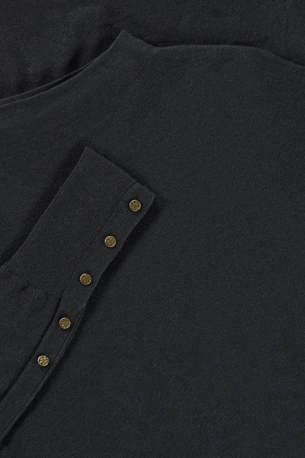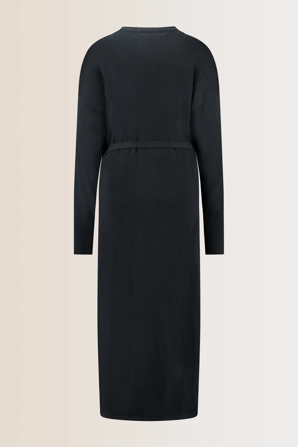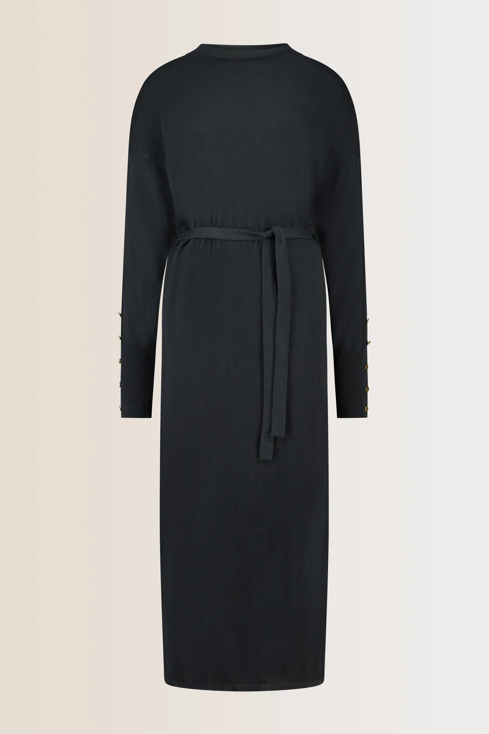 Navyblauwe gebreide jurk – wolmix. Relaxte pasvorm met ceintuur, lange mouwen, kuitlengte. Fijngebreid, voelt zacht en wollig. Warm en comfortabel, hoge manchetten met chique goudkleurige knopen. Stylingtip: draag je laarzen in een contrastkleur, kies dan voor een (leren) ceintuur in dezelfde tint.