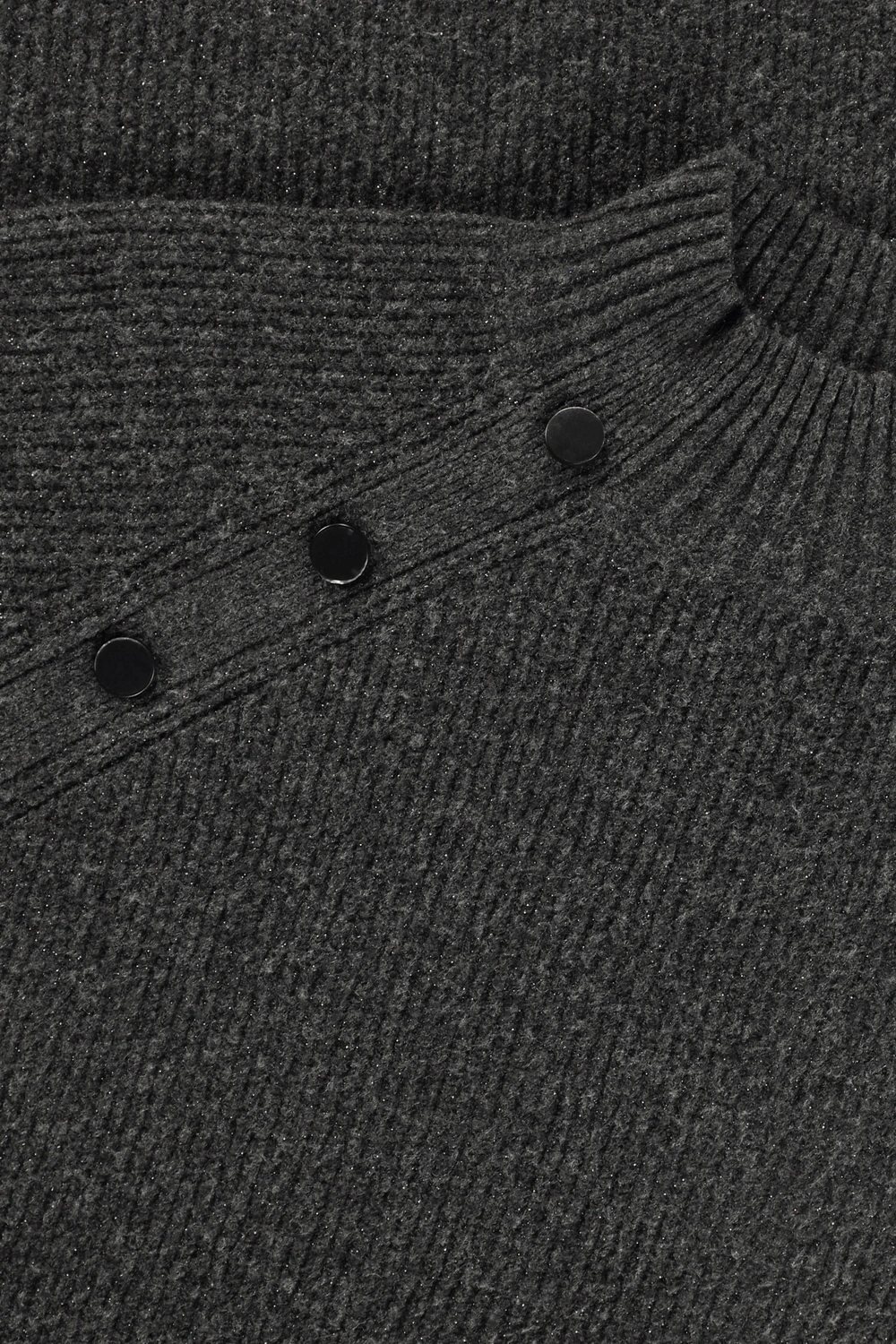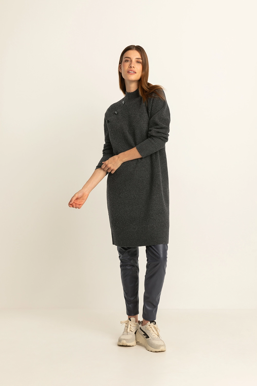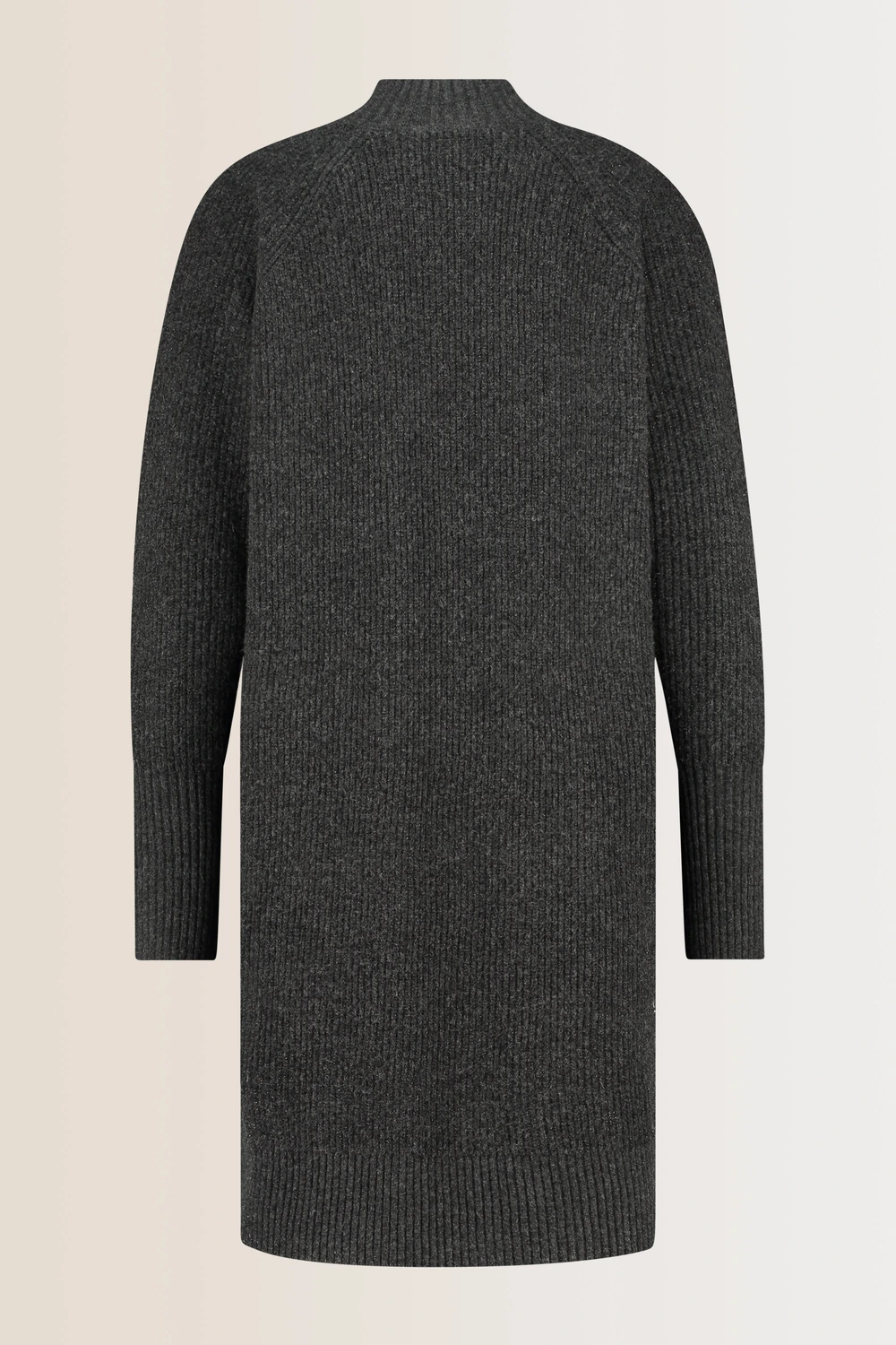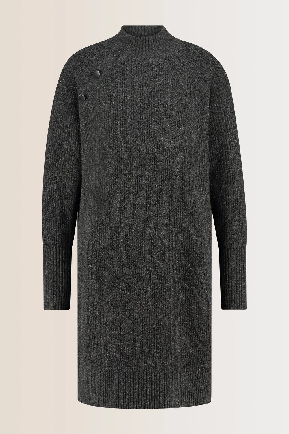Donkergrijze gebreide jurk – stretch wolmix. Recht & relaxed, raglanmouwen met faux knoopsluiting rechts, lengte rond de knie. Wollig ribbreisel, glinsterende ton sur ton lurex. Warme, comfortabele en stijlvolle jurk voor elke (werk-)dag.
