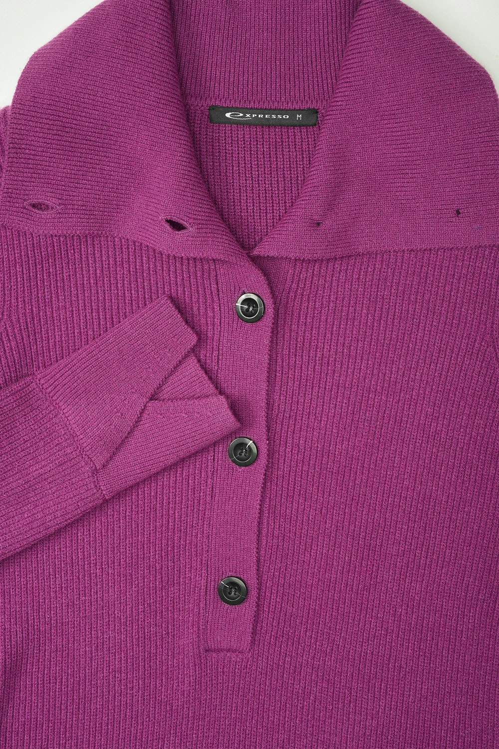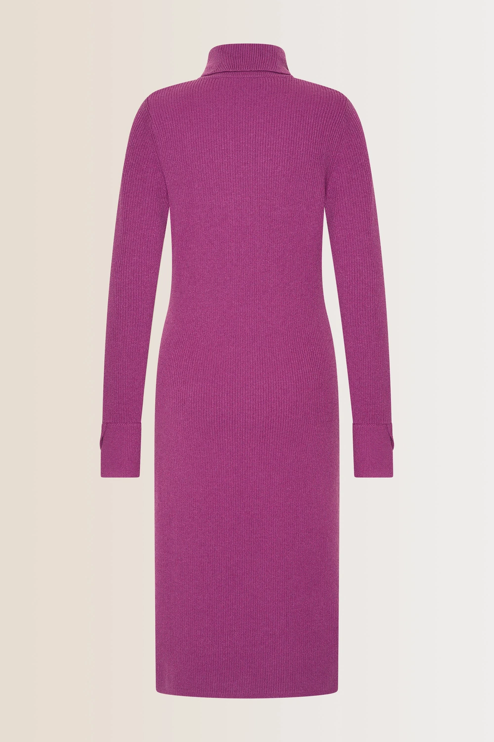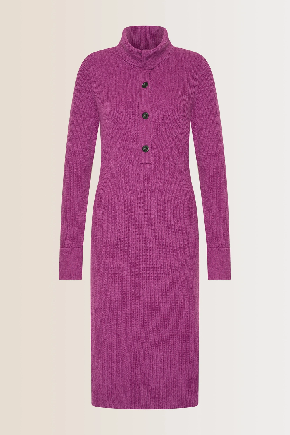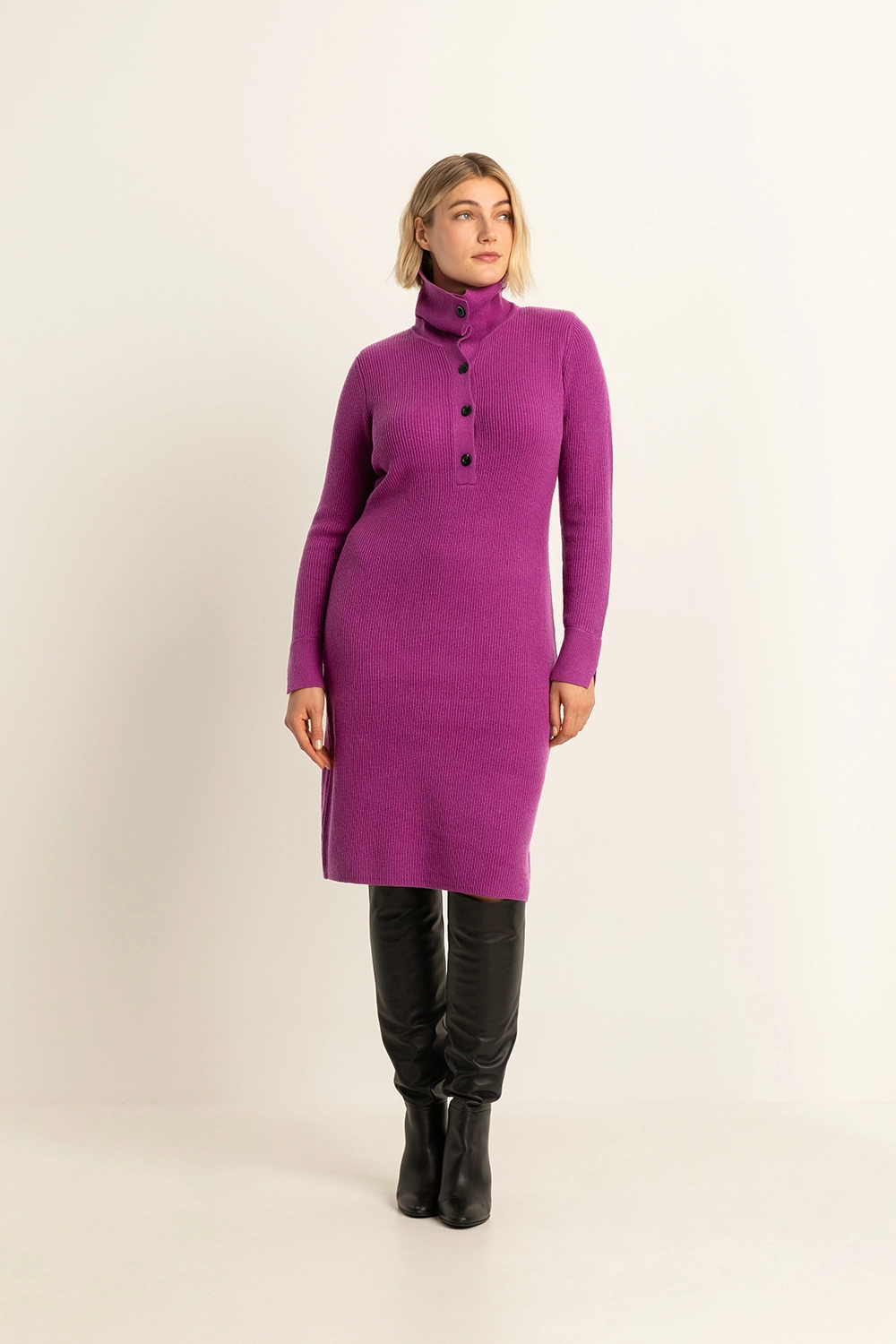 Fuchsia gebreide jurk. Middelhoge opstaande kraag, knopenrij tot halverwege en lange mouwen met brede manchetten. Ribgebreide stof met een aansluitende pasvorm, ideaal om je figuur te accentueren zonder in te leveren op comfort.