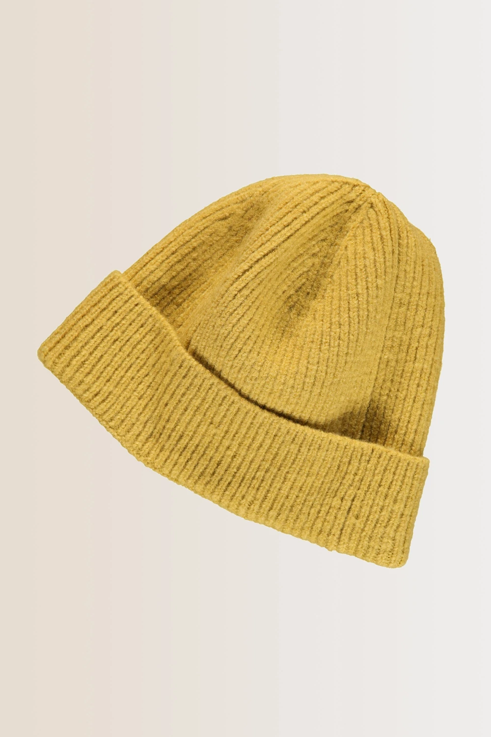 EX24-92012 Okergele muts – ribgebreid. Dit beanie-model met omgeslagen rand is de finishing touch van al je winterlooks! Tip: er is ook een bijpassende shawl. Draag ze als set of los van elkaar. • 1 maat