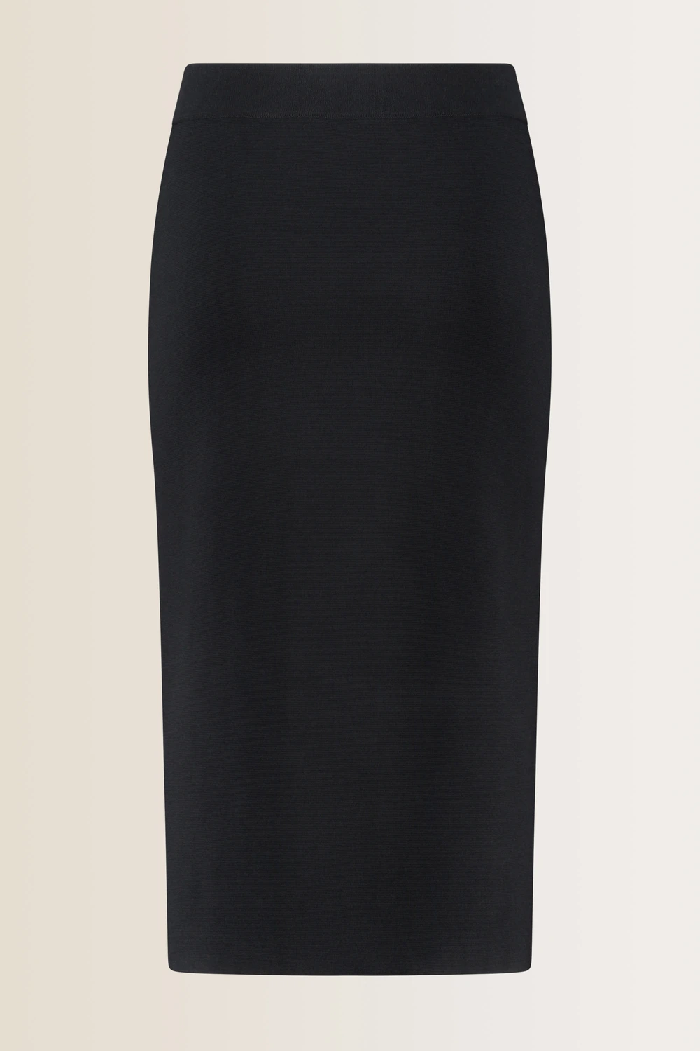 Zwarte gebreide midi-rok - viscosemix. Semi-fitted, hoge zijsplit links, kuitlengte. Glad, licht glanzend crêpegaren. Stevig ribgebreid, ‘tekent’ niet. Tip: stel een veelzijdige co-ord set samen met de bijpassende tuniektop, broek en gilet.