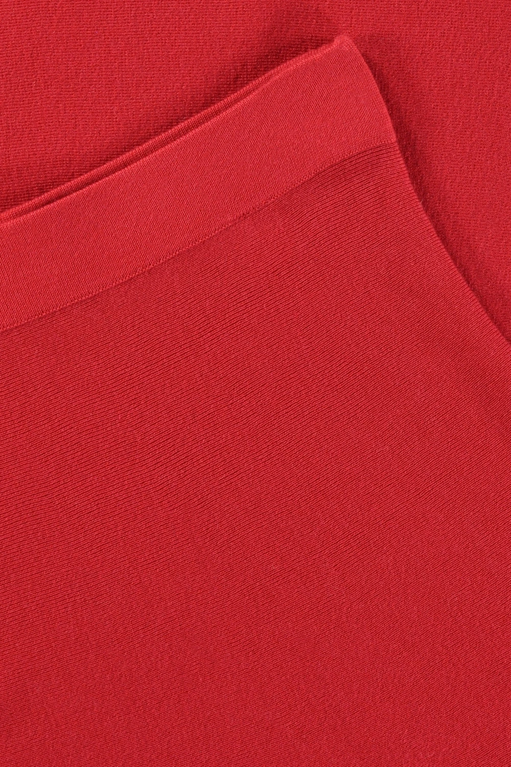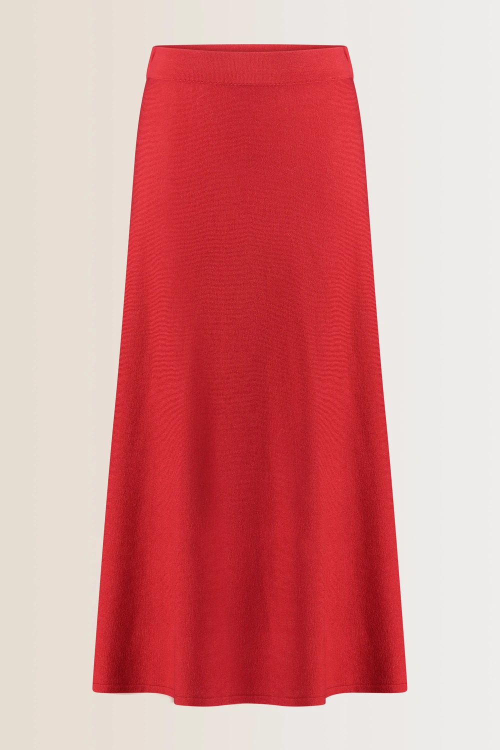 Helderrode gebreide rok – stretch wolmix. Valt glad rond taille en heupen, uitlopende rok, lengte tussen kuit en enkel. Zwaarvallend ribbreisel, kriebelt niet, kleedt mooi af. Wist je dat rood dragen zelfverzekerdheid uitstraalt? Tip: stel een veelzijdige co-ord set samen met de bijpassende trui.