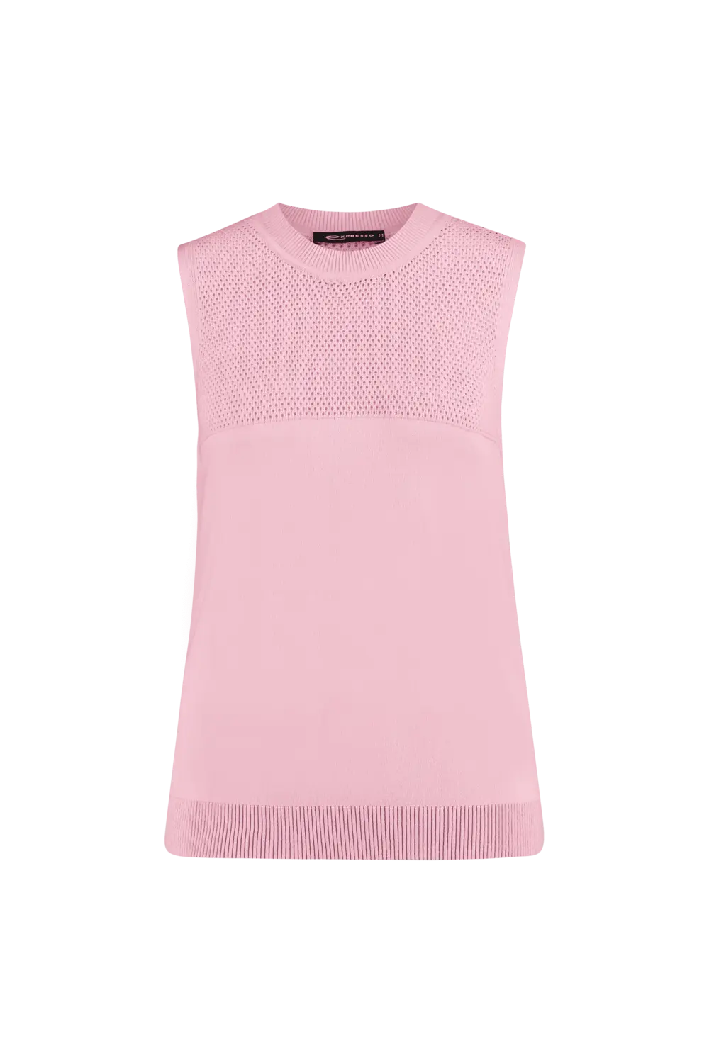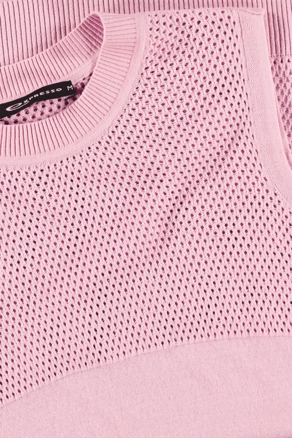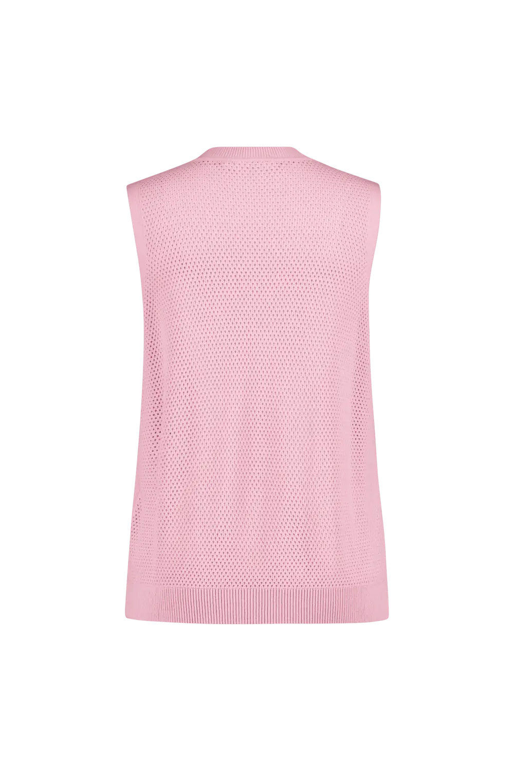 Bloesemroze gebreide top – viscose. Licht aangesloten, hoge ronde hals, heuplengte. Koel aanvoelend crêpegaren, transparant mesh-breisel op de rug en boven de buste. Chic-sportief en veelzijdig combineerbaar, zowel solo als met het bijpassende vest.
