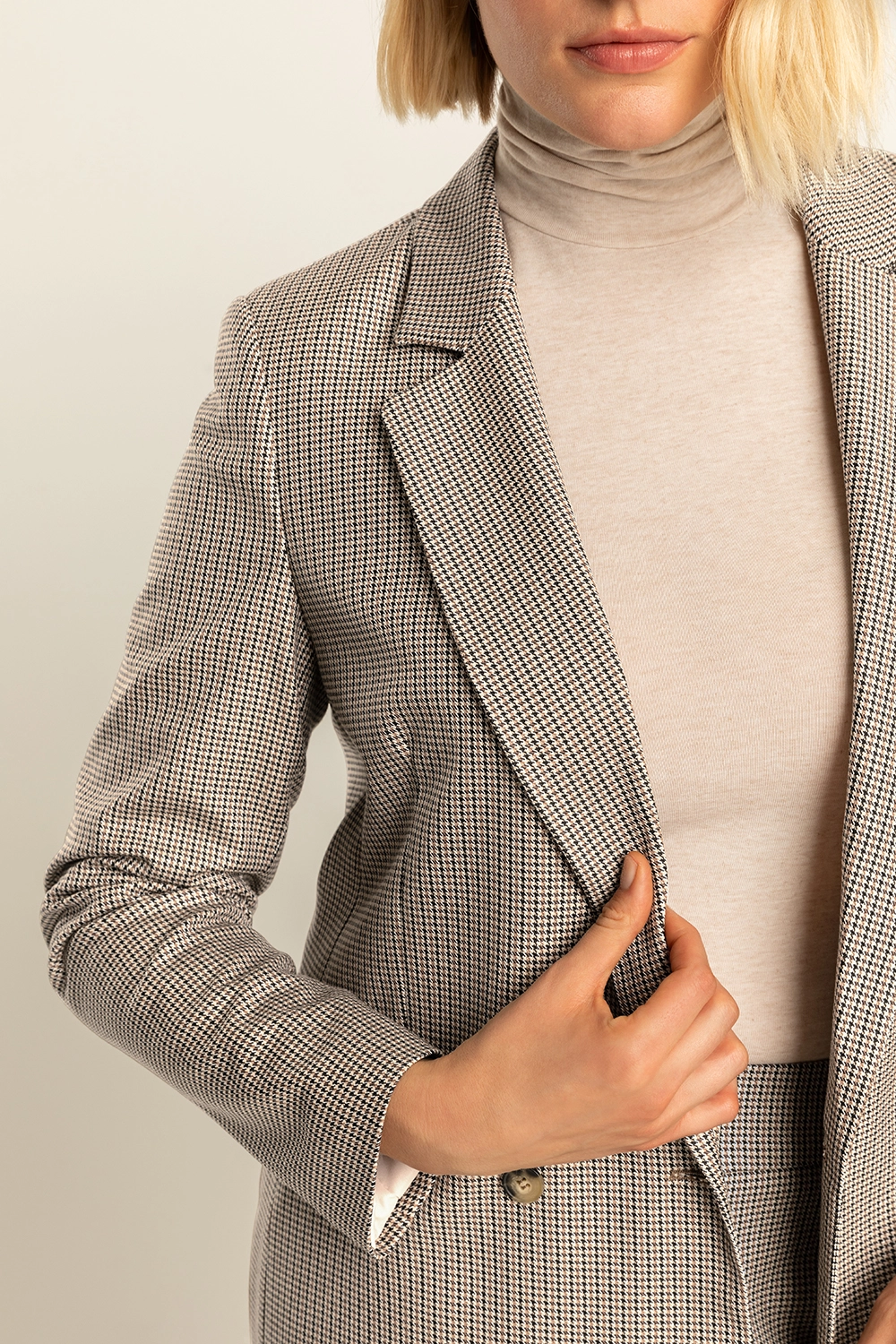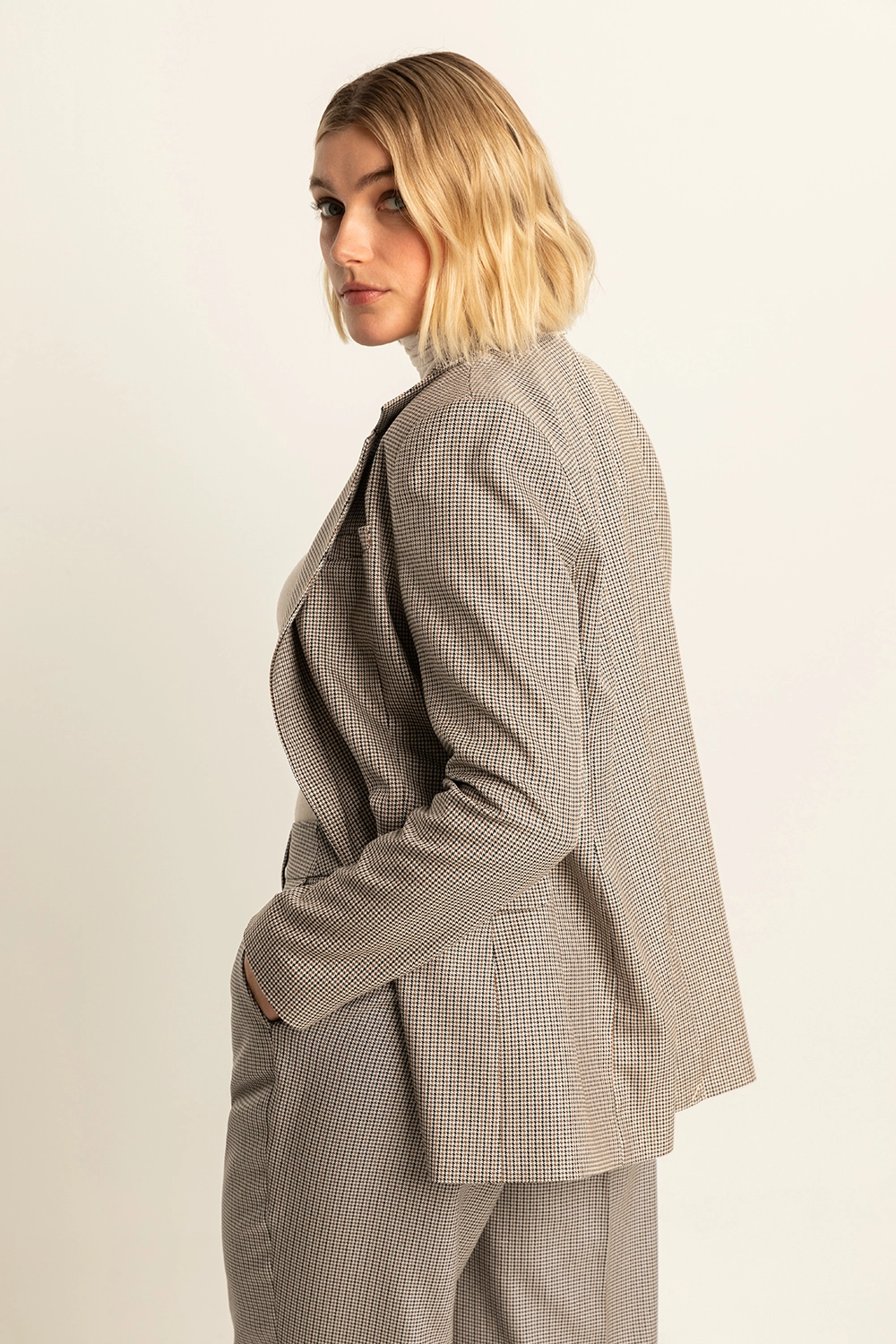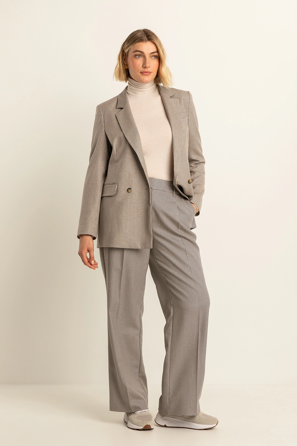 Geruite blazer – Deze double-breasted blazer heeft een tijdloos geruit patroon in neutrale tinten, afgewerkt met klepzakken en een lange reverskraag. Het rechte silhouet en de klassieke ruit maken dit item onmisbaar voor je garderobe.