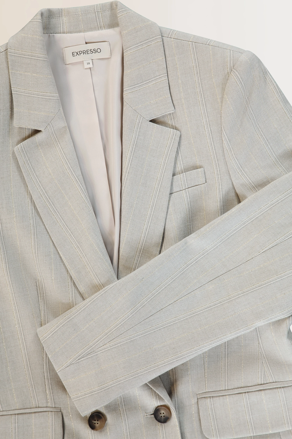 Lichtgrijze krijtstreep blazer – comfortabele kwaliteit met een verfijnde streep. Recht en licht getailleerd, met een klassieke reverskraag en een elegante double-breasted knoopsluiting. De subtiele krijtstreep geeft deze blazer een krachtige, moderne uitstraling, terwijl de cleane belijning zorgt voor een tijdloze look.