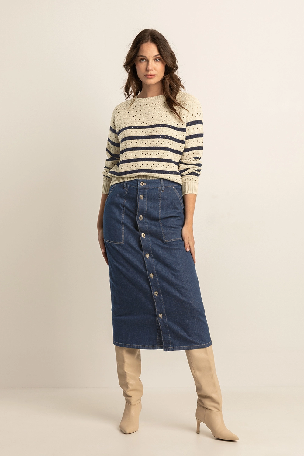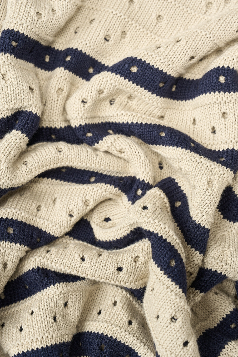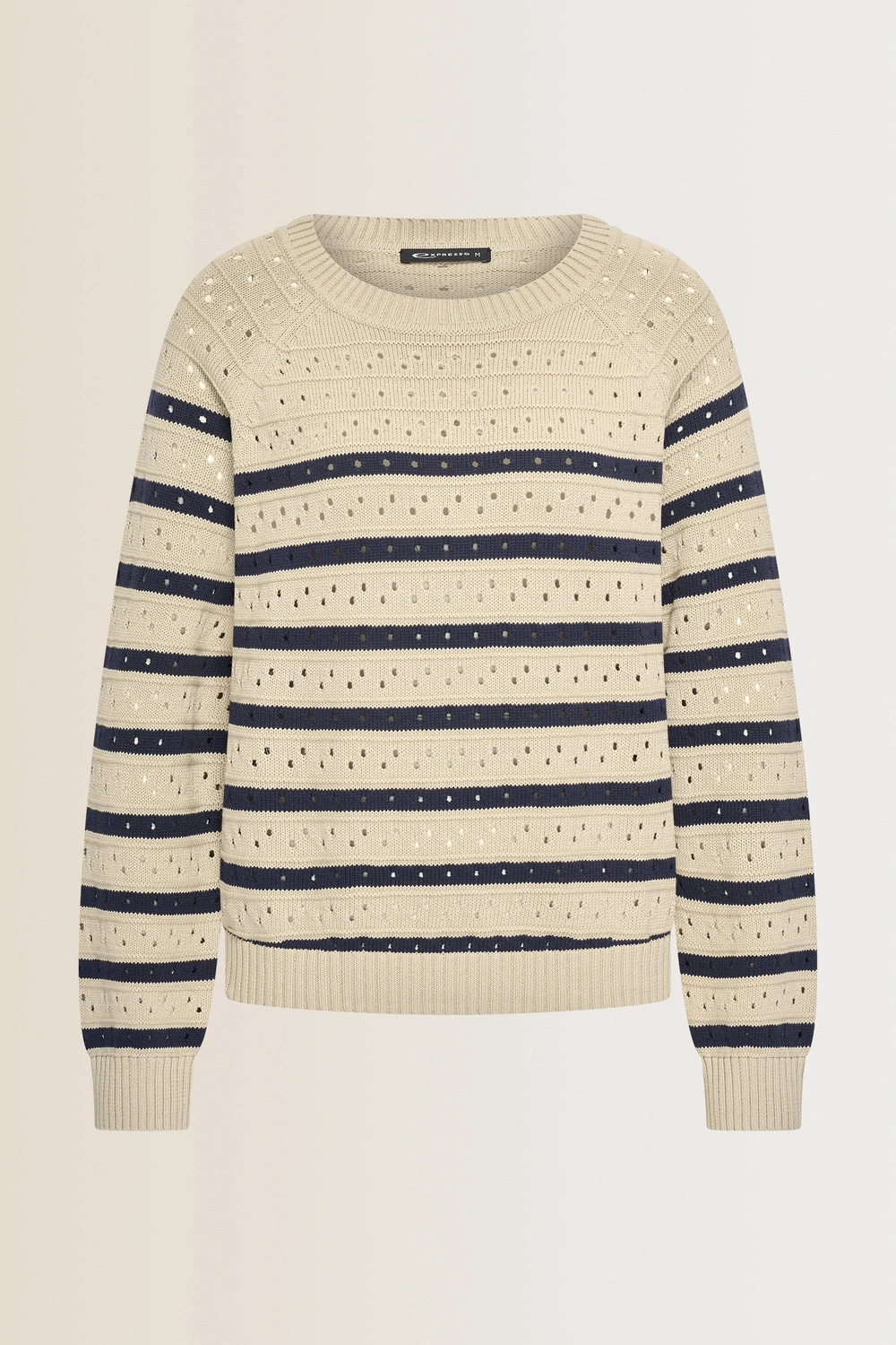 Beige pointelle gebreide trui met navy strepen – 100% katoen. Regular fit, ronde hals, lange mouwen met ribgebreide boorden. Deze luchtige trui heeft een speels gestreept patroon en voelt heerlijk comfortabel aan. Perfect voor de overgangsperiode of een frisse zomerdag. Tip: combineer met een high waist jeans en witte sneakers voor een casual en stijlvolle look.
