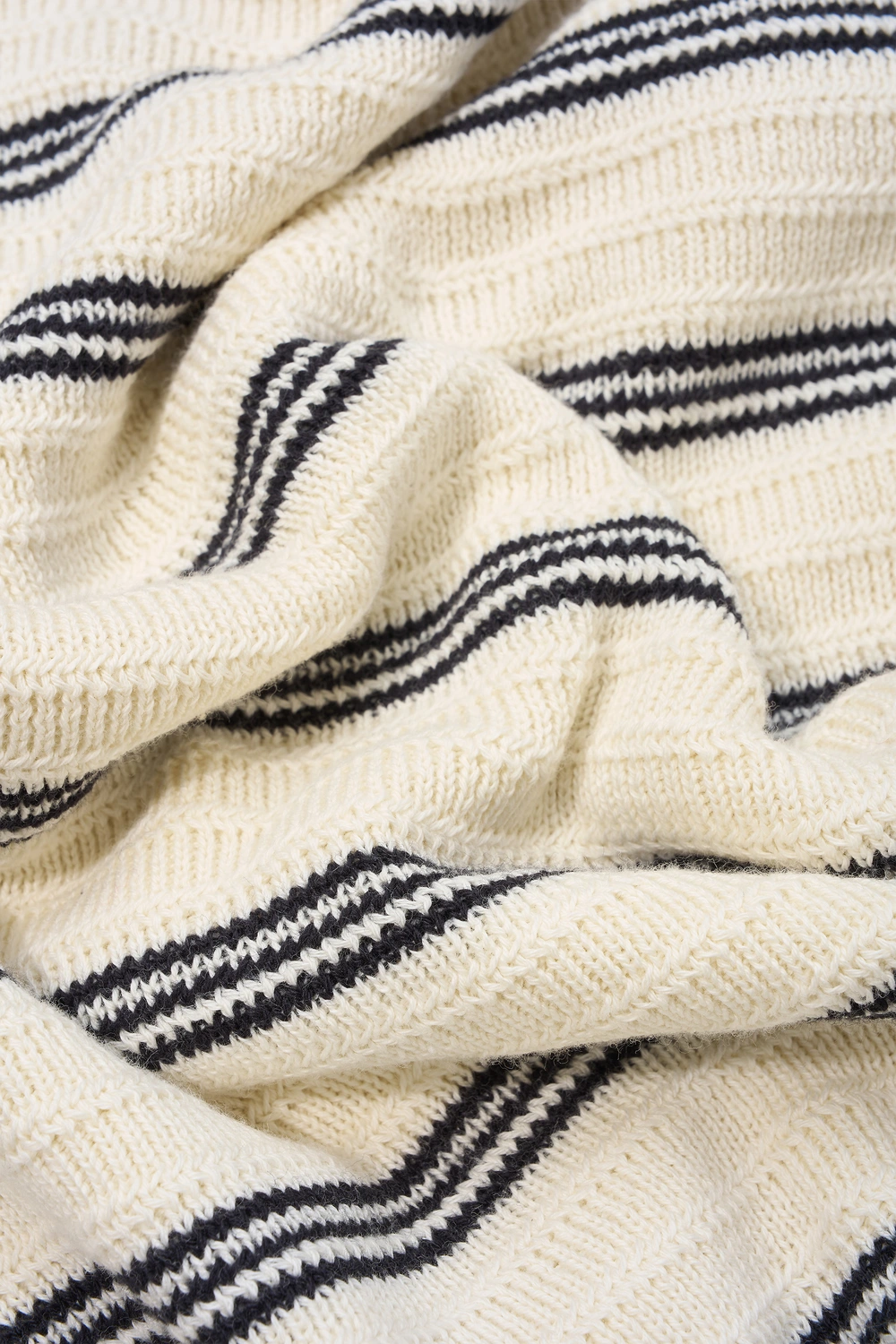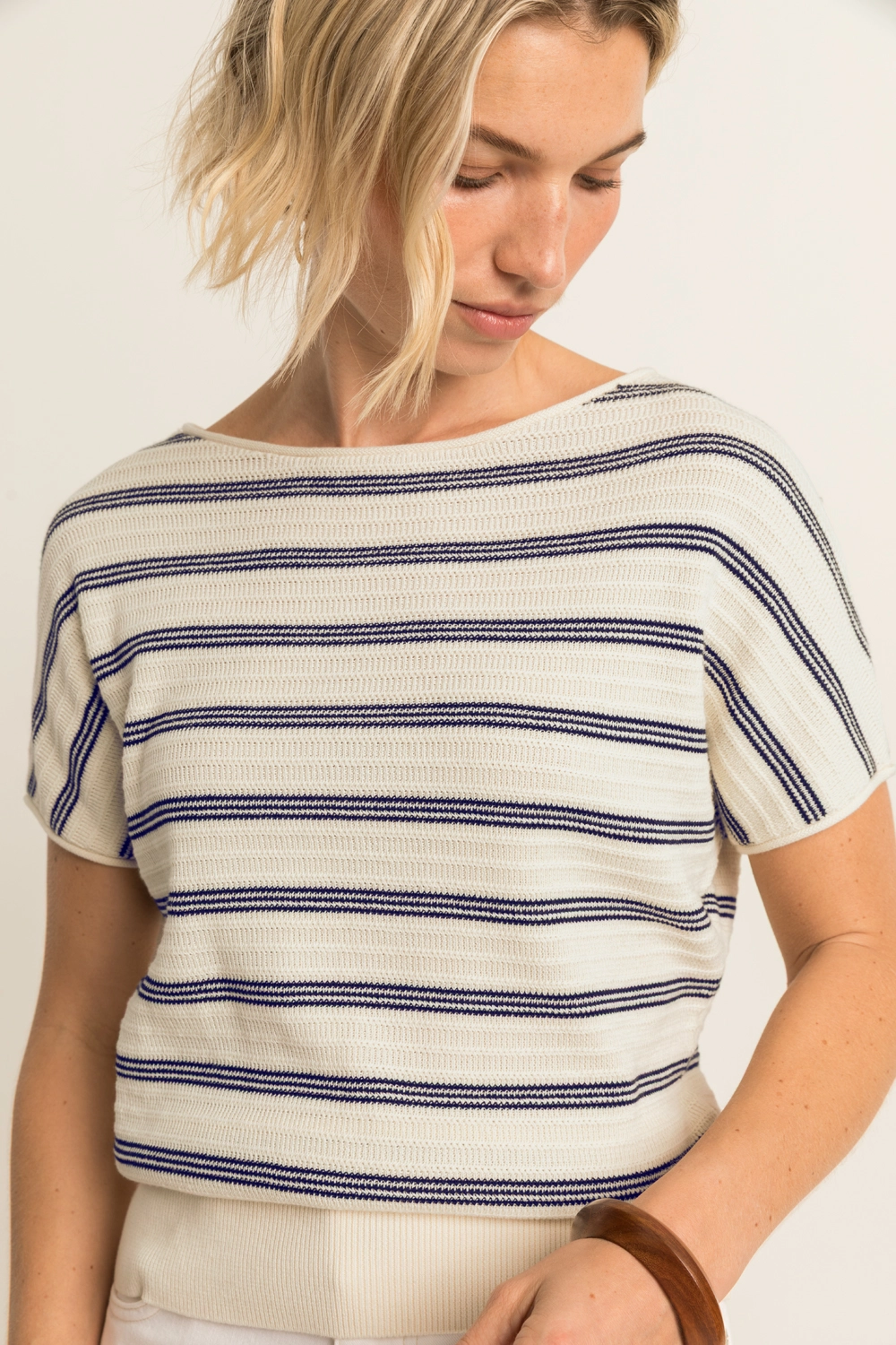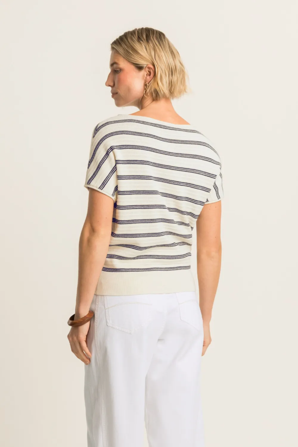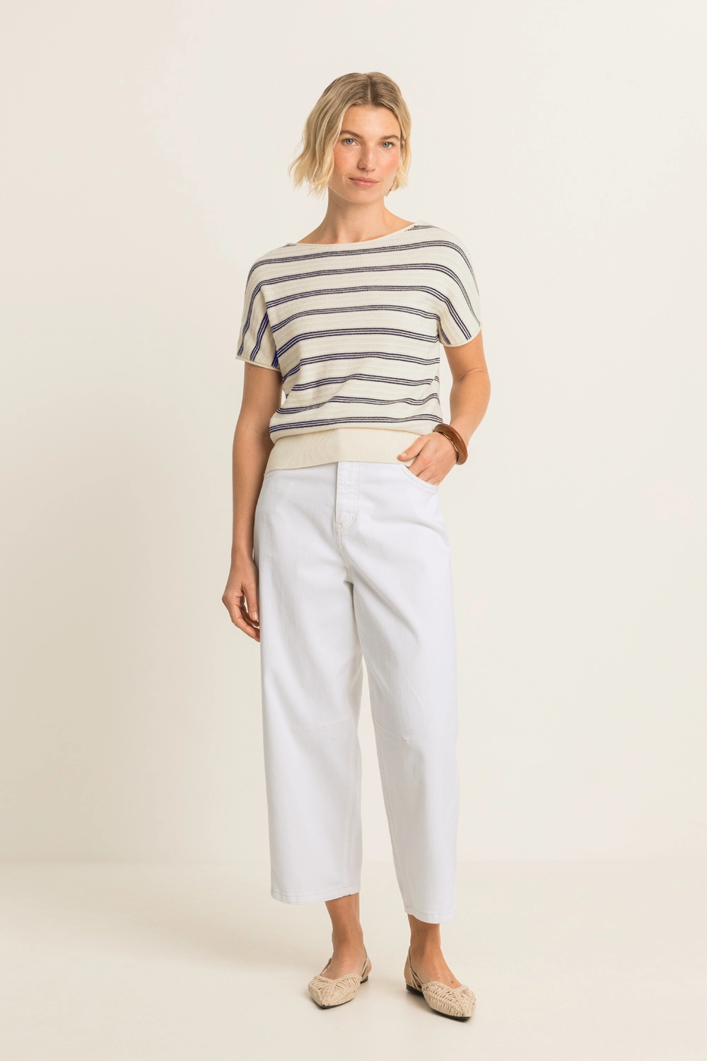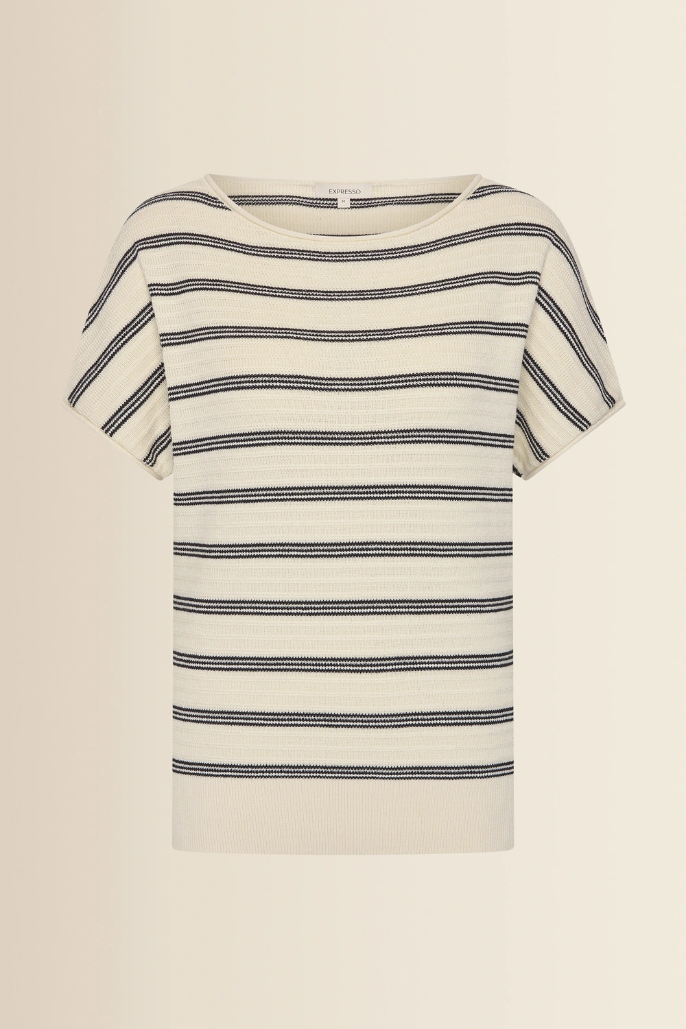 EX11-26820 Ecru fijngebreide trui met donkerblauwe strepen – soepel breisel met een subtiele structuur. Relaxed en rechtvallend, met een wijde ronde hals, korte mouwen en een brede aangesloten zoomboord. De smalle streep geeft deze trui een frisse, tijdloze uitstraling, terwijl het comfortabele breisel perfect is voor iedere dag. Een moeiteloos item dat direct verzorgd oogt en eindeloos combineert. Wijde ronde hals Korte mouwen Fijngebreide structuur Aangesloten zoomboord Lengte: (vanaf schouder) 60 cm bij maat M.