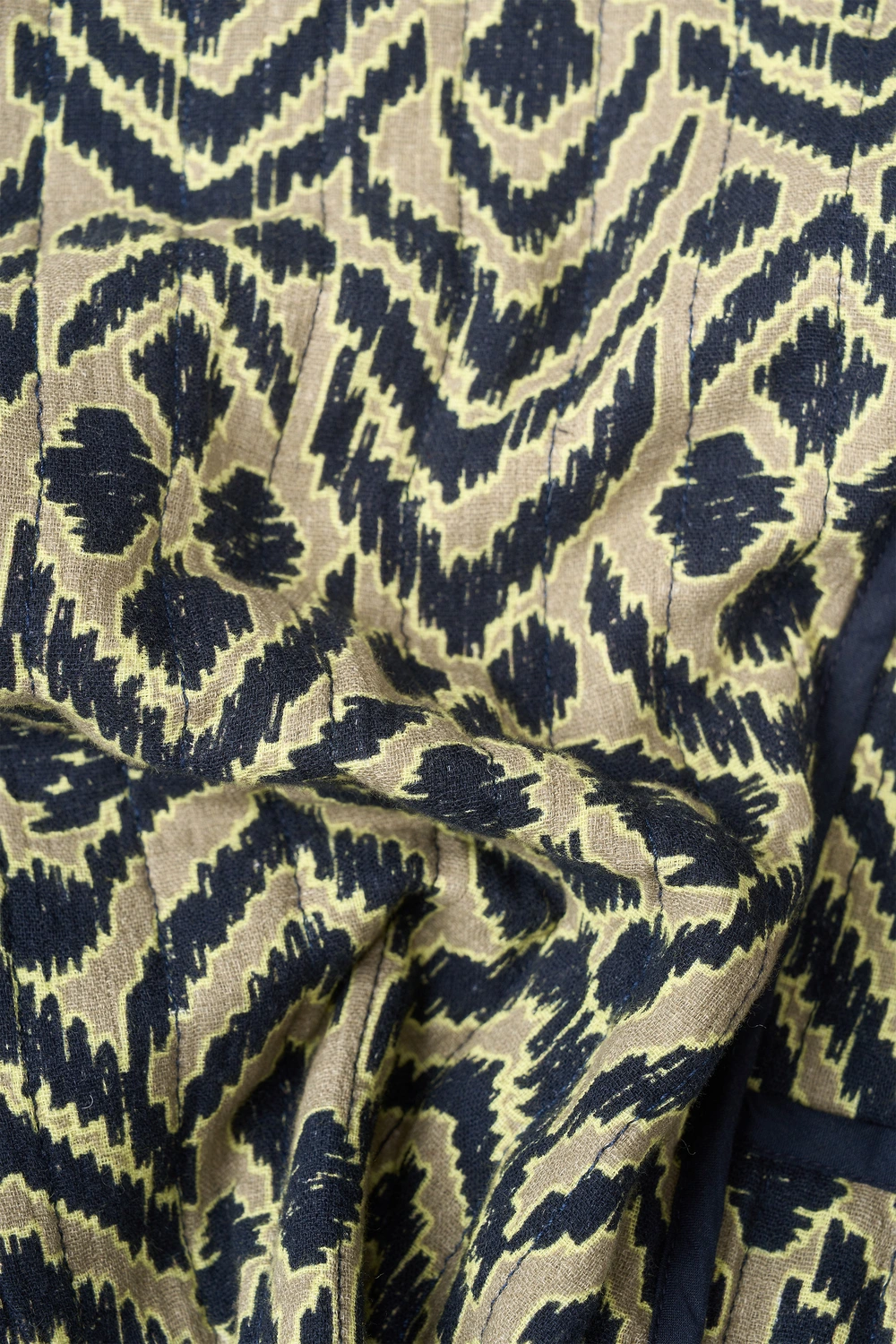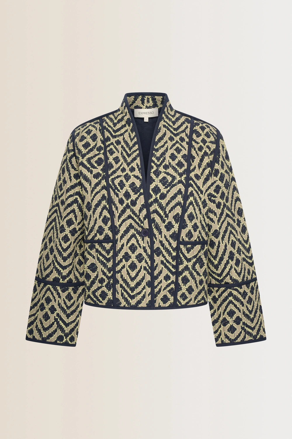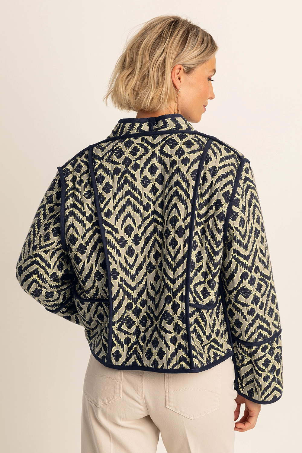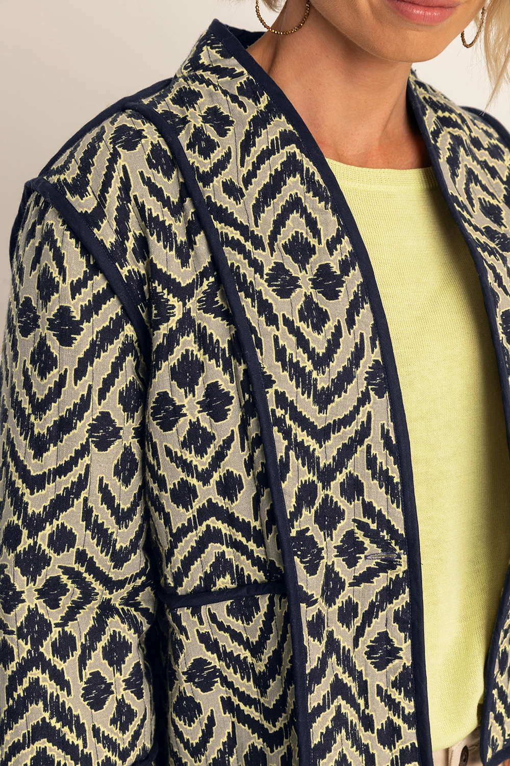 Gewatteerd jasje met print – katoenkwaliteit met structuur. Dit opvallende jasje in diepblauw en geelgroen is een echte statement piece. De rijke jacquardstructuur en de contrastbies geven het ontwerp een luxe uitstraling. Het jasje sluit met één knoop en heeft een recht, iets boxy silhouet. Perfect over een effen top of jurk voor een stijlvolle boho-chic look.