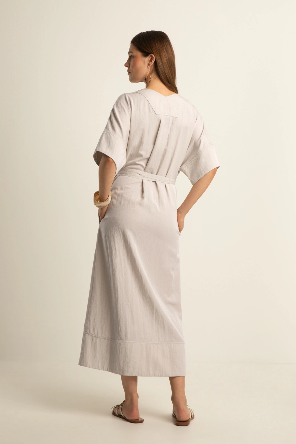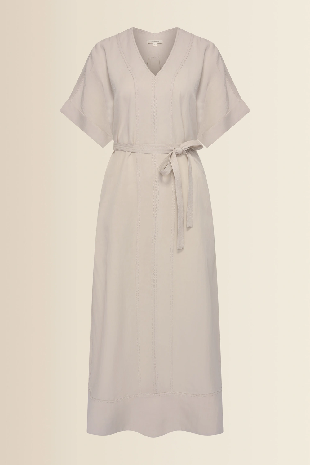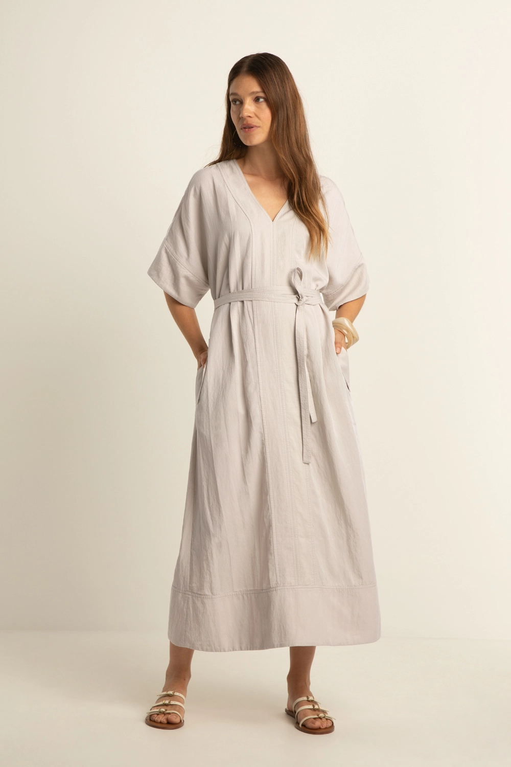 Geweven jurk – luchtige, soepelvallende kwaliteit met een subtiele structuur. Losvallend en vrouwelijk, met een V-hals, korte aangeknipte mouwen en een strikceintuur in de taille. De zachte zandkleur en verfijnde belijning geven deze jurk een rustige, elegante uitstraling, terwijl de lange lengte zorgt voor een moeiteloos stijlvolle look. Een veelzijdig item dat prettig draagt en perfect is voor warme dagen.
