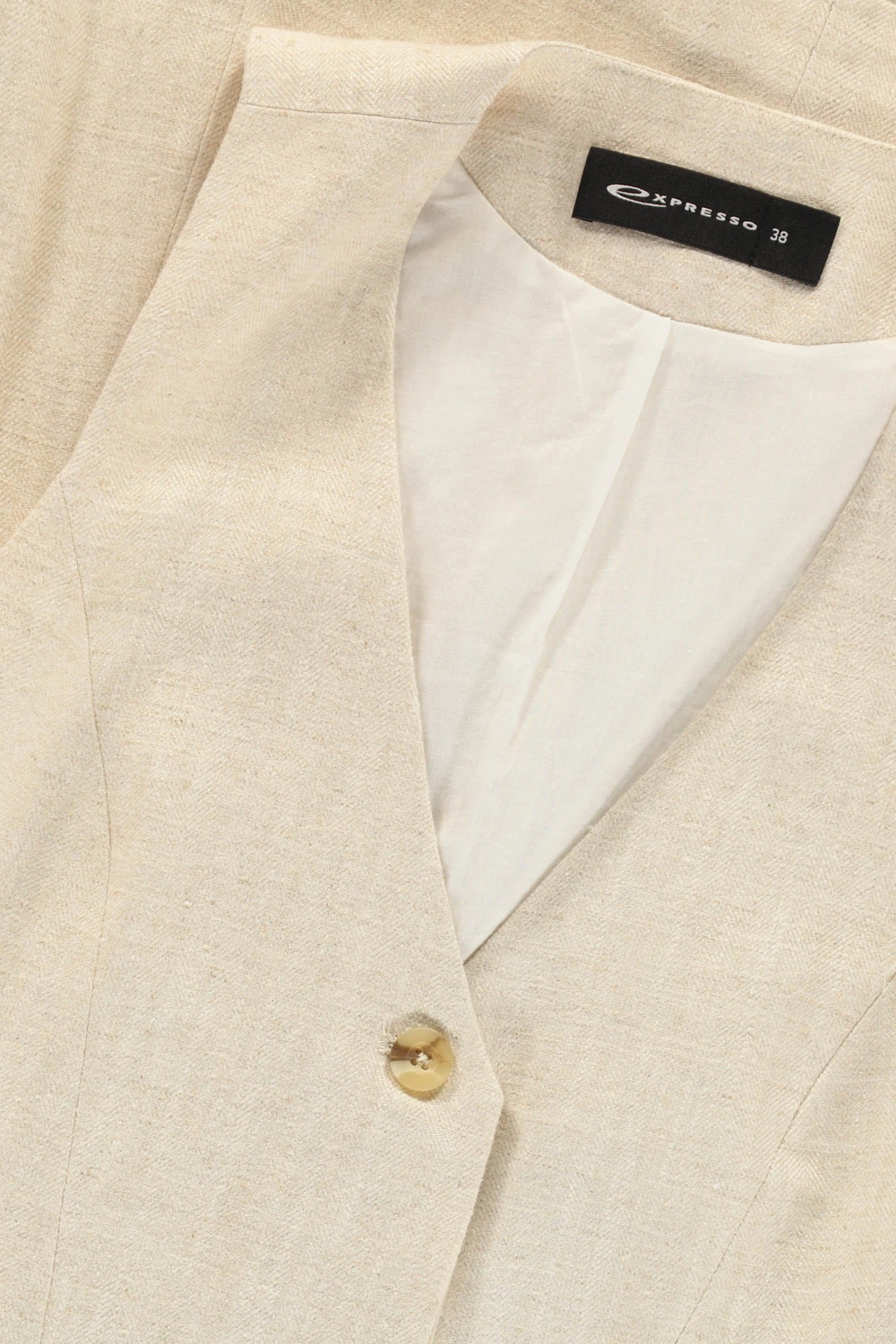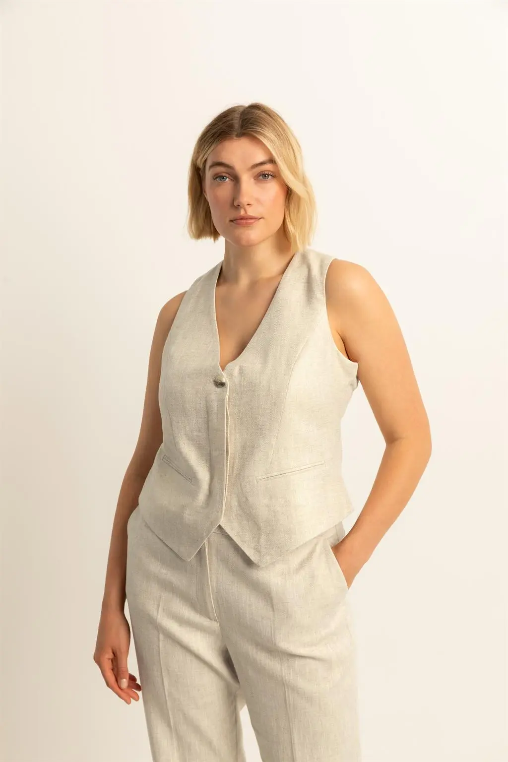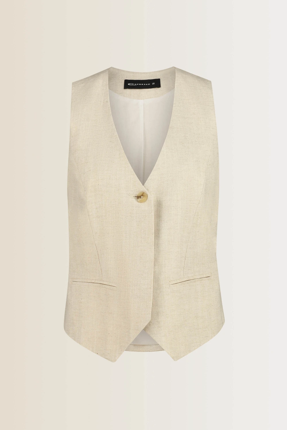Naturelkleurig gilet – katoen & linnen. Getailleerd, (deels blinde) knoopsluiting, lengte tussen taille en heup. Licht gemêleerde natureltint, subtiele visgraatstructuur. Geef elke outfit een smart-casual touch met deze trendy musthave. Tip: maak je summer in the city-look compleet met de bijpassende broek en blazer.