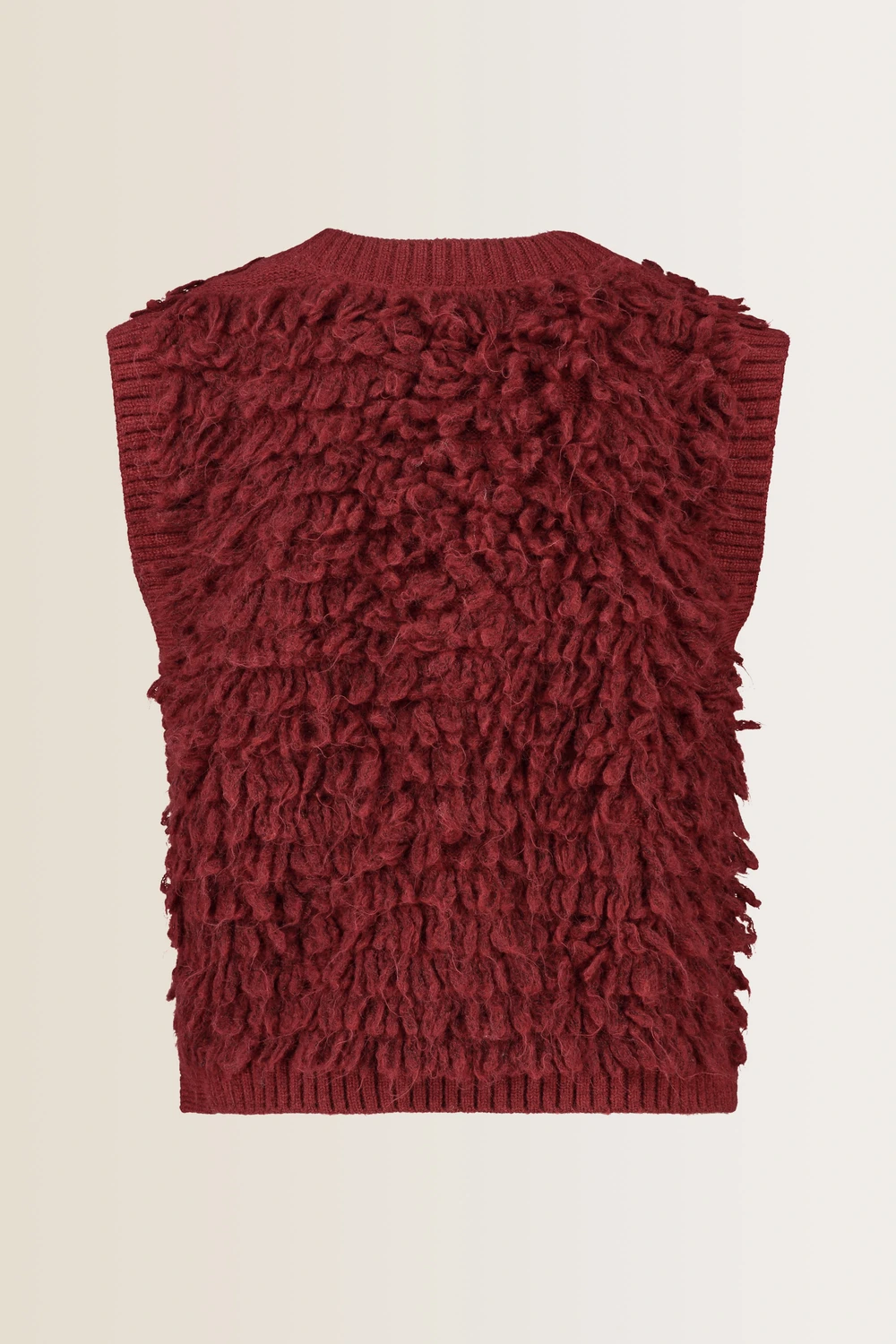 Wijnrood mouwloos vest – wolmix. Recht & relaxed, openvallend ontwerp, lengte tot het heupbot. Zacht en wollig, gebreide lussenstructuur. Ideaal voor het najaar: hét seizoen voor gelaagde looks. Tip: met dit boxy silhouet ‘shape’ je een ruimvallende blouse of jurk.