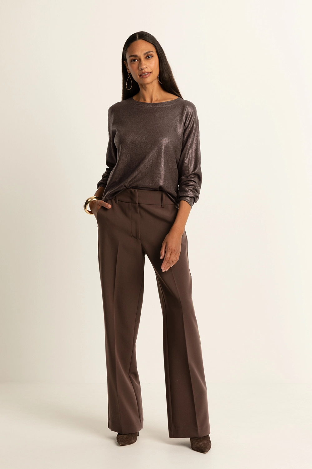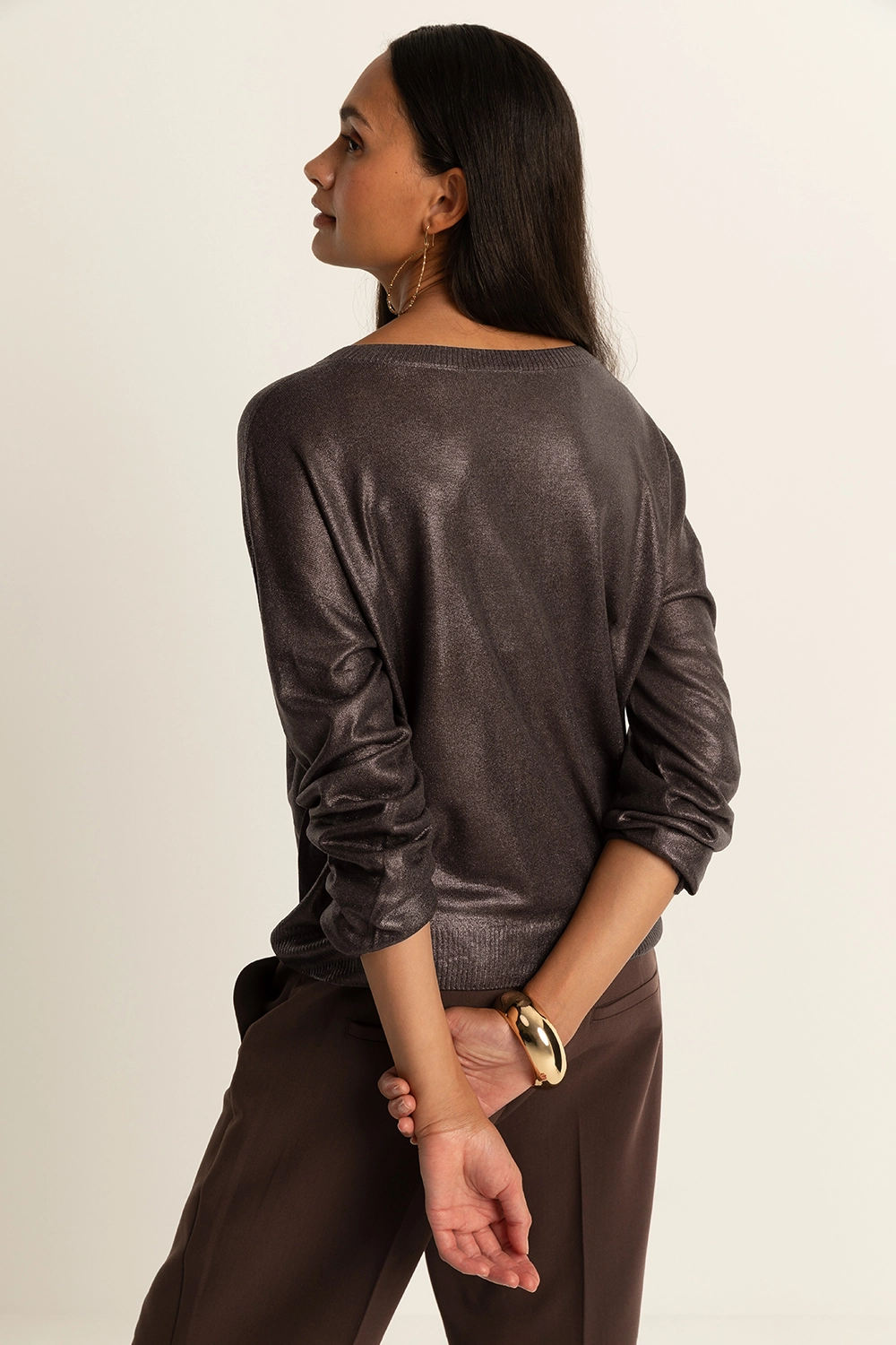 Bruine trui met coating– viscoseblend met subtiele metallic glans. Relaxed fit met ronde hals en lange mouwen. De lichte glans geeft deze trui een feestelijke touch, terwijl de soepele stof zorgt voor ultiem draagcomfort. Een veelzijdige trui die moeiteloos van dag naar avond te stylen is.