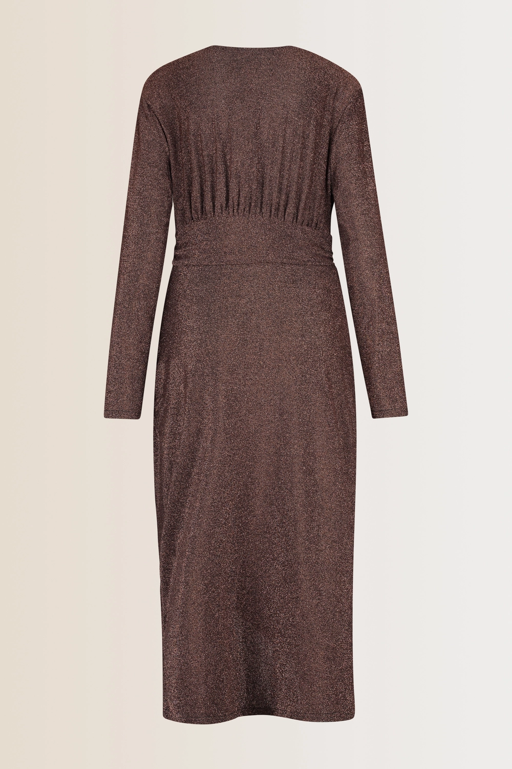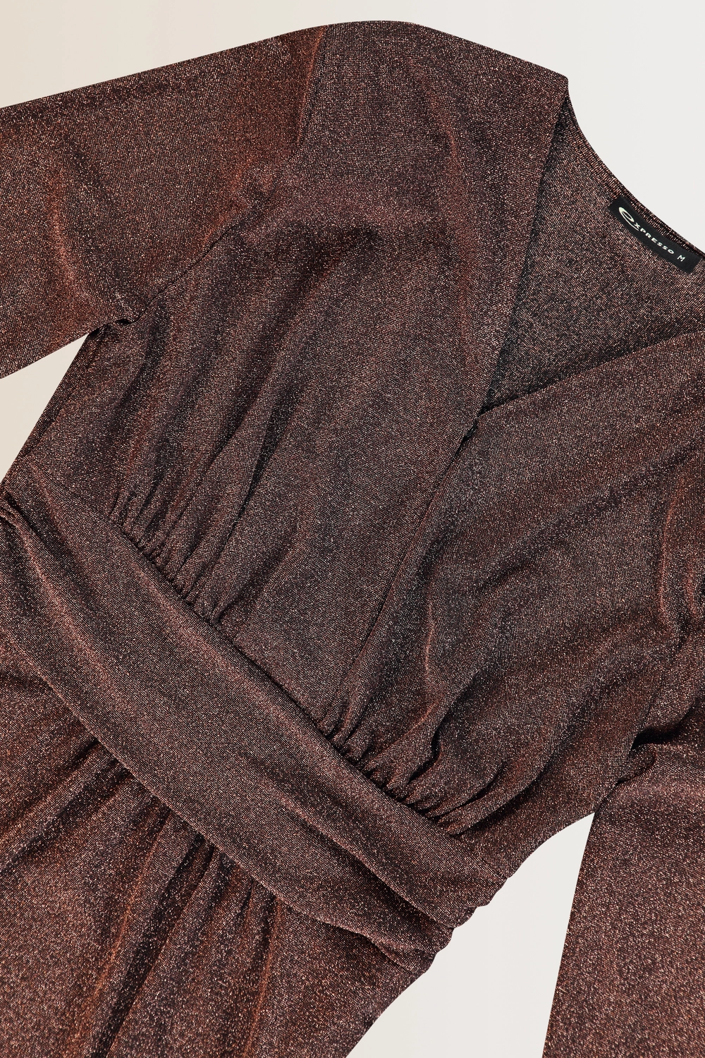 Glitterjurk met overslagdetail– stretchblend met lurex. Vrouwelijk aangesloten model met overslagdetail en brede tailleband die elegant de nadruk legt op het silhouet. De lange mouwen en subtiele plooien zorgen voor een flatterende fit, terwijl de metallic glans de jurk een feestelijke, moderne uitstraling geeft. Perfect voor een avond uit of speciale gelegenheid.