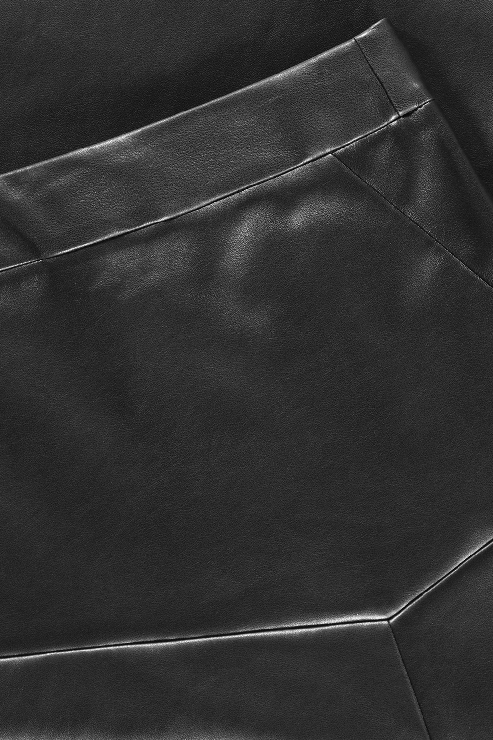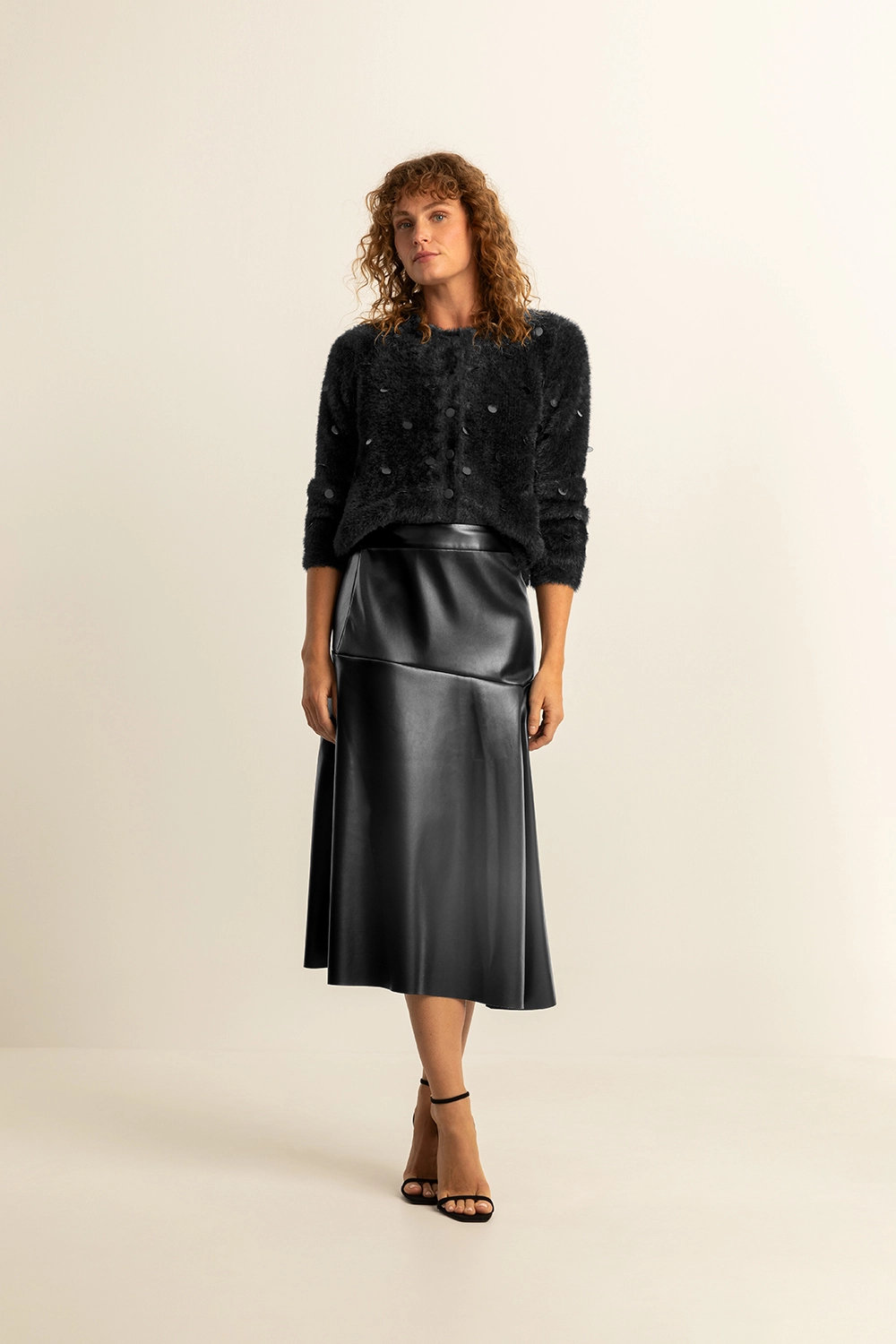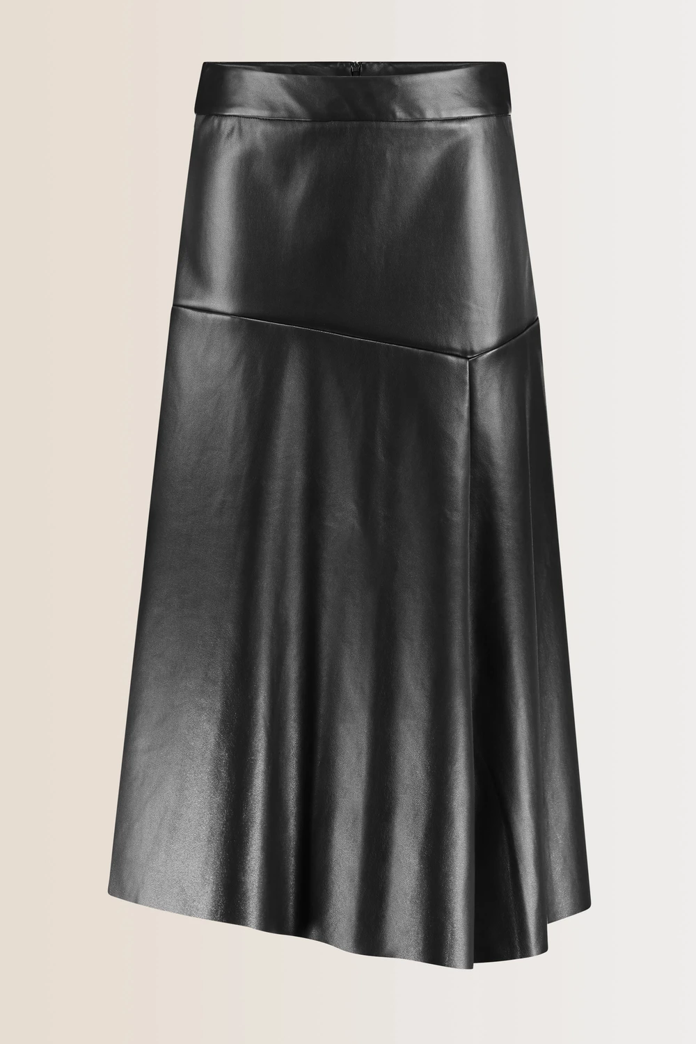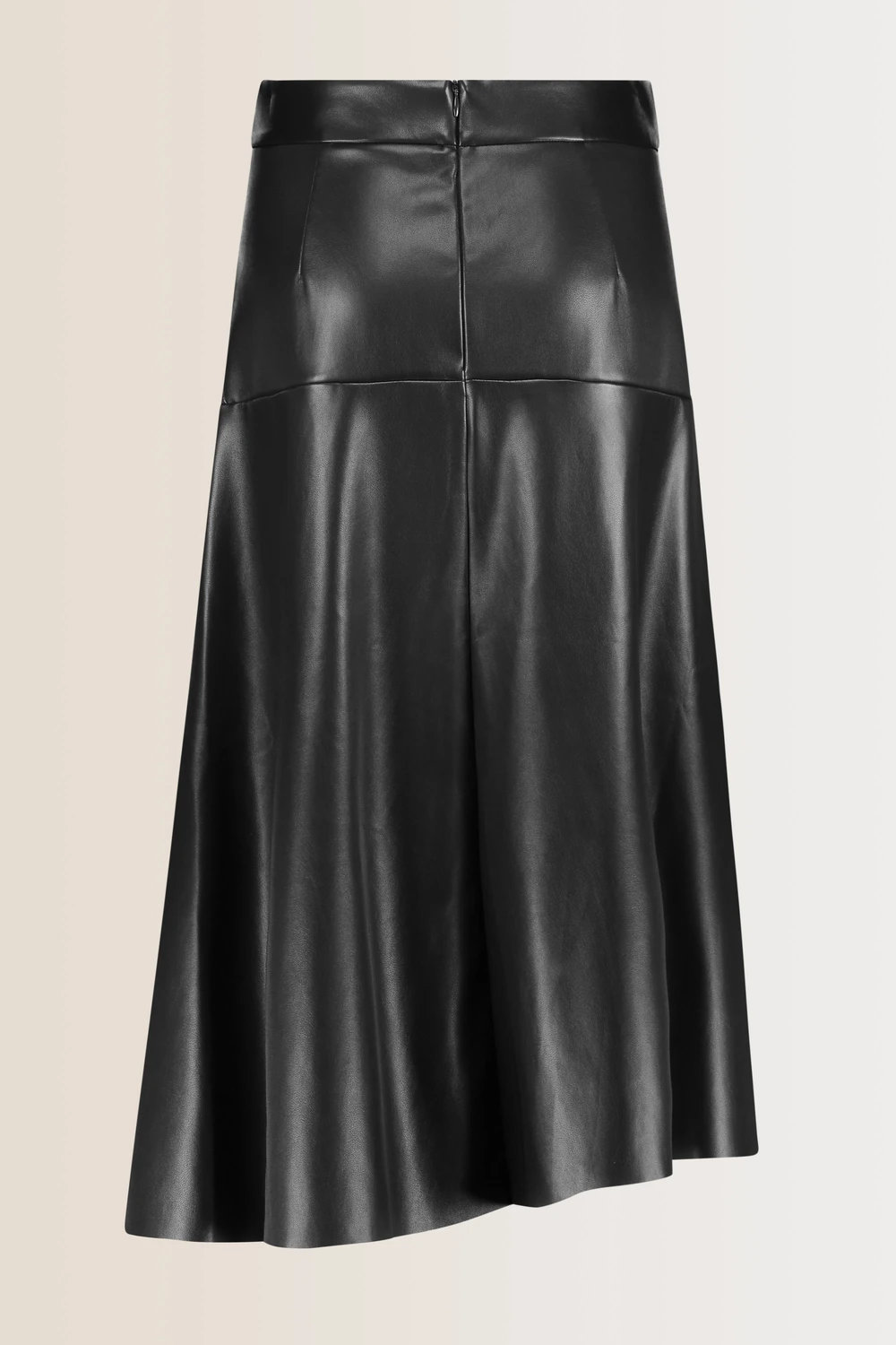 Zwarte a-lijn rok – soepel imitatieleer. Middelhoge taille met ritssluiting aan de achterkant. Dit tijdloze ontwerp benadrukt de taille en valt elegant over de knie. De zachte glans van het imitatieleer geeft elke outfit een stijlvolle touch, ideaal voor zowel overdag als avond.