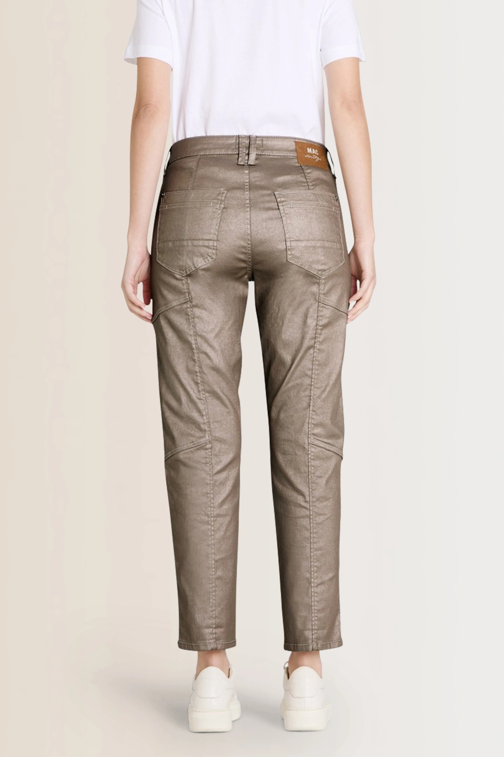 Goudkleurige broek in model 'Iowa' van MAC – Slim fit met een hoge taille en rechte pijpen. De opvallende contraststiksels en grote opgestikte zakken geven deze jeans een eigentijdse utility-look. Ideaal voor een casual stijl met een modieuze twist. Draag opgerold met sneakers of combineer met een blouse en hakken voor een verfijnd silhouet.