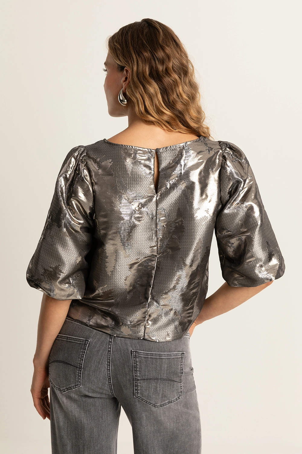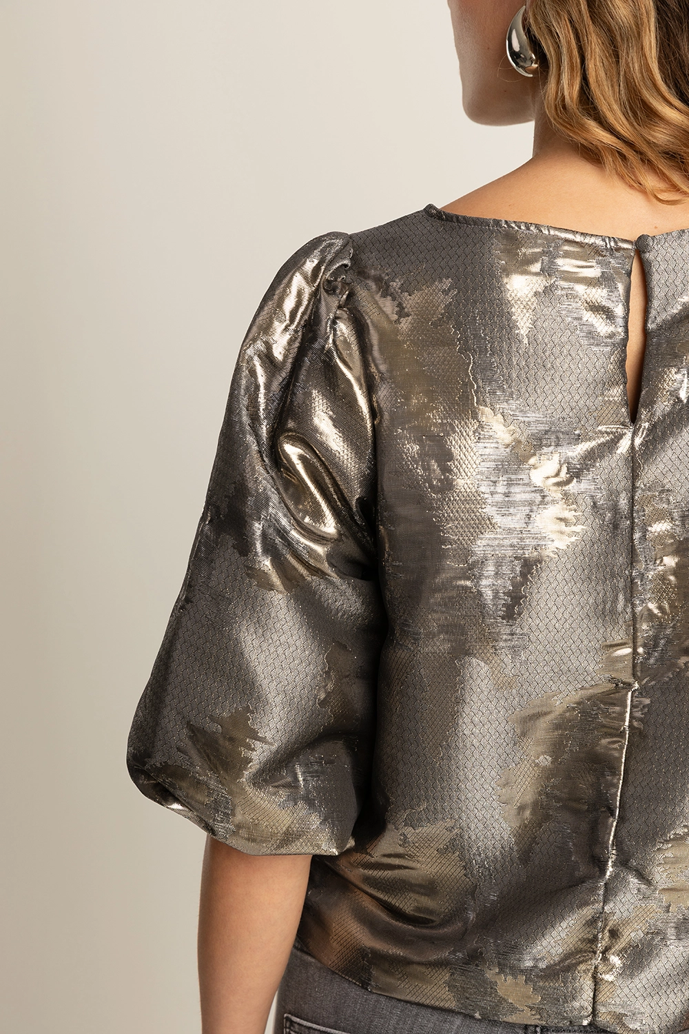 Glanzende blouse – jacquard geweven met metallic glans. De gestructureerde stof met subtiel abstract dessin zorgt voor een luxe uitstraling. De rechte pasvorm, ronde hals en licht gepofte mouwen geven de top een moderne, vrouwelijke look. Ideaal voor feestelijke momenten – draag met een gecoate broek of stijlvolle rok voor een chique avondoutfit.