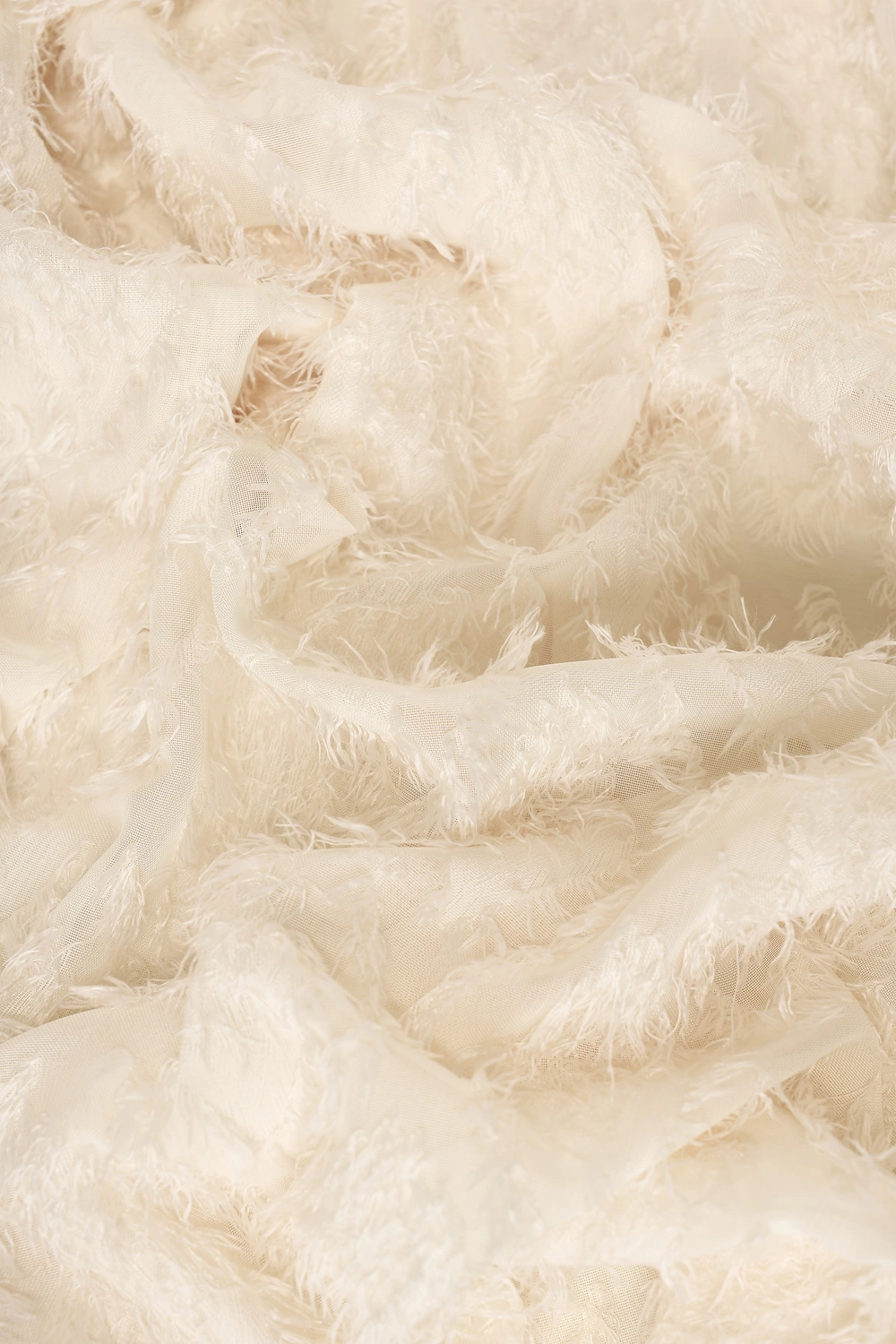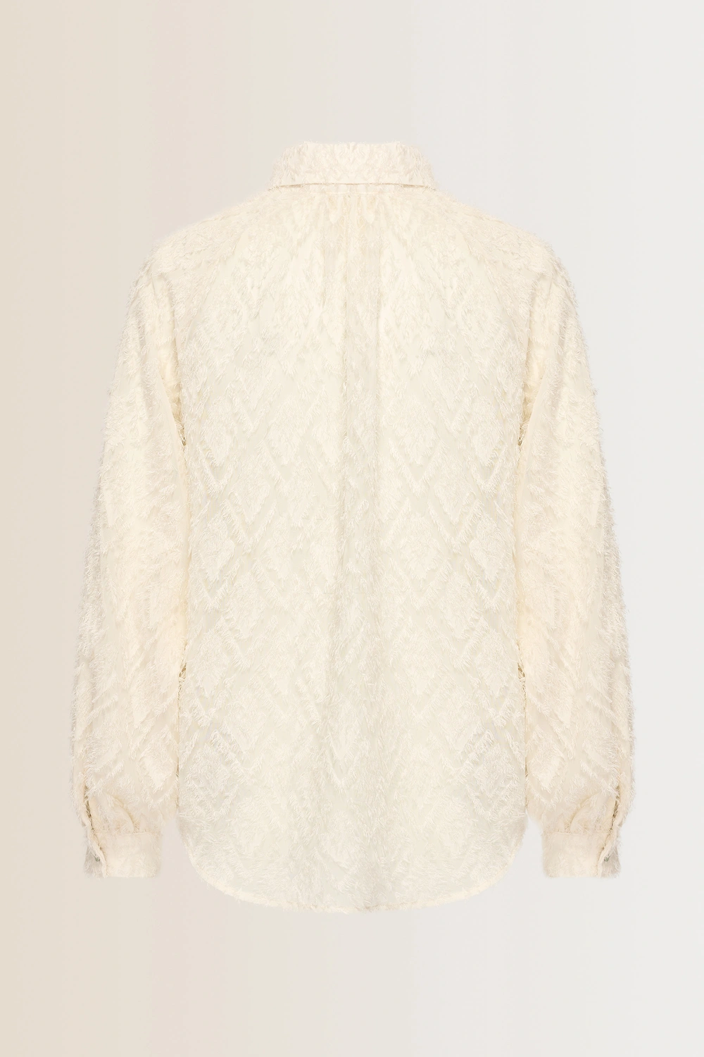Off-white blouse – subtiel transparante stof met een jacquard ingeweven ruitmotief en zachte franjestructuur. Recht en licht bloezend model met lange ballonmouwen en een klassieke kraag. De glans van de stof en het verfijnde reliëf geven deze blouse een luxueuze, vrouwelijke uitstraling. Mooi om te dragen op een jeans voor een casual chic look, of gecombineerd met een rok voor een elegante gelegenheid.