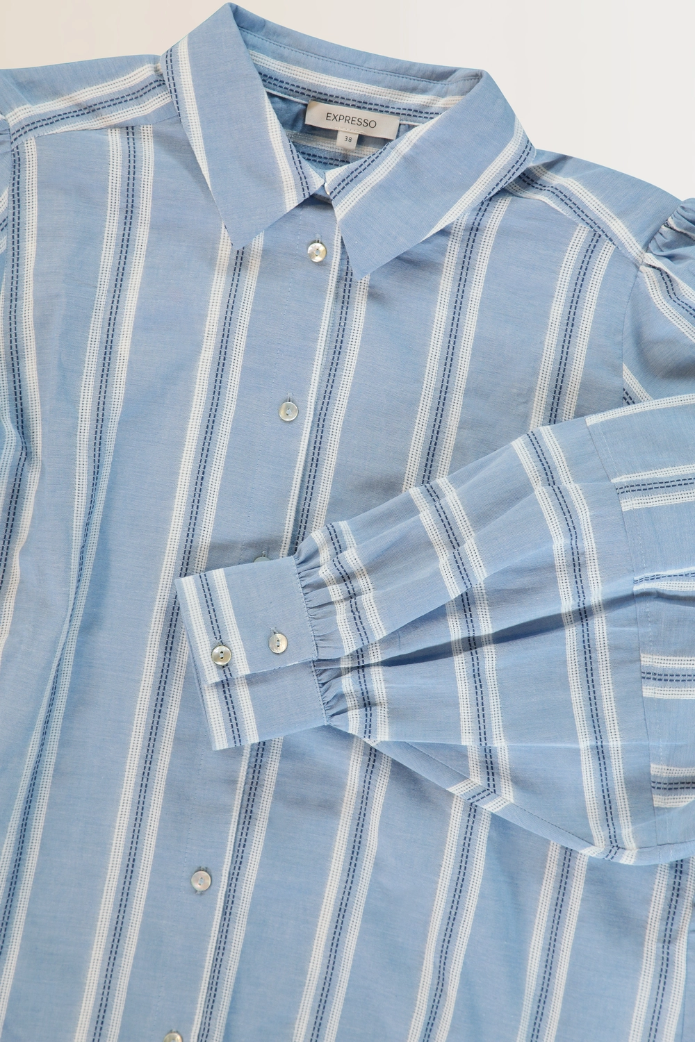 Lichtblauwe gestreepte blouse – luchtige katoenmix met jaqcuard strepen. Recht en comfortabel vallend, met een klassieke kraag, knoopsluiting en vrouwelijke ballonmouwen. De subtiele streep geeft deze blouse een frisse, eigentijdse uitstraling, terwijl de volumineuze mouwen zorgen voor een expressief silhouet.