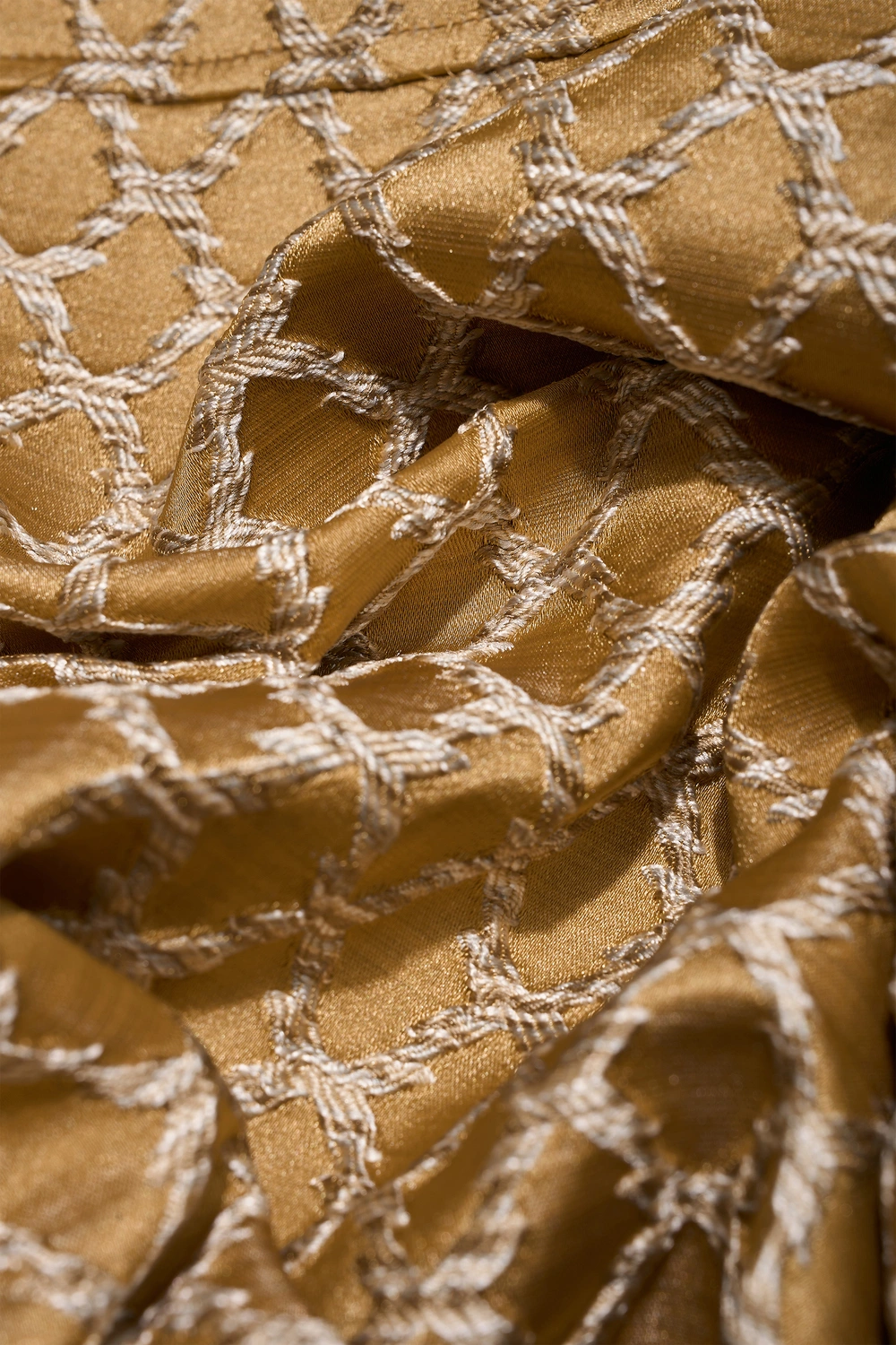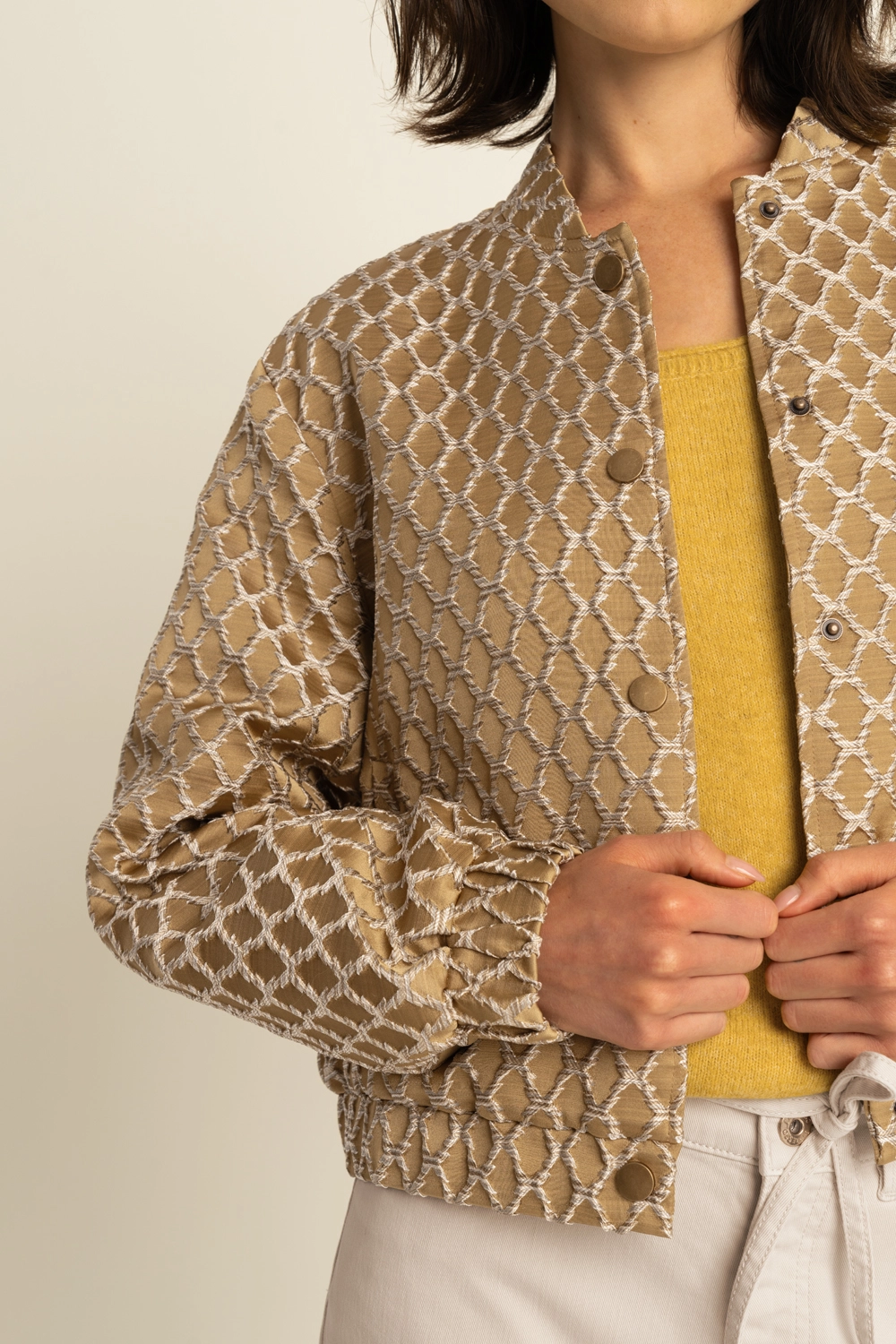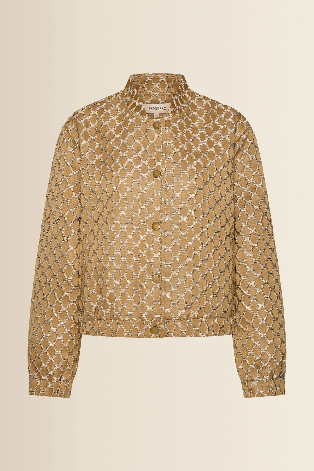 Okerkleurig jasje – jacquarddessin. Dit statement jasje is uitgevoerd met een opstaande kraag en een drukknoopsluiting, wat zorgt voor een moderne, cleane uitstraling. De rijke structuur van de stof en de subtiele glans geven het item een expressief en verfijnd karakter. Dankzij de kortere lengte en rechte pasvorm is dit jasje perfect om te dragen over een top of trui voor een eigentijdse, stijlvolle look.
