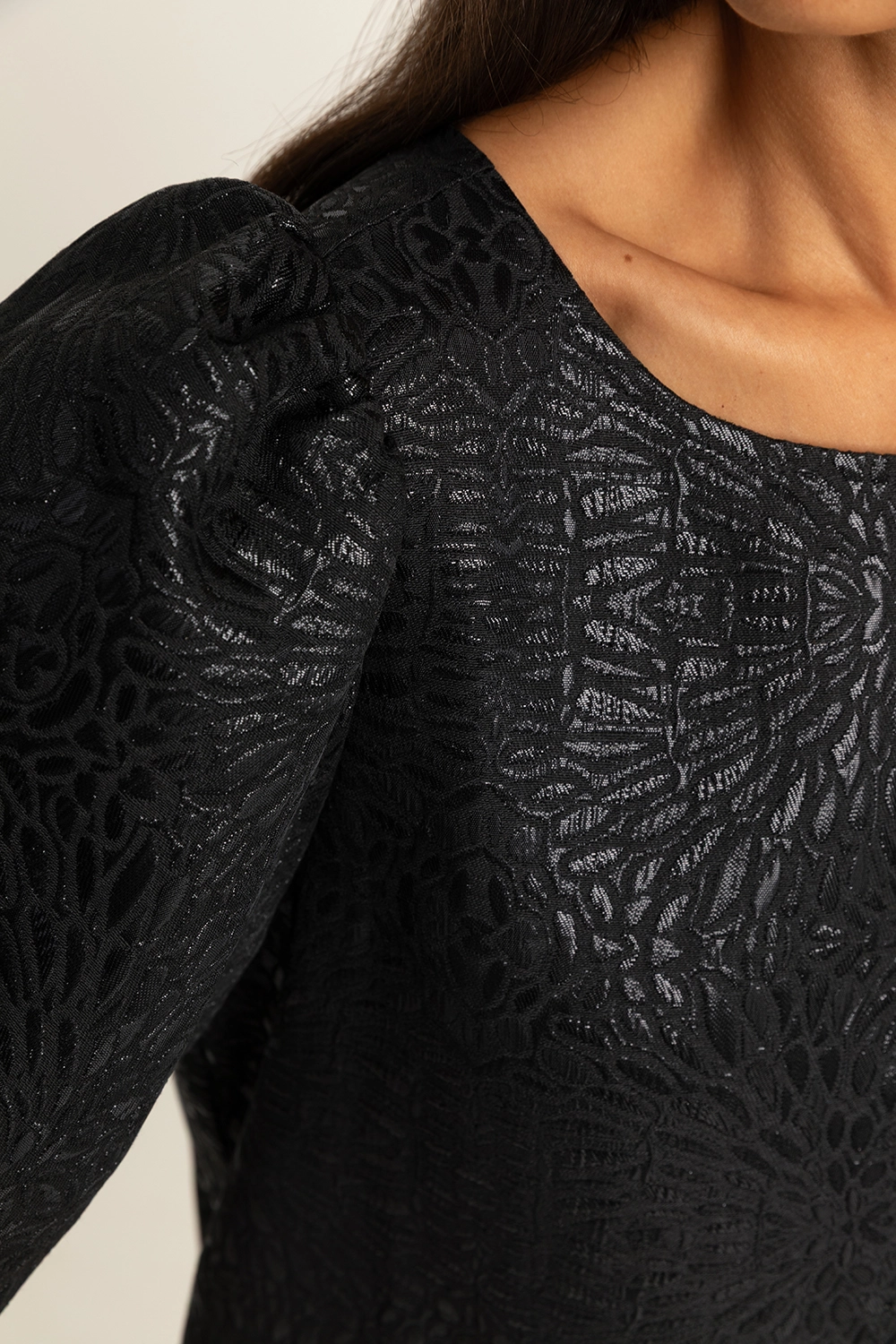 Zwarte jacquard top – subtiel glanzende structuur met bloemmotief. Deze elegante top heeft korte pofmouwen en een rechte pasvorm die soepel langs het lichaam valt. De striksluiting op de rug zorgt voor een vrouwelijke finishing touch. De luxueuze stof met glanzend reliëf geeft elke look een feestelijke uitstraling – perfect voor stijlvolle avonden of chique gelegenheden.