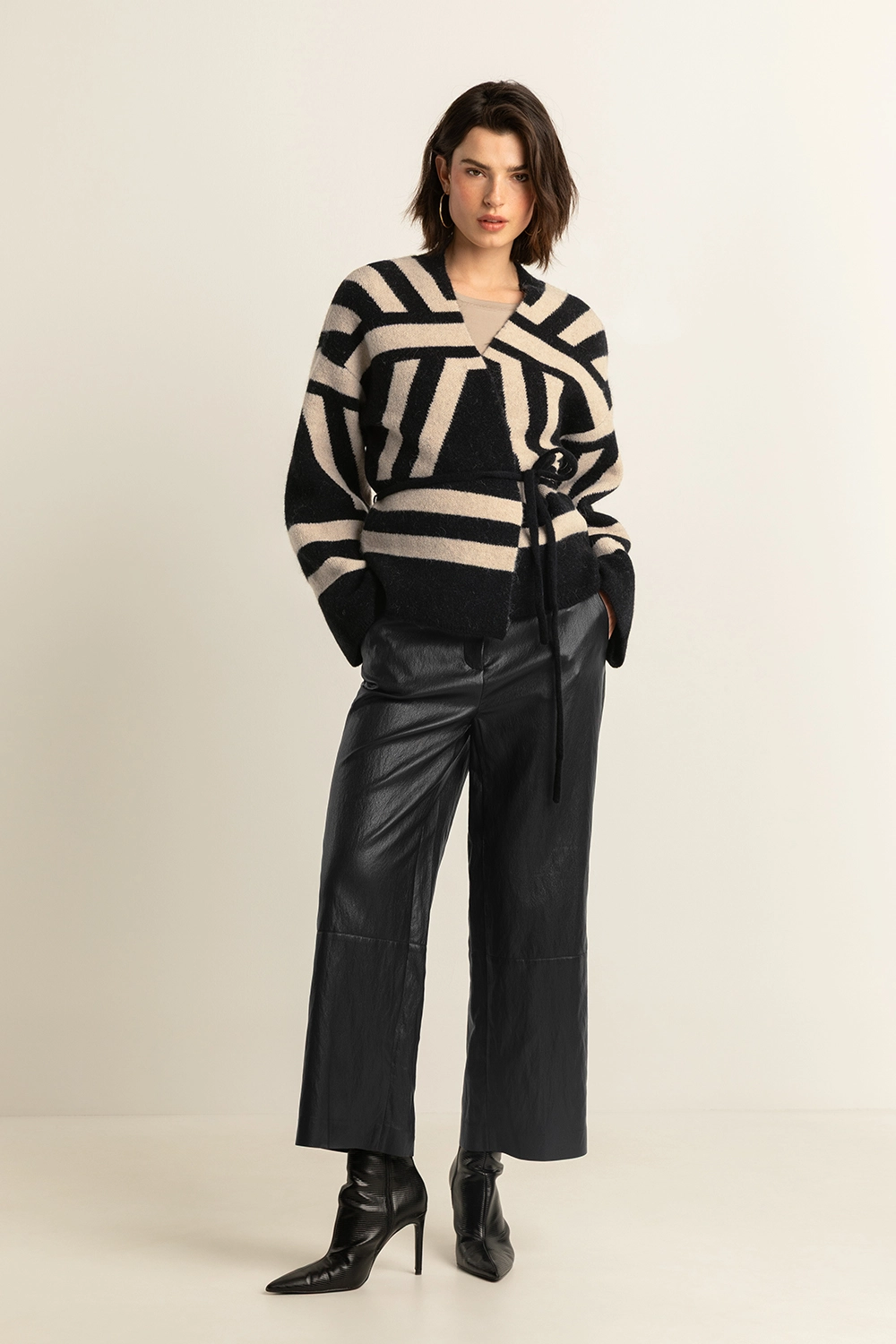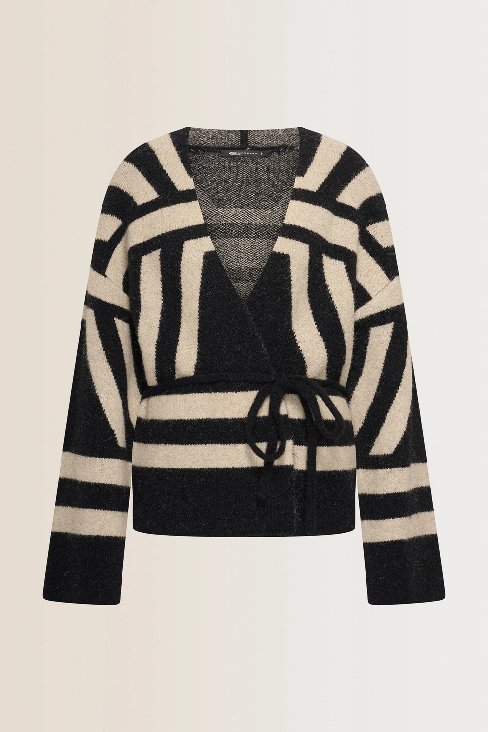 Zwart vest met zandkleurig dessin – zachte wolmix met alpaca. Opvallend jacquardpatroon met grafische lijnen in een stijlvolle wrapvorm. De striksluiting in de taille accentueert het silhouet op een subtiele manier. Zacht, warm en statement tegelijk – perfect over een zwarte top of jurk voor een moderne, elegante look.
