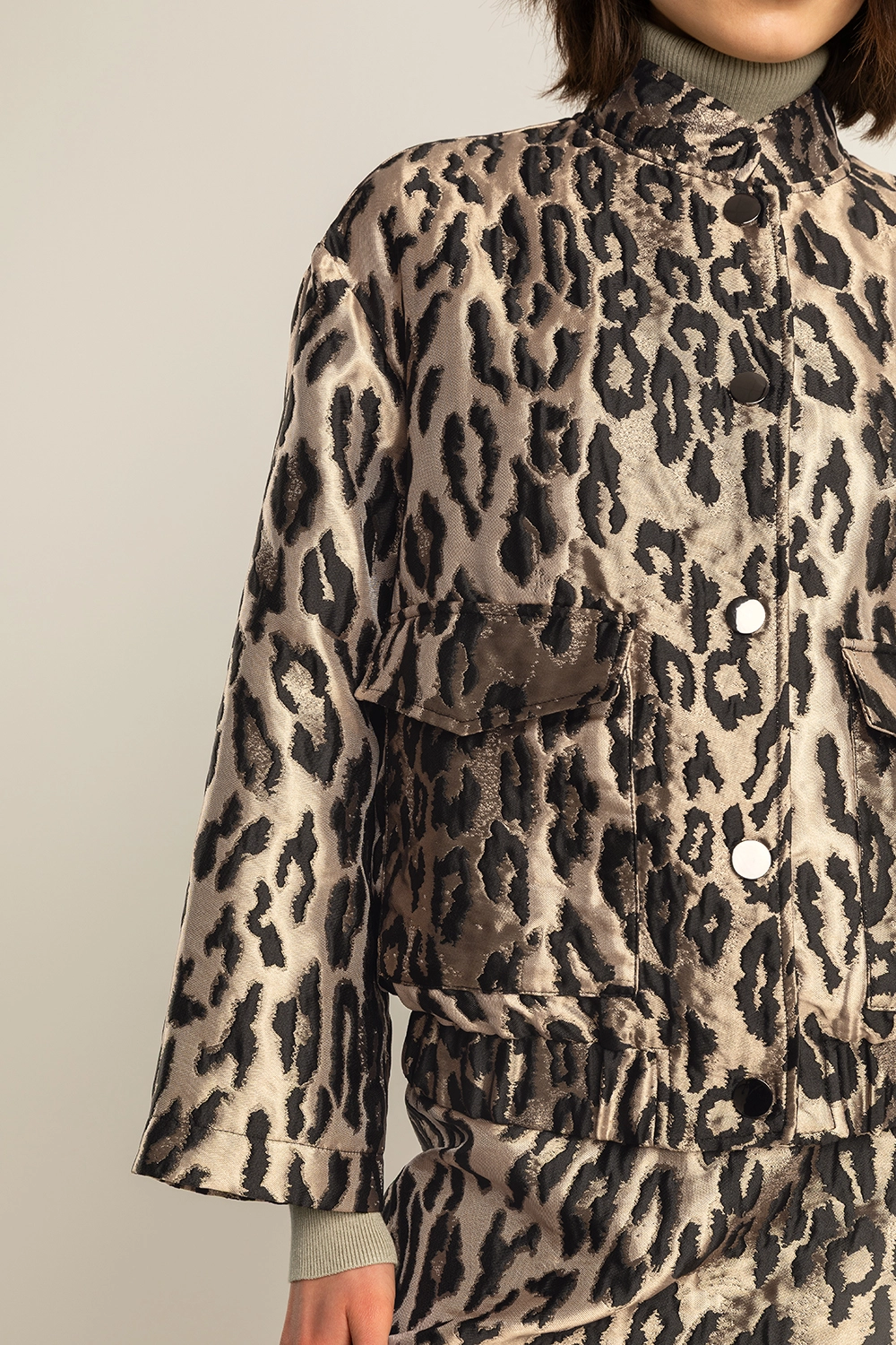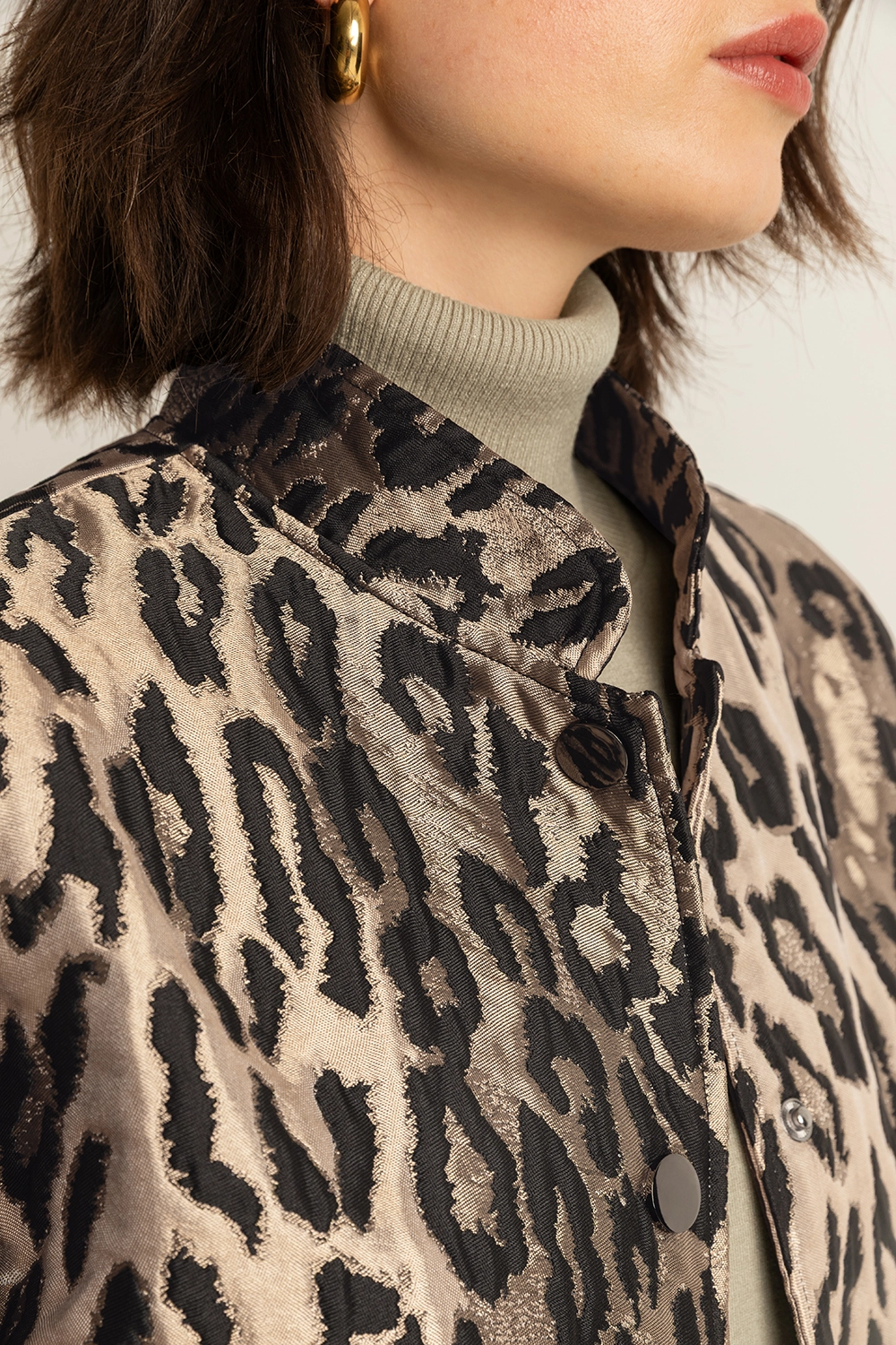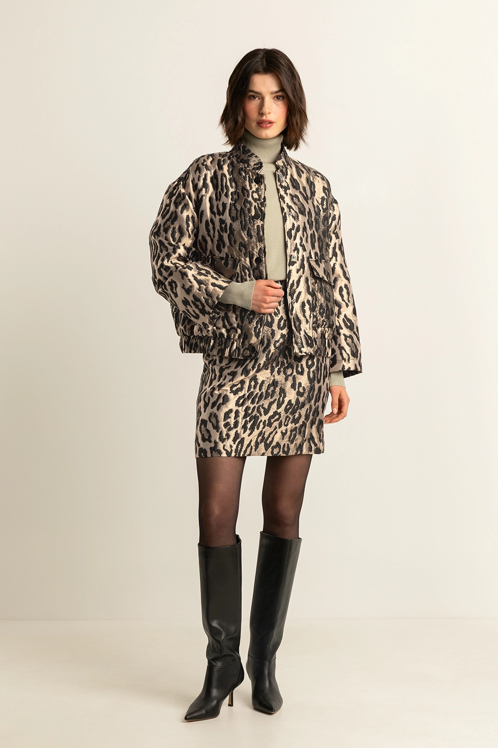 Zwarte leopard jas – jacquard met satijnglans. Stoer, vrouwelijk en statement in één. Deze korte jas in een luxueuze luipaardjacquard combineert een subtiele glans met een krachtige print. De opstaande kraag en ruime klepzakken geven een moderne utility-look, terwijl de elastische zoom zorgt voor een speelse, blousende pasvorm. Perfect over een satijnen top of strakke broek voor een eigentijdse partylook.