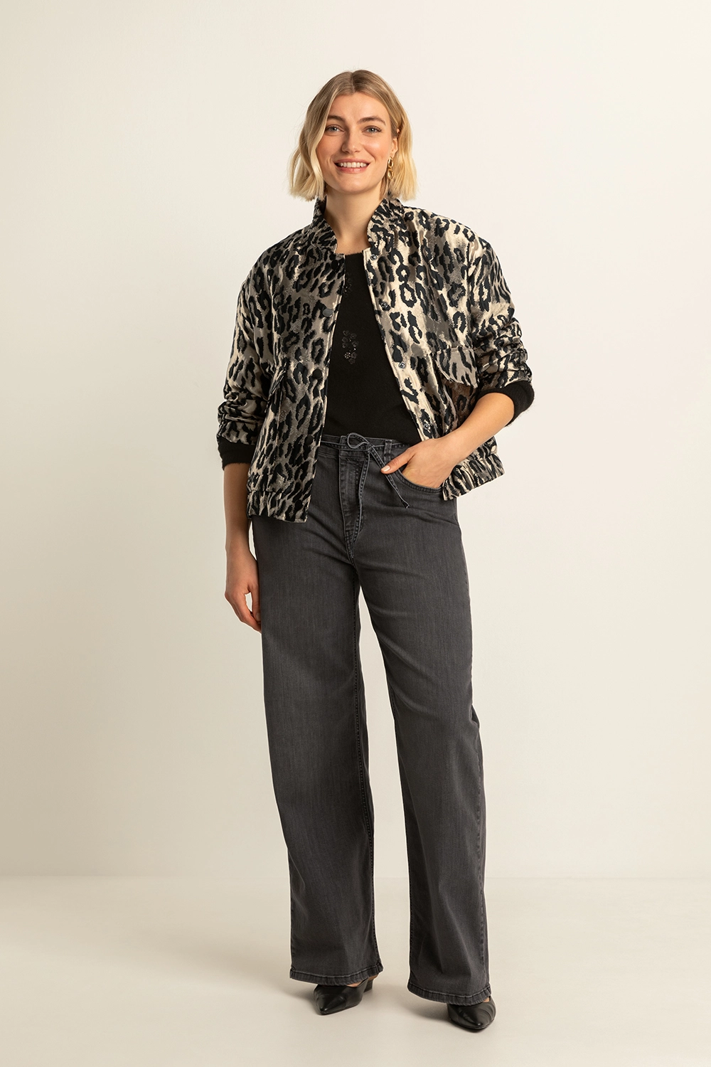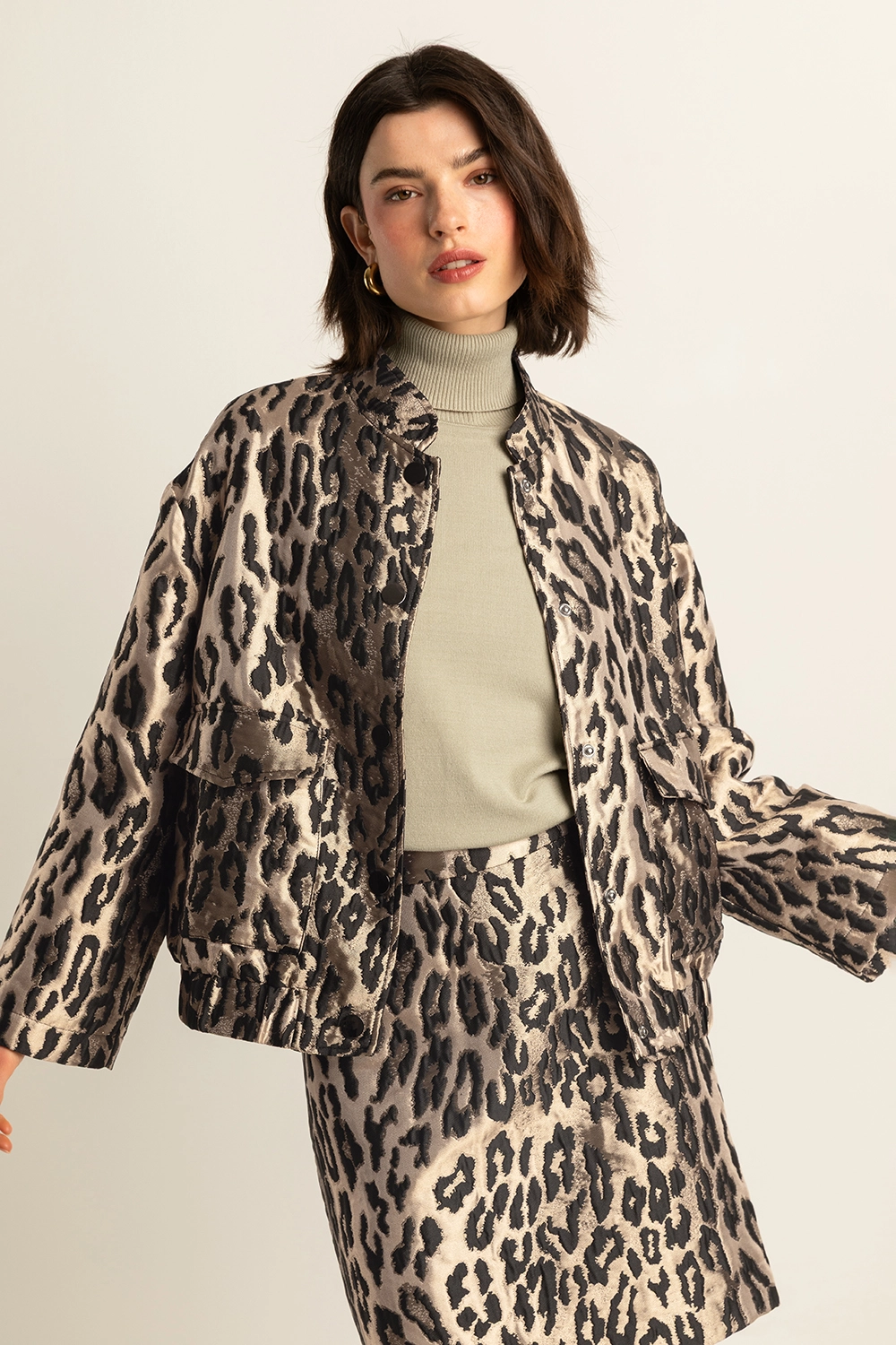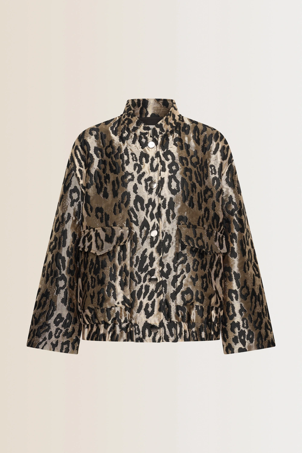 Zwarte leopard jas – jacquard met satijnglans. Stoer, vrouwelijk en statement in één. Deze korte jas in een luxueuze luipaardjacquard combineert een subtiele glans met een krachtige print. De opstaande kraag en ruime klepzakken geven een moderne utility-look, terwijl de elastische zoom zorgt voor een speelse, blousende pasvorm. Perfect over een satijnen top of strakke broek voor een eigentijdse partylook.