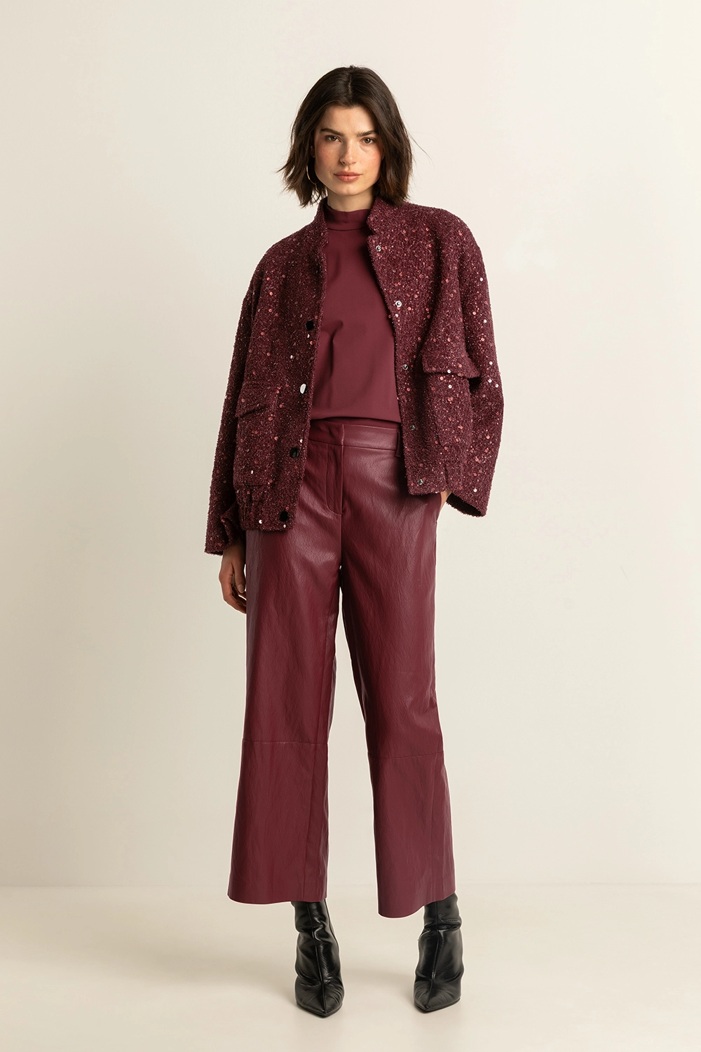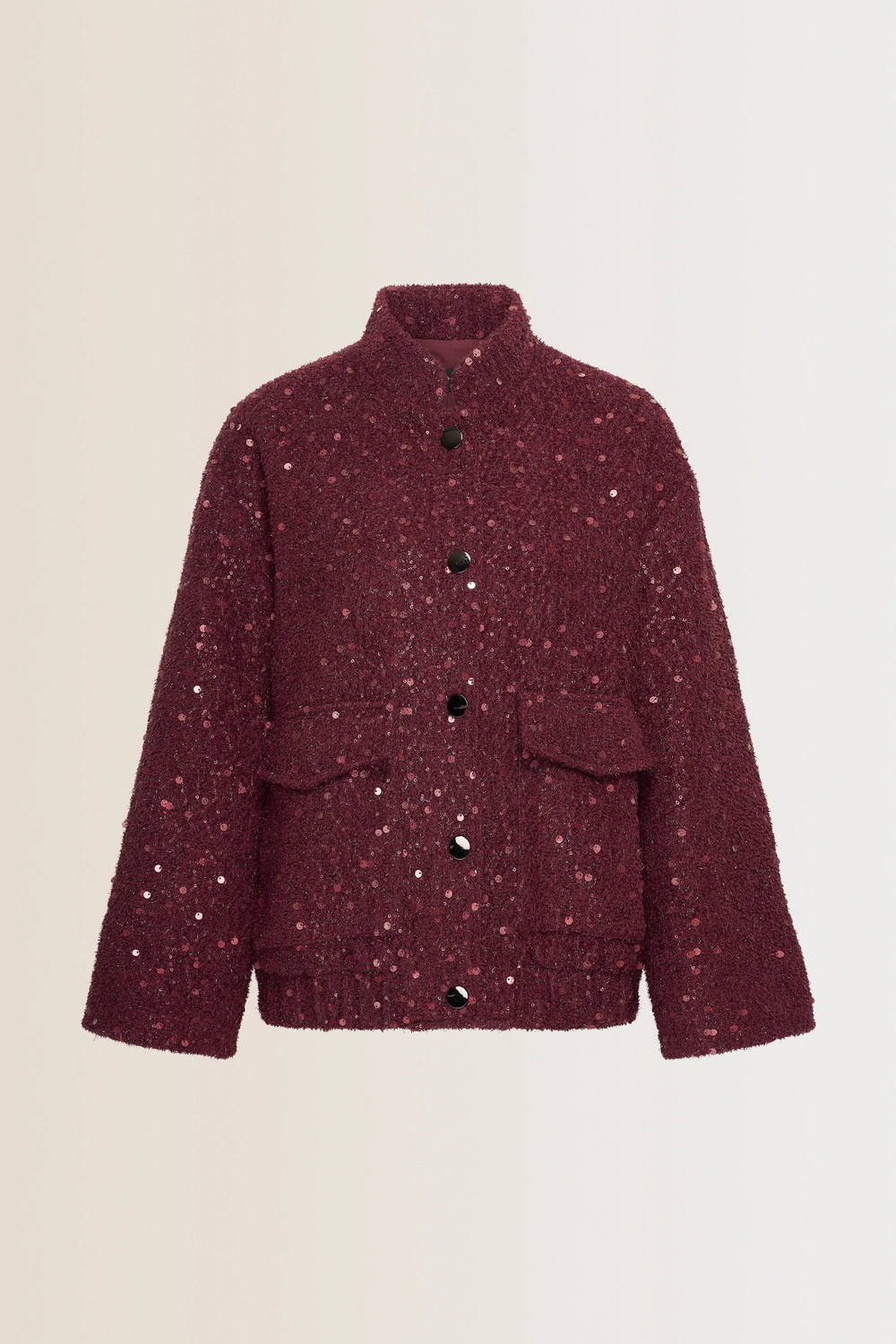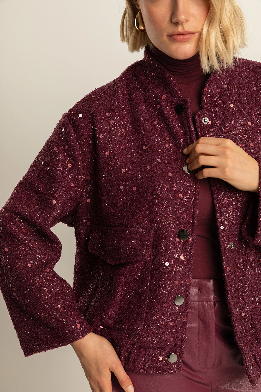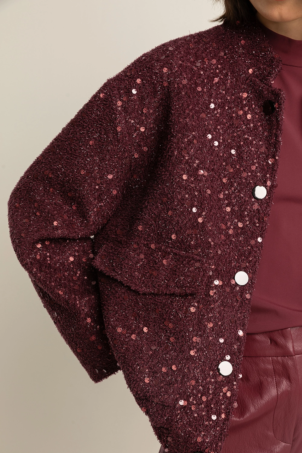 Bordeauxrood bouclé jack – blend met lurex en pailletten. Kort boxy model met een opstaande kraag, klepzakken en drukknopen. De glanzende pailletten geven deze jas een feestelijke twist, terwijl de boucléstructuur zorgt voor warmte en textuur. Perfect voor de feestdagen of om een casual outfit extra flair te geven.