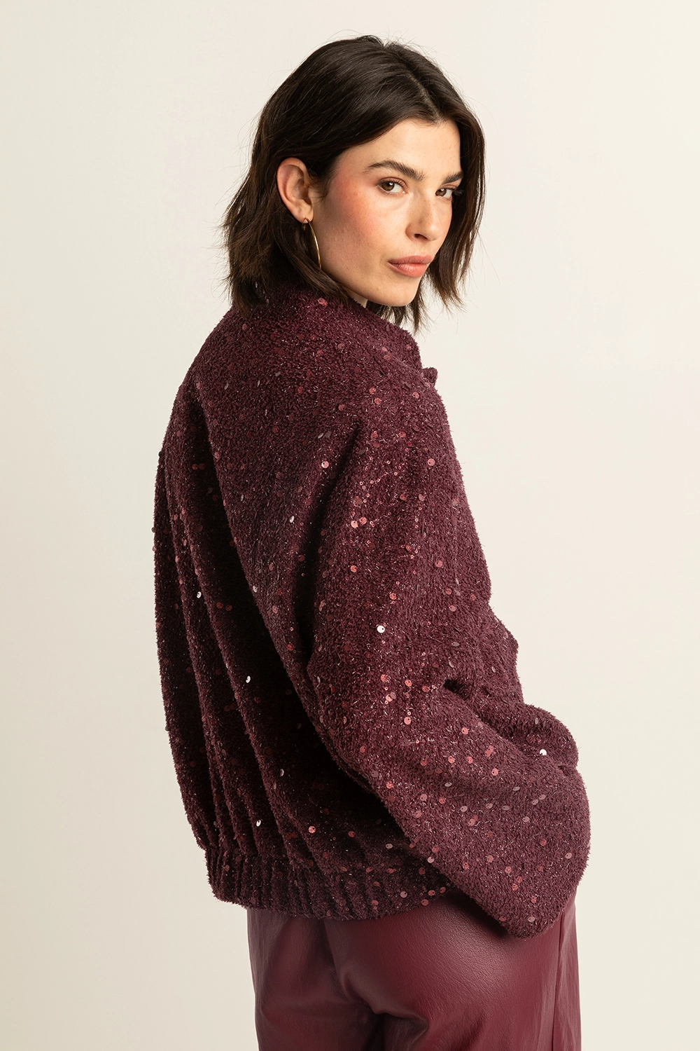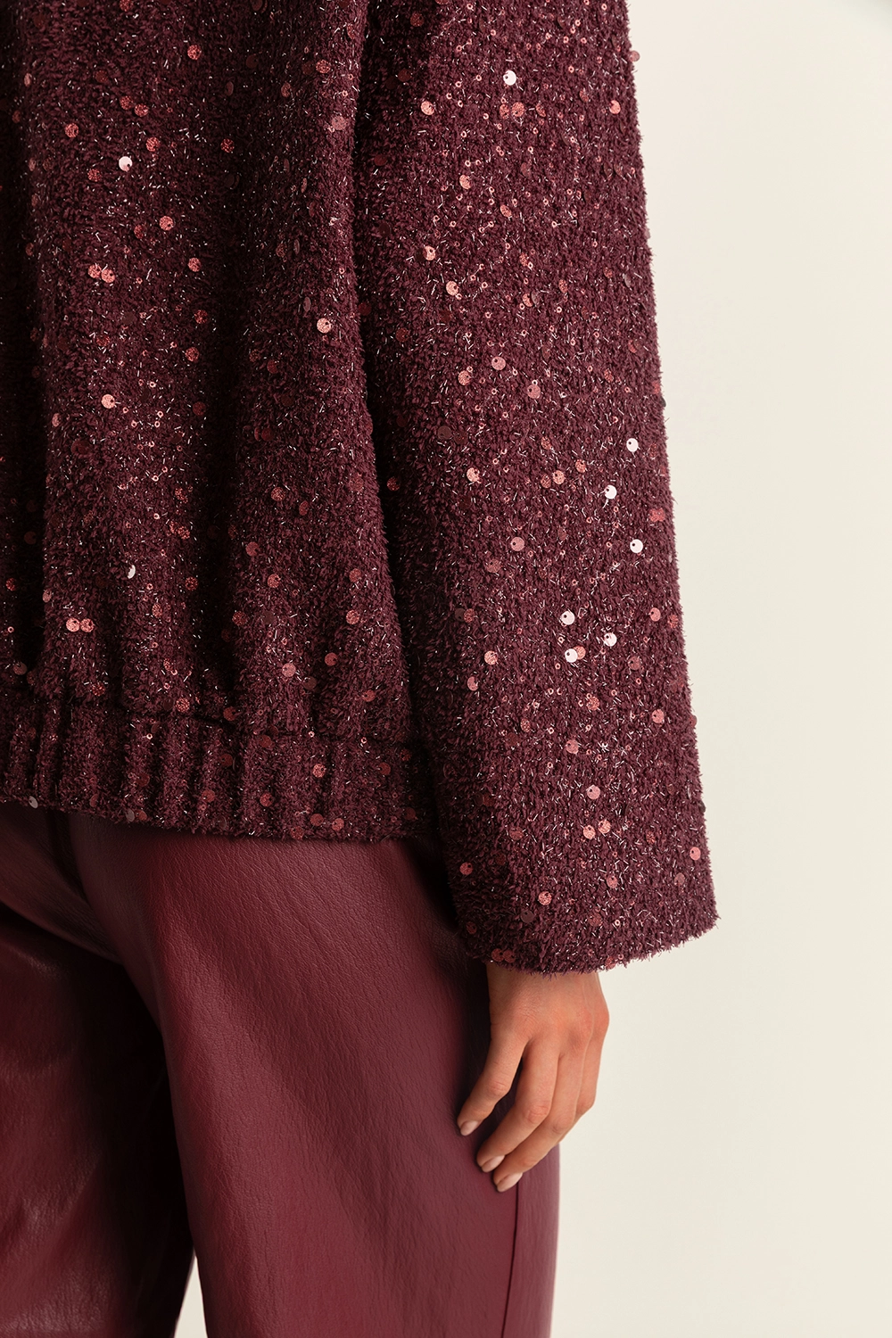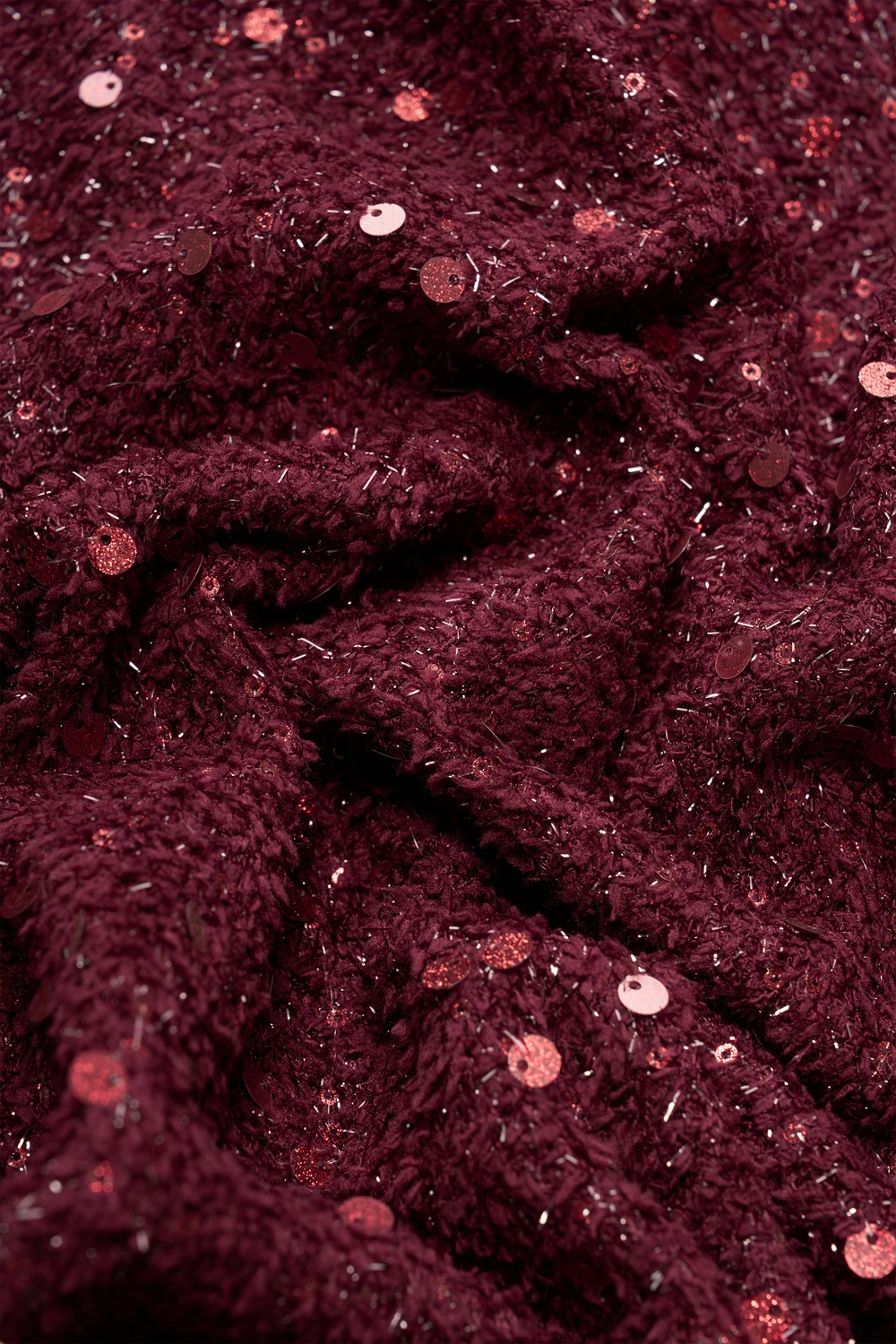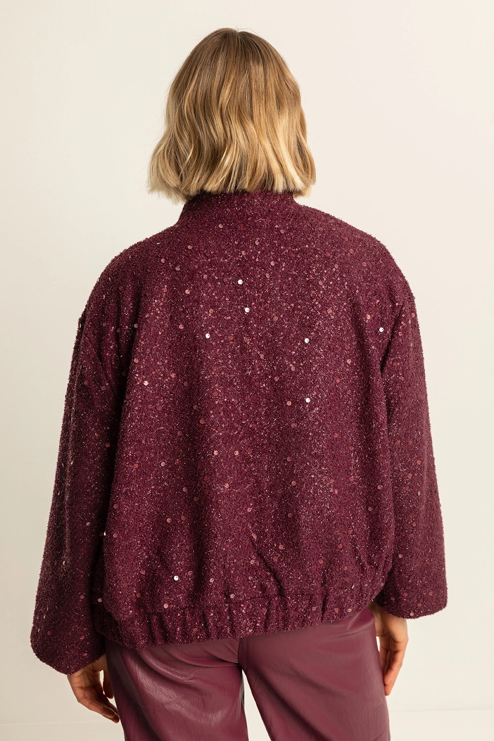 Bordeauxrood bouclé jack – blend met lurex en pailletten. Kort boxy model met een opstaande kraag, klepzakken en drukknopen. De glanzende pailletten geven deze jas een feestelijke twist, terwijl de boucléstructuur zorgt voor warmte en textuur. Perfect voor de feestdagen of om een casual outfit extra flair te geven.