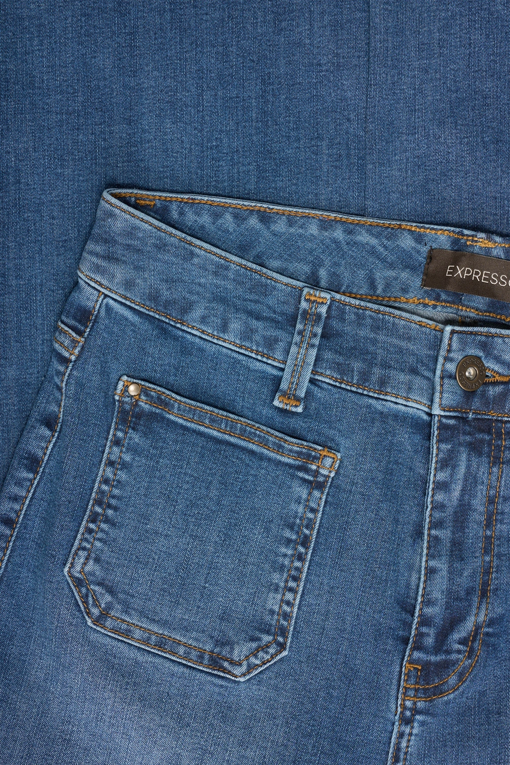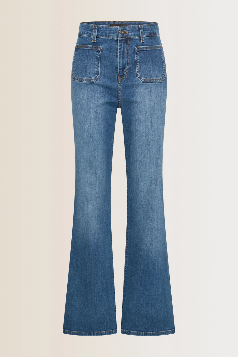 Blauwe jeans – katoenmix met stretch. High-rise en licht uitlopende pijp, met opgestikte voorzakken voor een speelse knipoog naar de seventies. Het zachte, soepele denim zit comfortabel en vormt een tijdloze basis voor talloze looks – van casual tot gekleed. Perfect met een blouse en hakken voor een elegante uitstraling, of met sneakers en een T-shirt voor een relaxte weekendstijl.