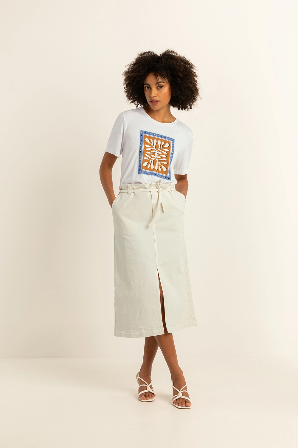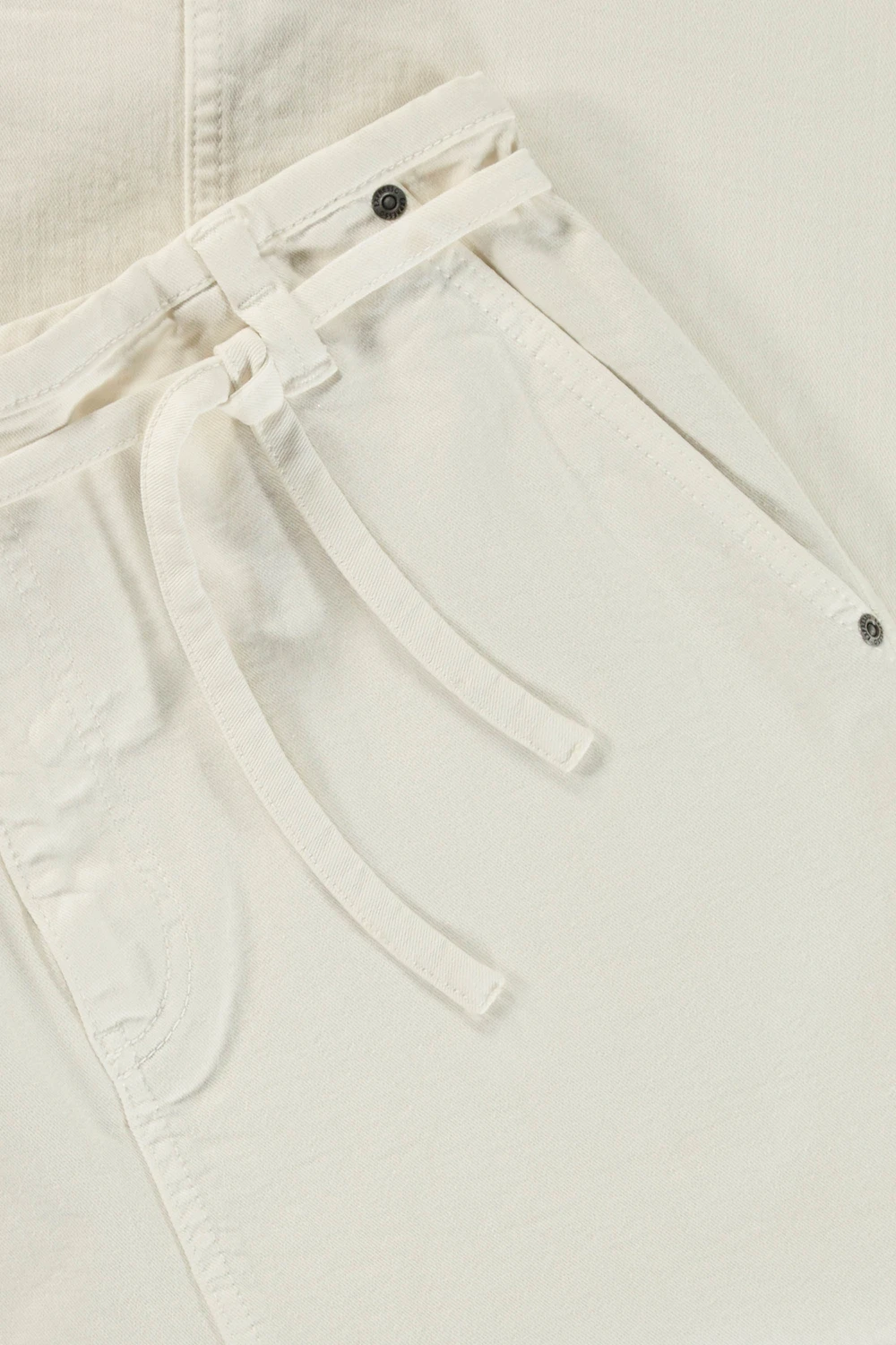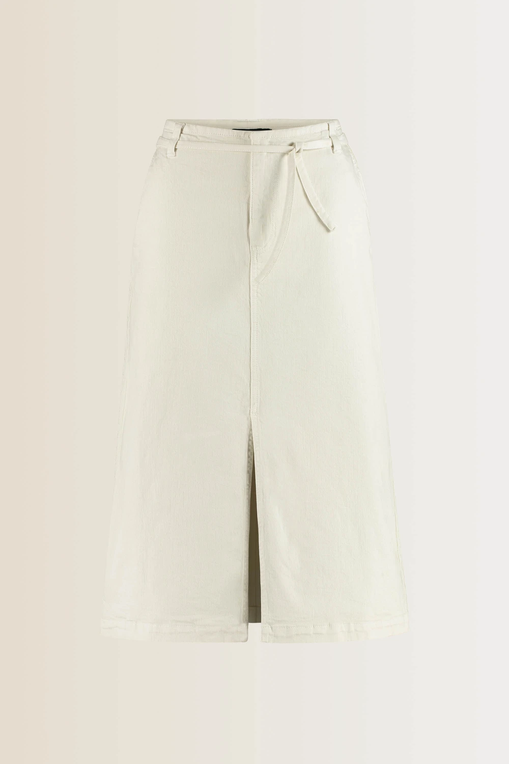Offwhite jeansrok – stretchkatoen. Slim-fit kokerrok met strikceintuur, kuitlengte. Stretchy twill, casual wassing. Dé comeback kid van het seizoen oogt in summer proof offwhite vrouwelijker dan ooit. Insider tip: nog vernieuwender is de combi met bijpassende strapless bustiertop.