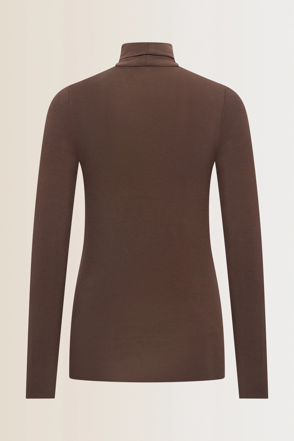 Donkerbruine coltrui – viscosemix met stretch. Fijn en glad gebreid, met een aangesloten pasvorm in een semi-sheer kwaliteit die soepel om het lichaam valt. Een perfecte basis voor stijlvolle laagjeslooks in het najaar.
