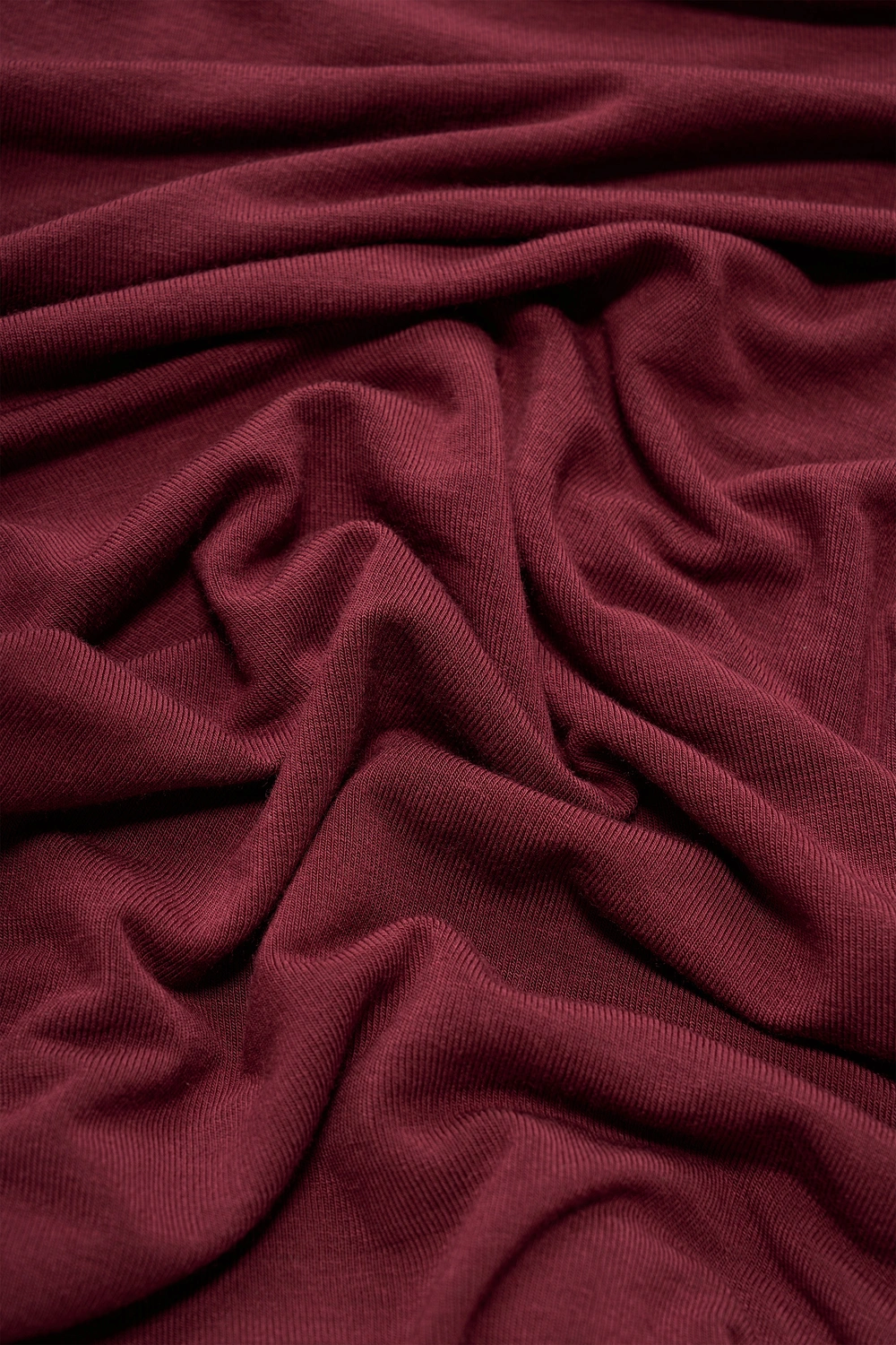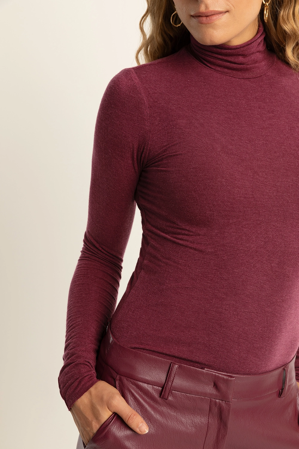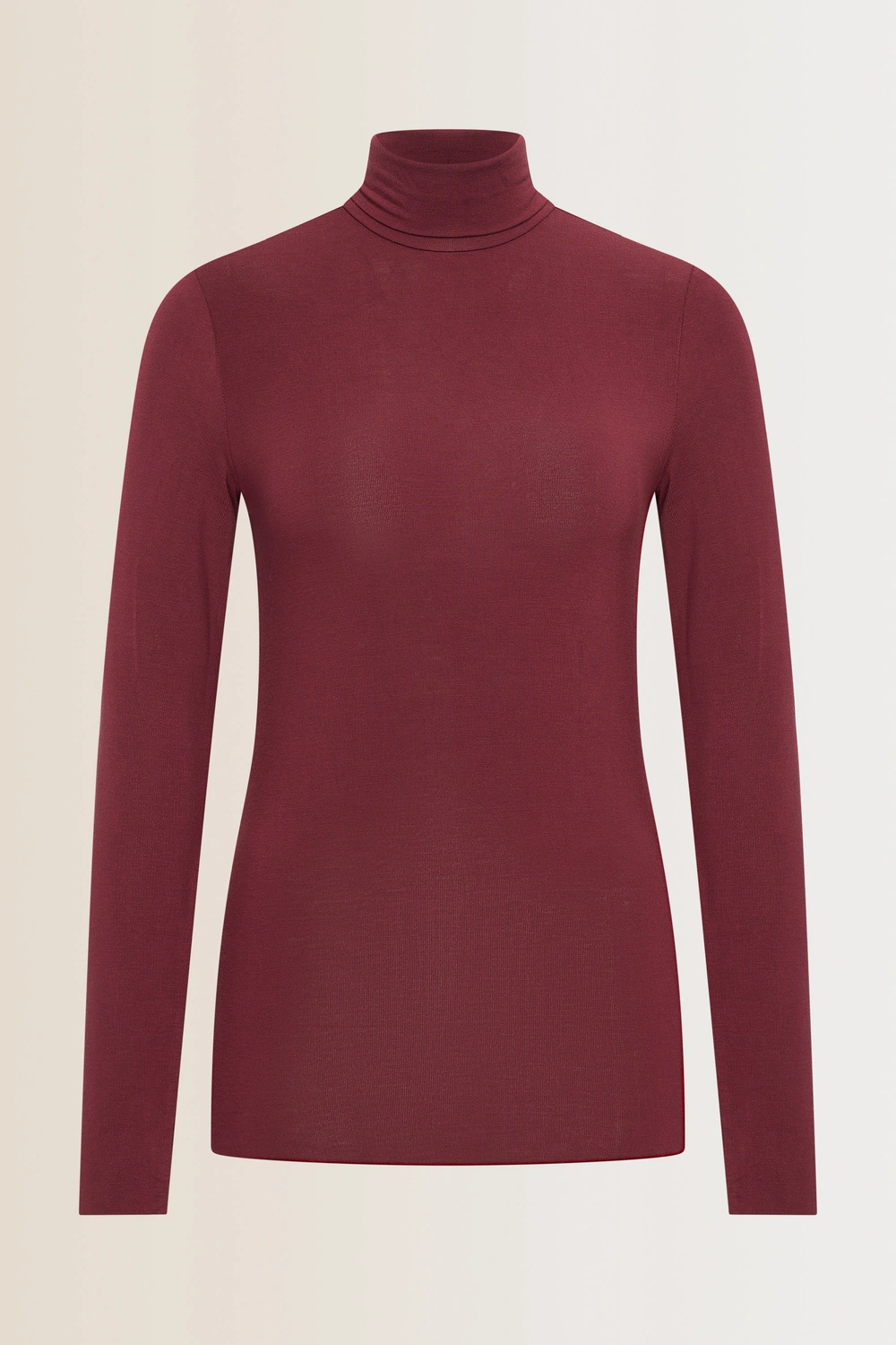 Bordeauxrode coltrui – viscosemix met stretch. Fijn en glad gebreid, met een aangesloten pasvorm in een semi-sheer kwaliteit die soepel om het lichaam valt. Een perfecte basis voor stijlvolle laagjeslooks in het najaar.