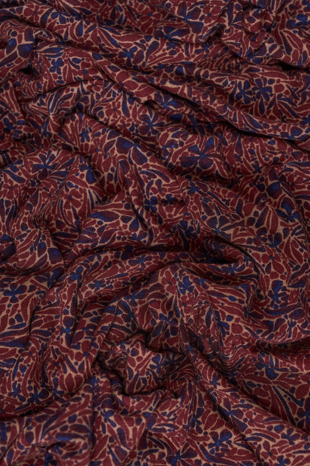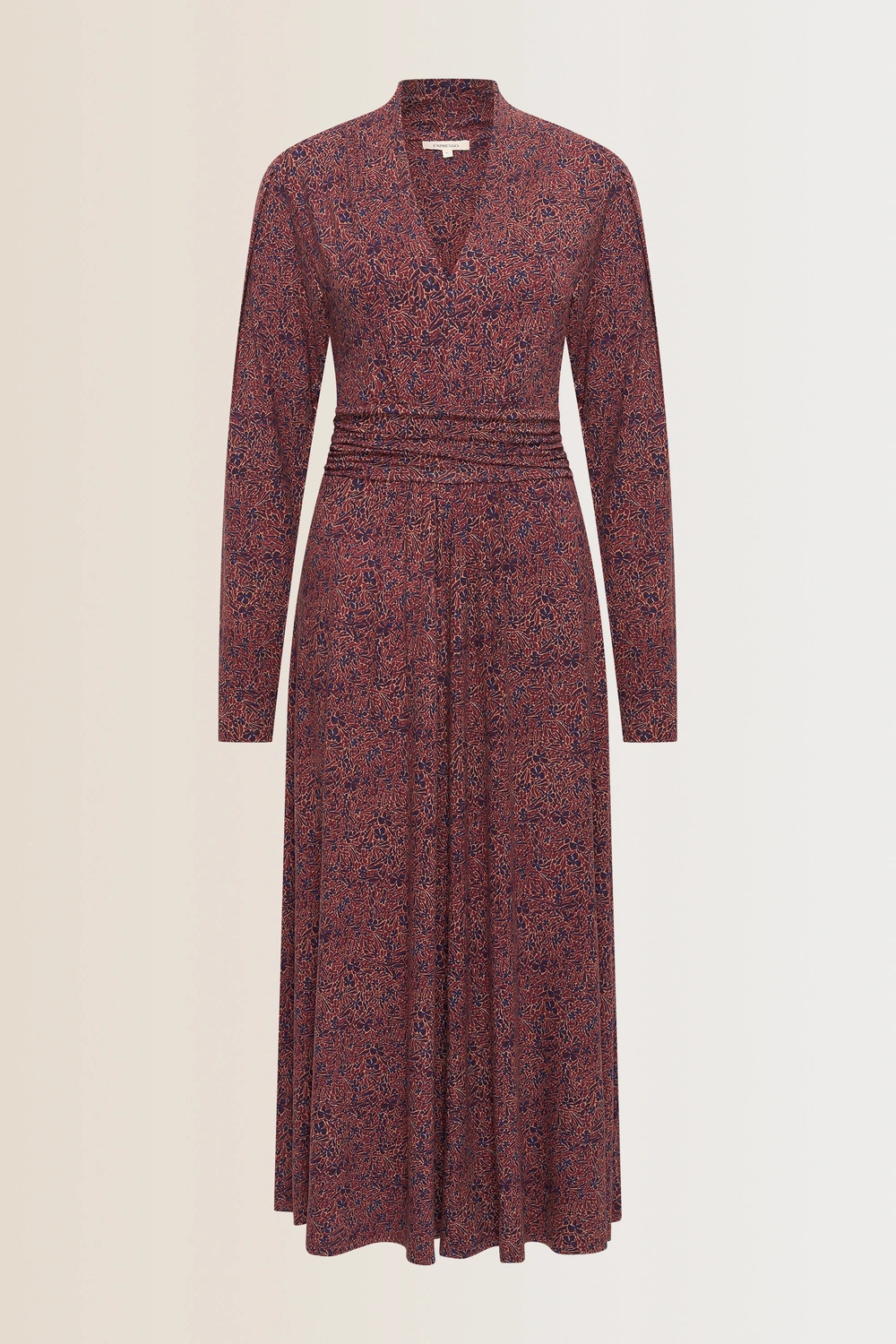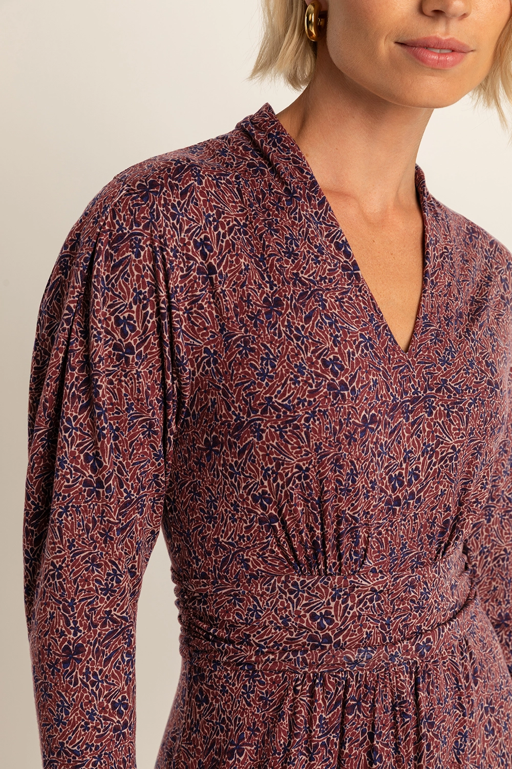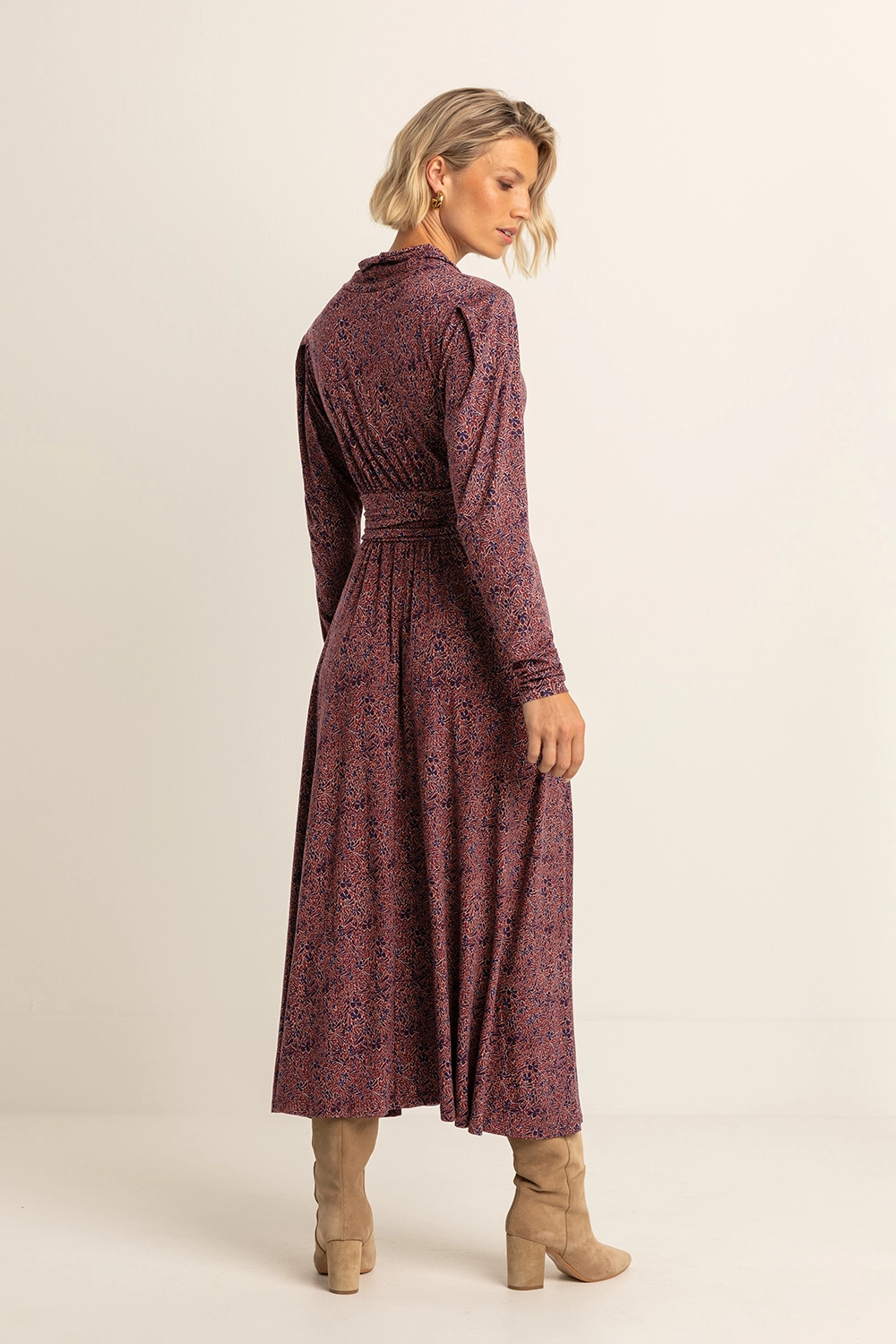 Bordeauxrode maxi-jurk – zachte jersey met all-over dessin in rood- en blauwtinten. Het getailleerde model met plooidetail in de taille benadrukt het vrouwelijke silhouet, terwijl de soepele stof mooi meebeweegt. De V-hals en lange mouwen maken deze jurk geschikt voor zowel werk als diner. Een veelzijdige stijl die je met hakken of laarzen eindeloos kunt combineren.