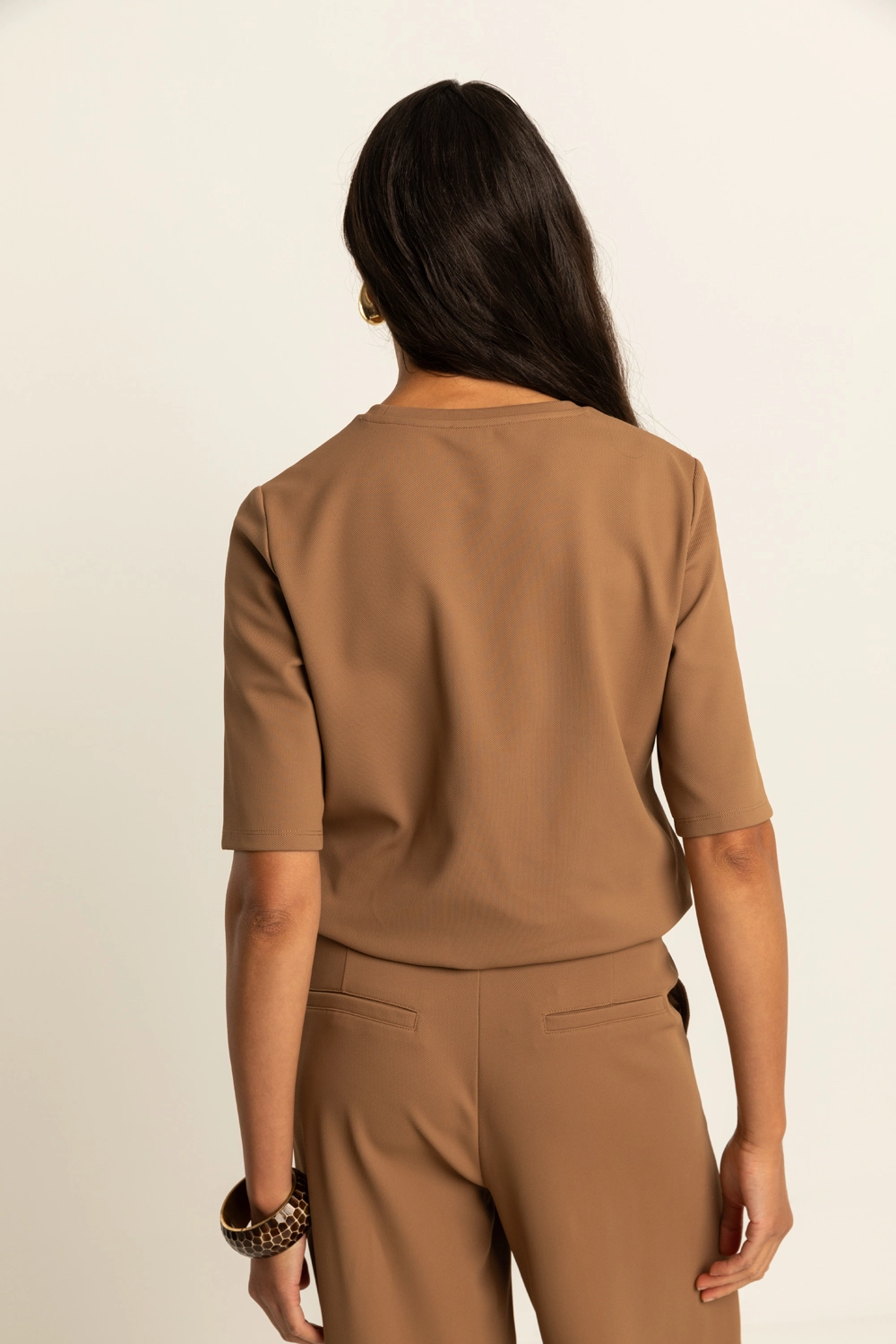 Donkerbruine top – jersey kwaliteit met een subtiele structuur. Soepelvallend en comfortabel stretchy, met een ronde hals en halflange mouwen. Deze top draagt luchtig, en matcht moeiteloos met bijpassende broek voor een moderne set die altijd klopt.