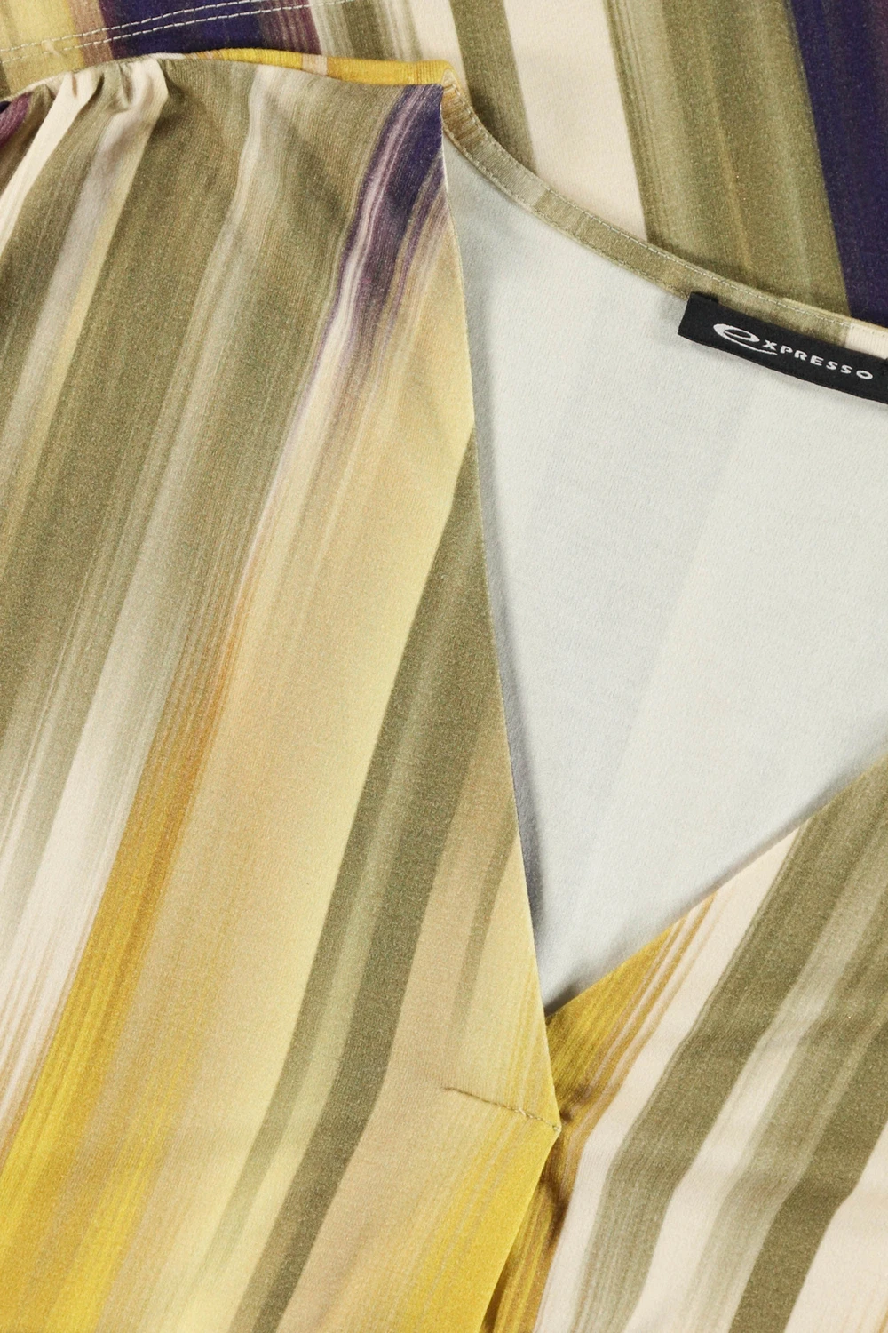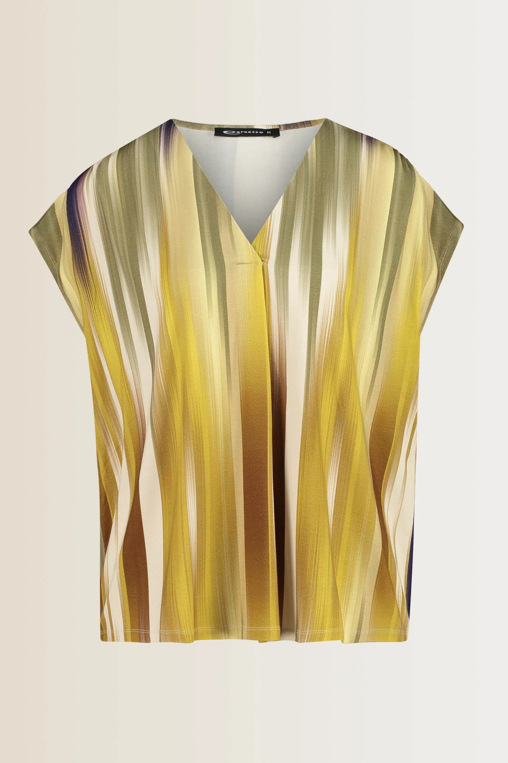 Top met vervaagde print in geel, khaki, aubergine en offwhite – stretch viscose. Recht & ruimvallend, V-hals, heuplengte. Zachte, soepele stretch-jersey. Een vrouwelijke top in vloeiende kleurnuances, valt mooi soepel over de schouders. Tip: ook te stylen als faux jumpsuit-set met de bijpassende broek.