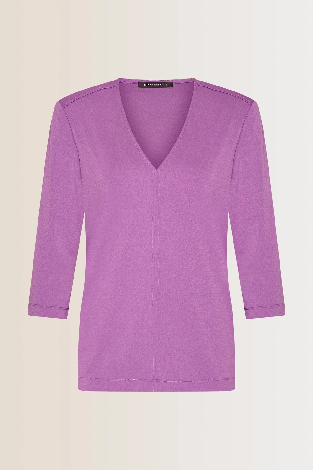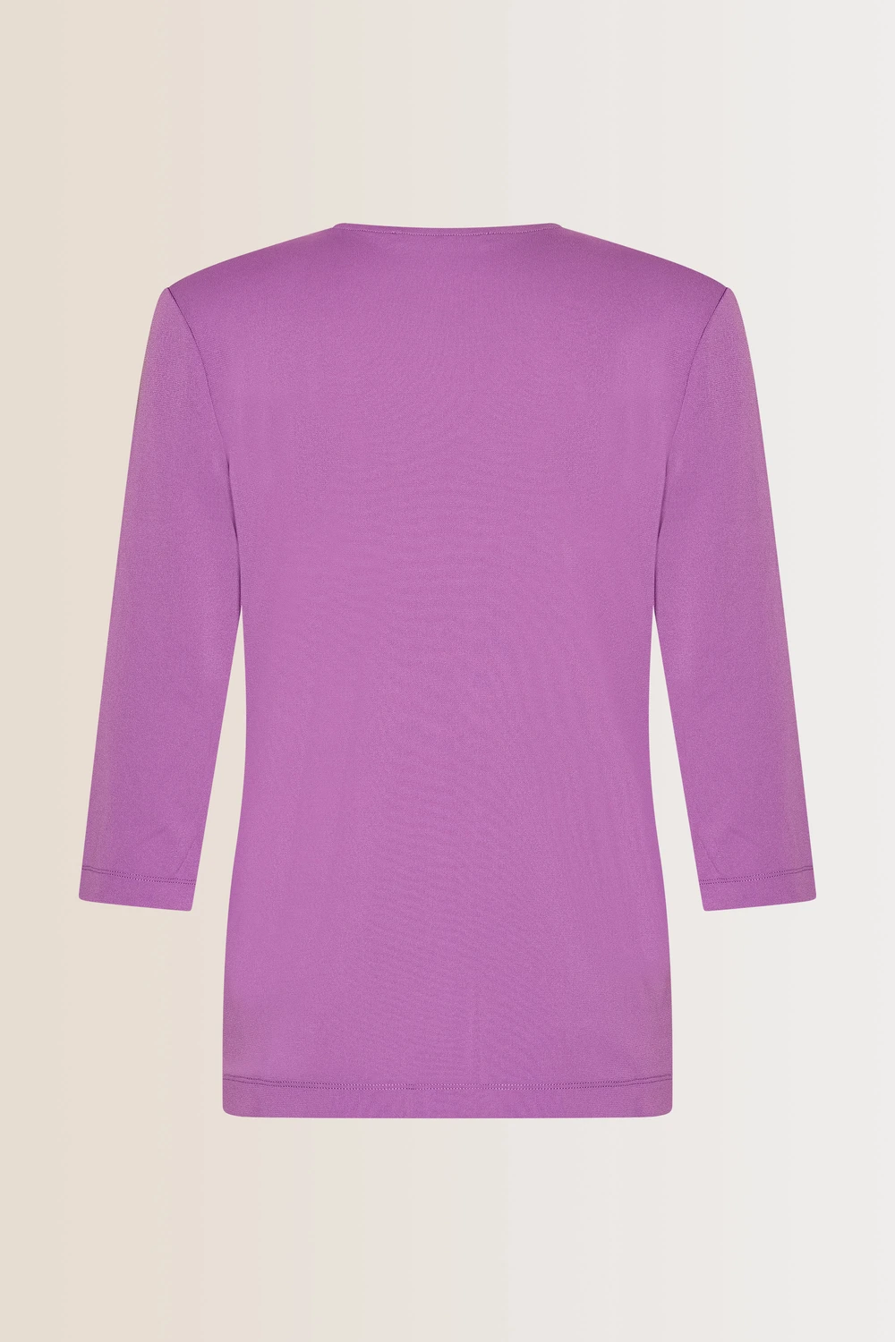 Lila shirt – zachte viscosemix. Dit elegante shirt heeft een diepe V-hals en driekwart mouwen, uitgevoerd in een prachtige lila kleur. De soepele en zachte stof zorgt voor ultiem draagcomfort, terwijl de aansluitende pasvorm een flatterend silhouet creëert. Een veelzijdig item dat perfect is voor zowel casual als formele gelegenheden. Combineer met een zwarte pantalon voor een chique uitstraling of met jeans voor een meer casual look.