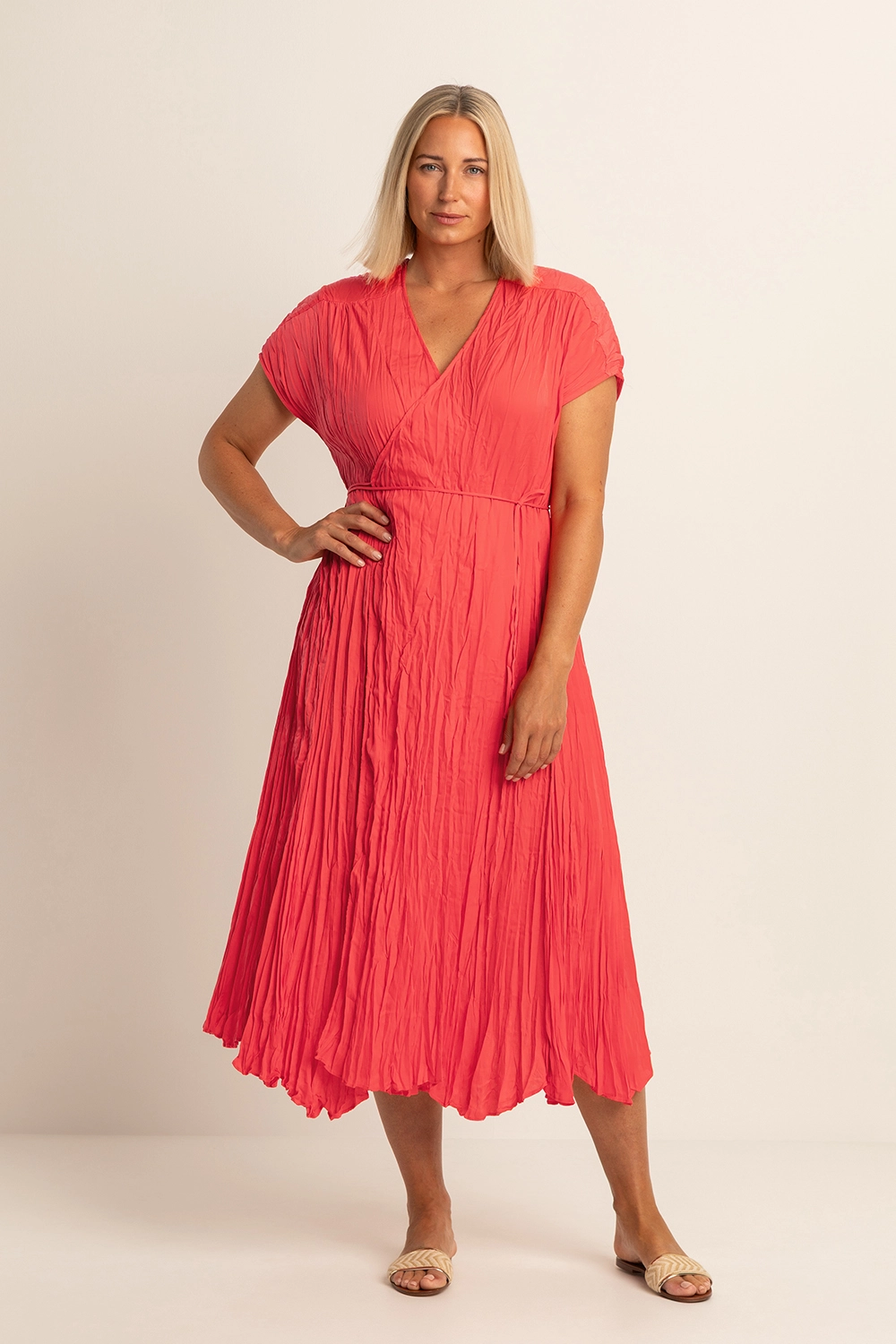 Koraalrode overslagjurk – licht glanzende, geplisseerde kwaliteit. Vrouwelijk en zwierig model met een V-hals, korte mouwen en een strikceintuur in de taille. Een uitgesproken zomerjurk, elegant en luchtig tegelijk.