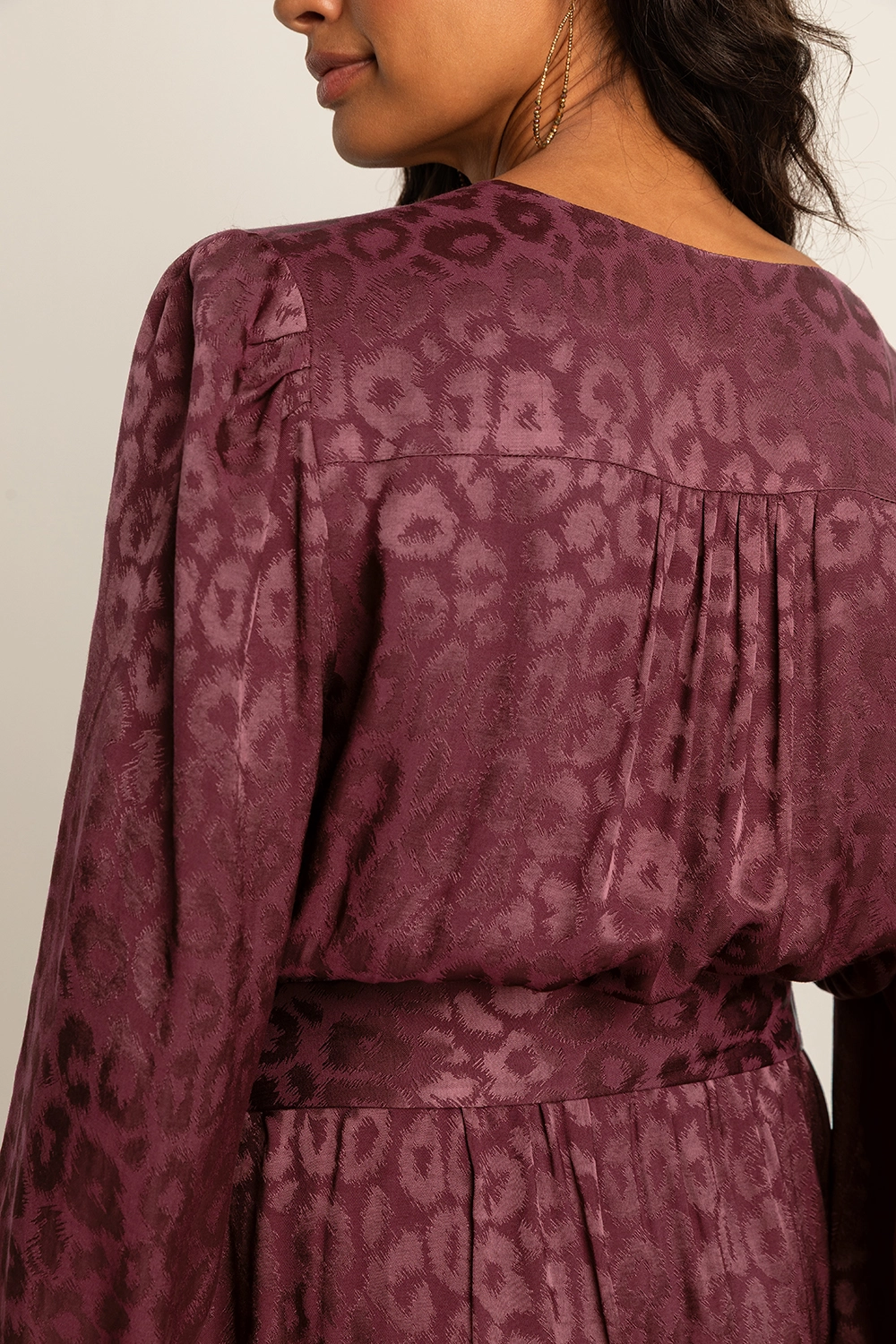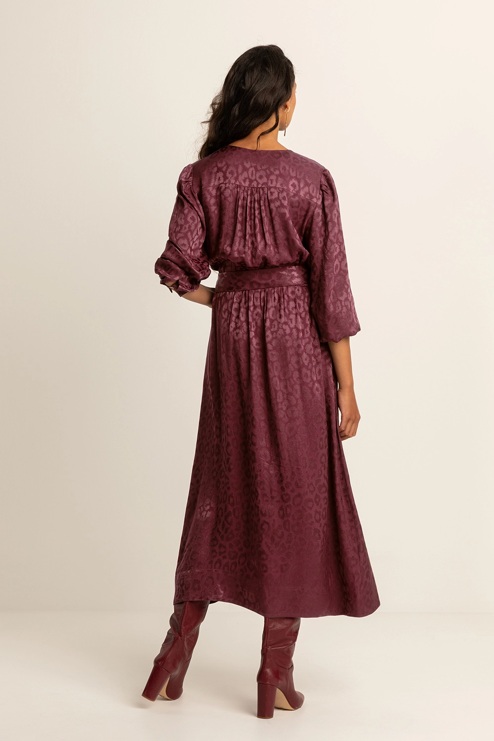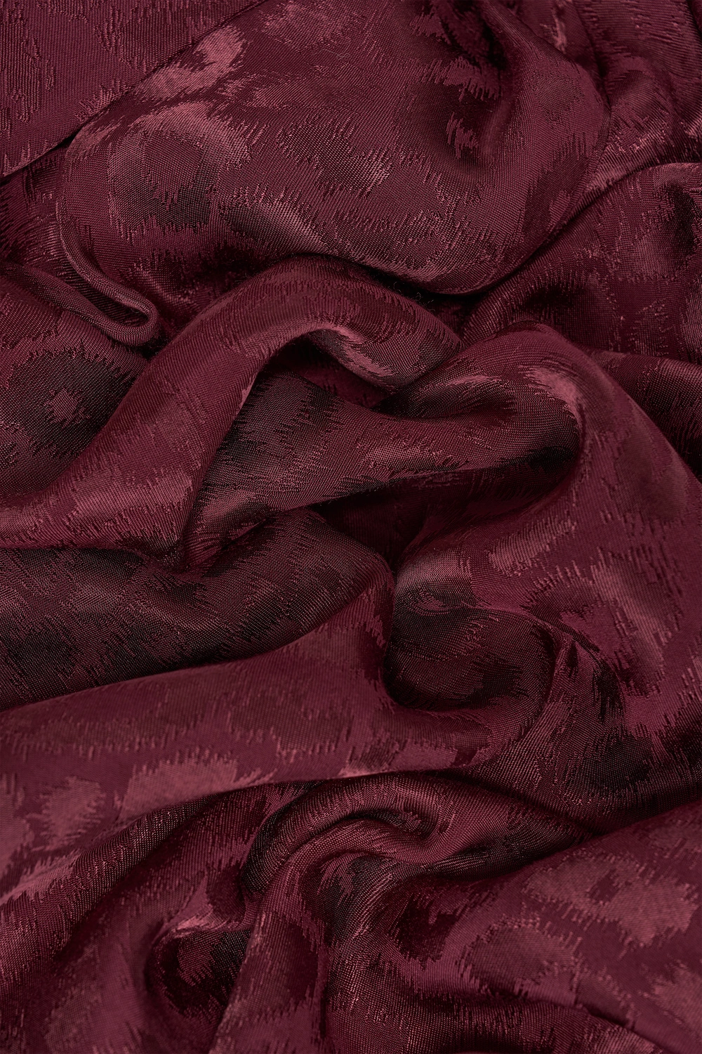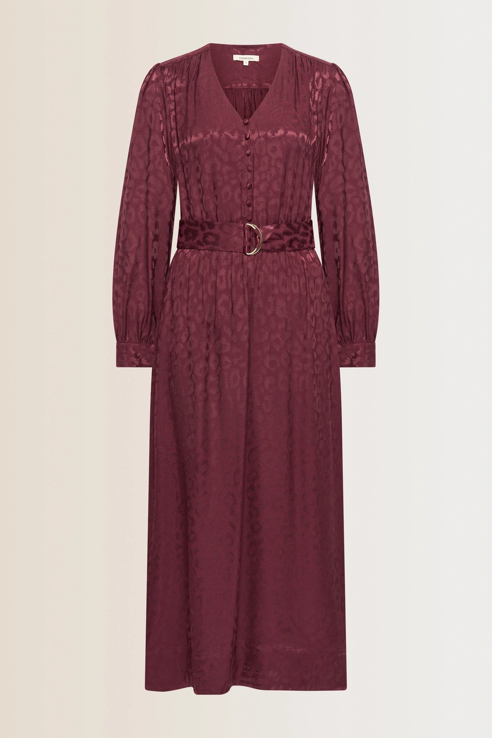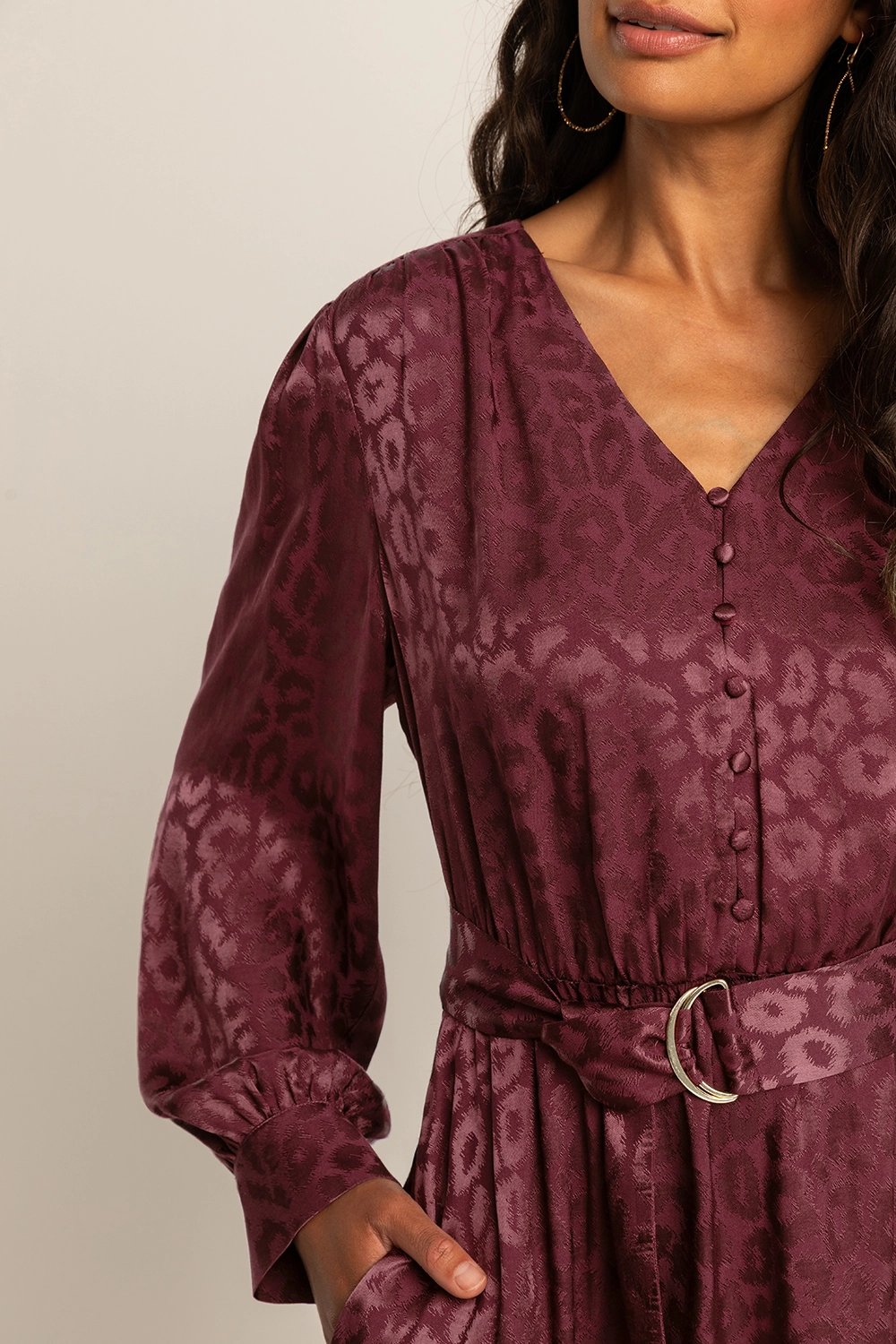 Dieprode midi-jurk – subtiel glanzende viscose met jacquard geweven animaldessin. Vrouwelijk en elegant, met een licht getailleerde pasvorm, doorknoopsluiting en bijpassende ceintuur die het silhouet accentueert. De soepele stof valt moeiteloos en geeft deze jurk een rijke uitstraling. Perfect voor een diner, een feestelijke gelegenheid of gewoon wanneer je jezelf extra mooi wilt voelen.