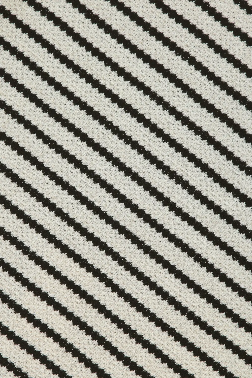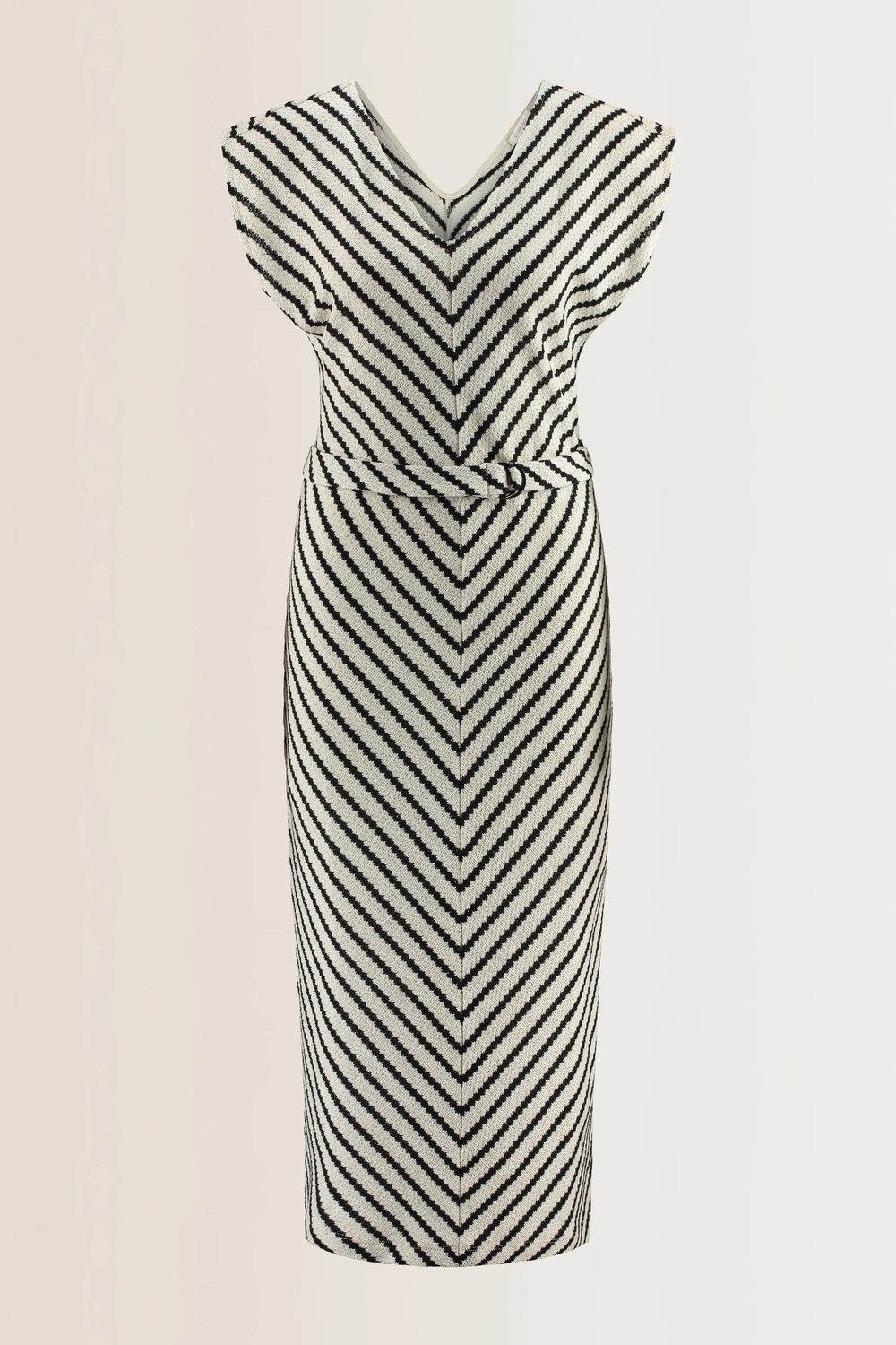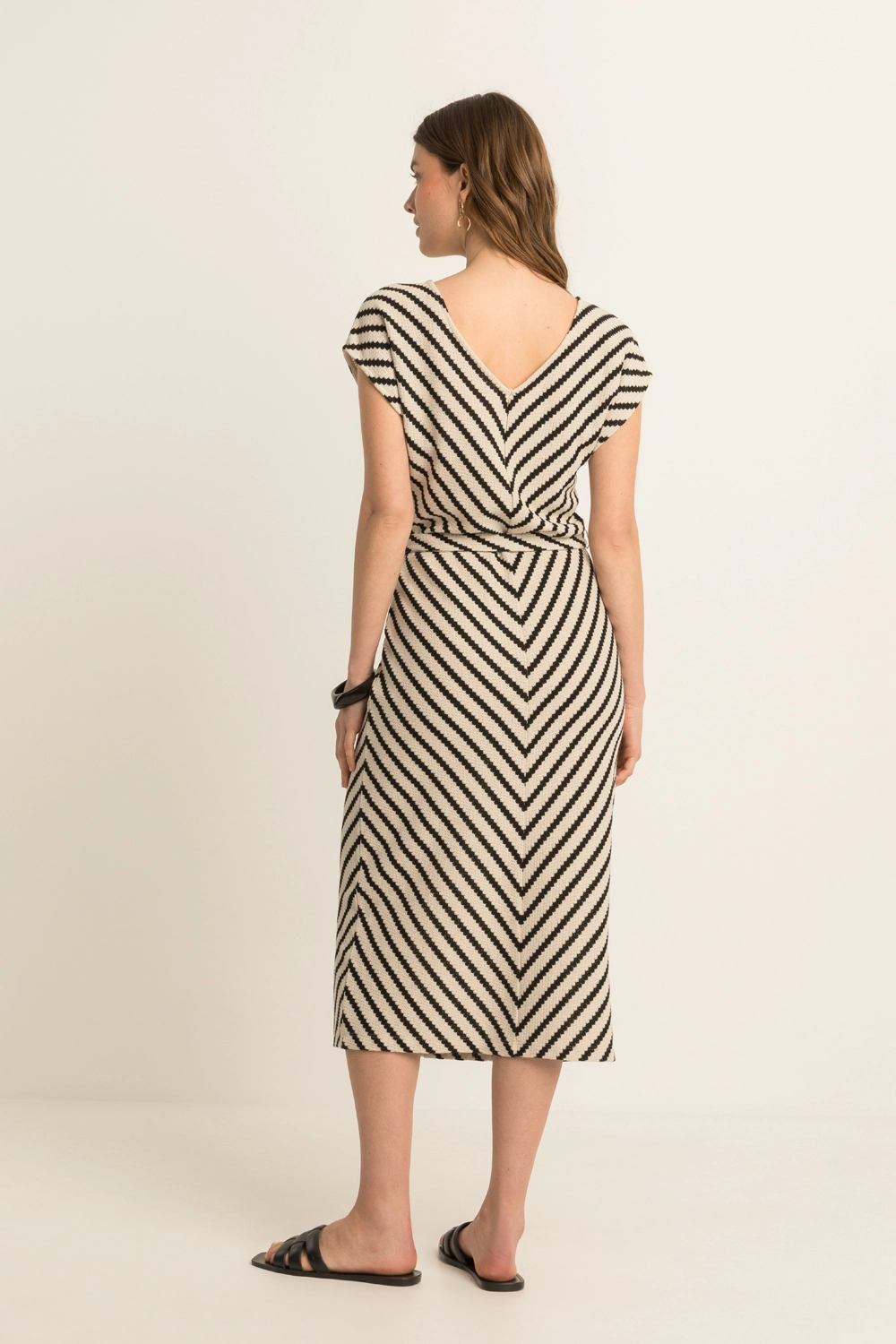 Jurk met gestreept patroon – comfortabele jersey kwaliteit met een zachte structuur. Vrouwelijk en relaxed, met een V-hals, korte aangeknipte mouwen en een strikceintuur in de taille. Het grafische streeppatroon loopt mooi in puntvorm en geeft deze jurk een flatterend effect. De soepelvallende kwaliteit draagt prettig en maakt dit een stijlvolle keuze voor zonnige dagen waarop je er in één keer verzorgd uit wilt zien.