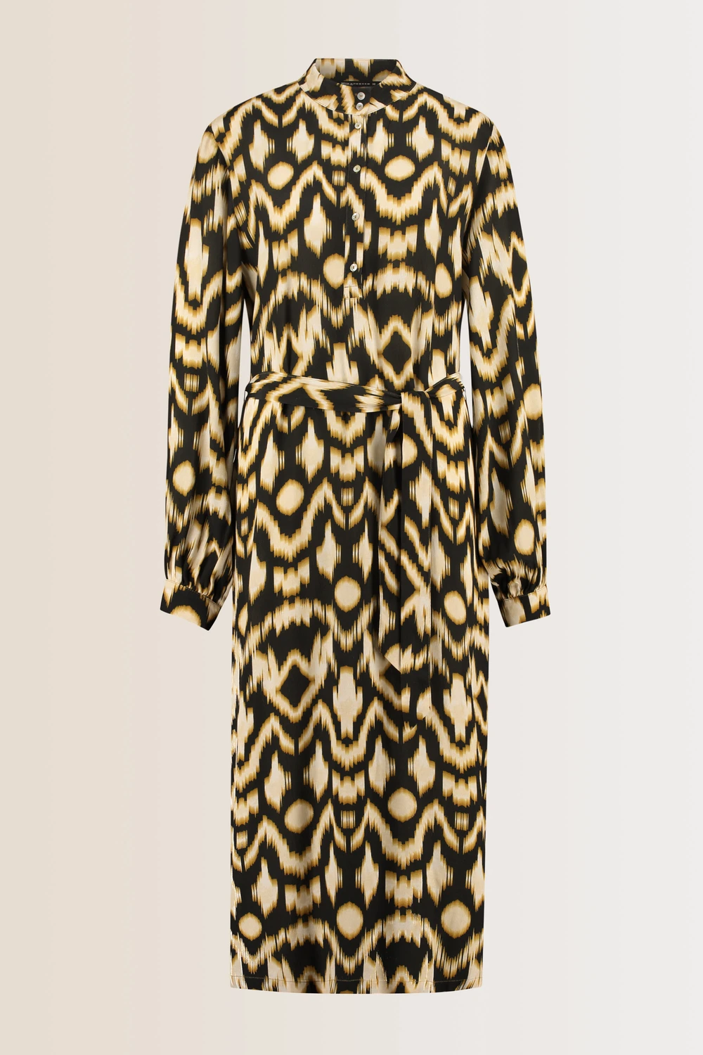 Maxi-jurk met multicolour print– viscose EcoVero. Relaxte pasvorm met ceintuur, bloezende lange mouwen, lengte tussen kuit en enkel. Soepele crêpe met ikatprint in zwart, kit en okergeel. Van werkdag tot borrel: de printed maxi dress is een no-brainer.