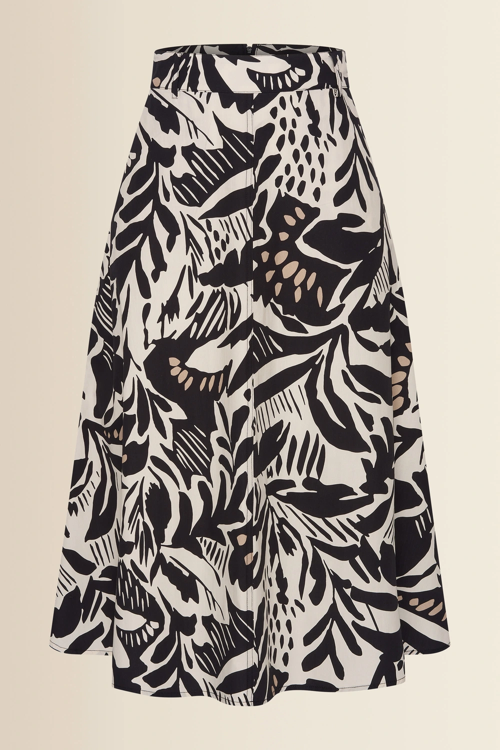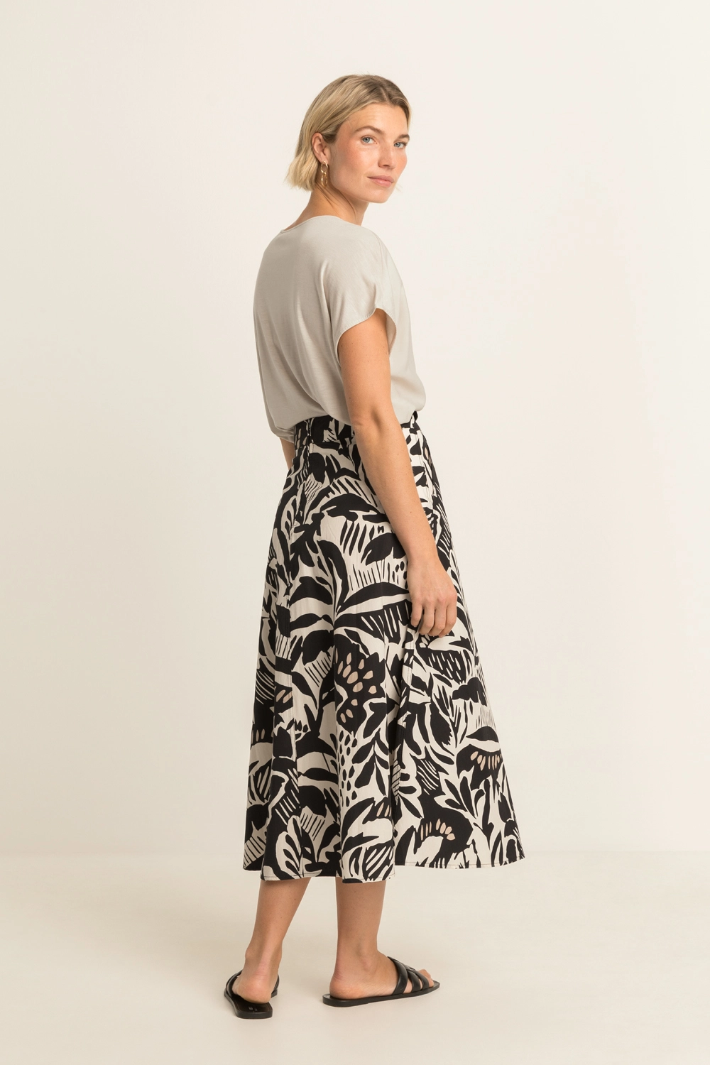 Zwart-witte rok met print – luchtige, soepelvallende stof met een grafisch bladmotief. Hoog in de taille en vrouwelijk uitlopend, met een midi-lengte die elegant meebeweegt. De krachtige zwart-witcombinatie geeft deze rok een expressieve uitstraling, terwijl de lichte kwaliteit zorgt voor een comfortabele fit. Een opvallend item dat je look in één keer stijlvol en verzorgd maakt.
