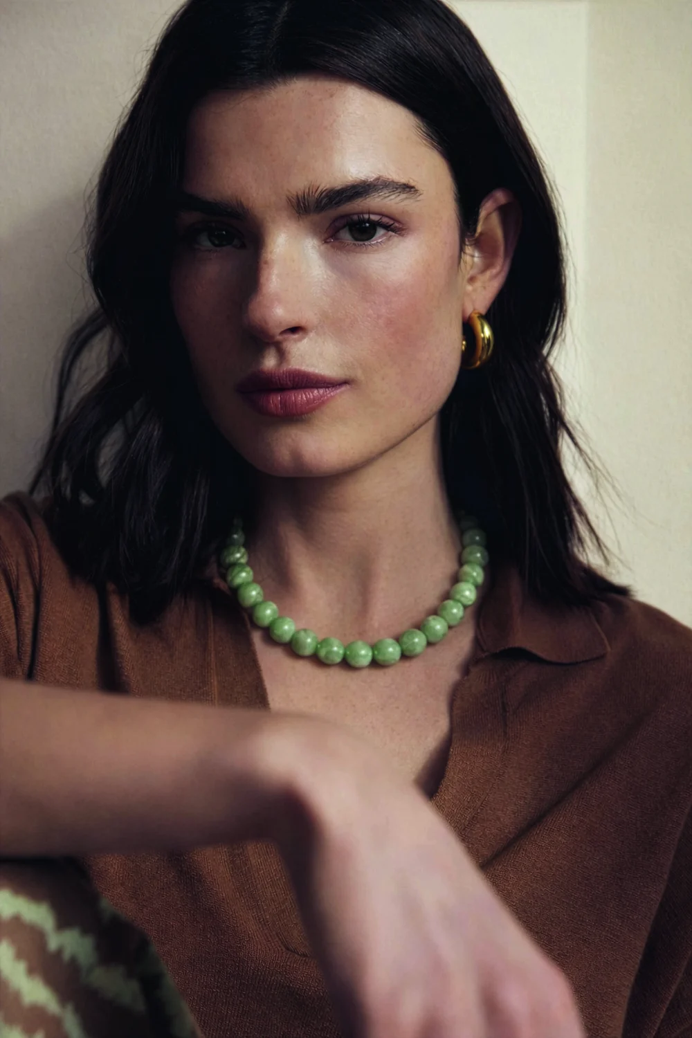 Mintgroene kralenketting – ronde glanskralen met een goudkleurige, verstelbare sluiting. Een subtiel statement dat elke look net dat beetje extra geeft.