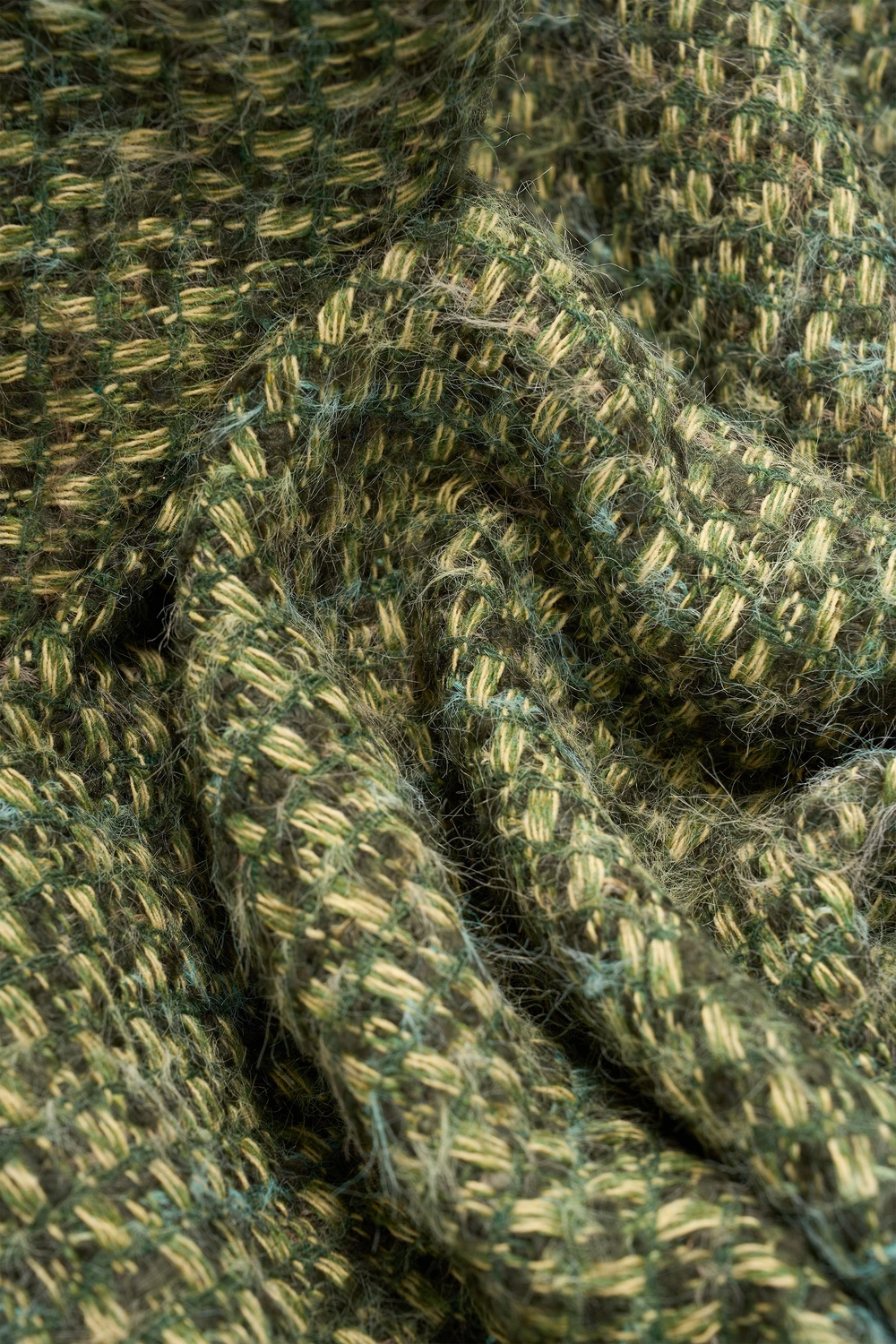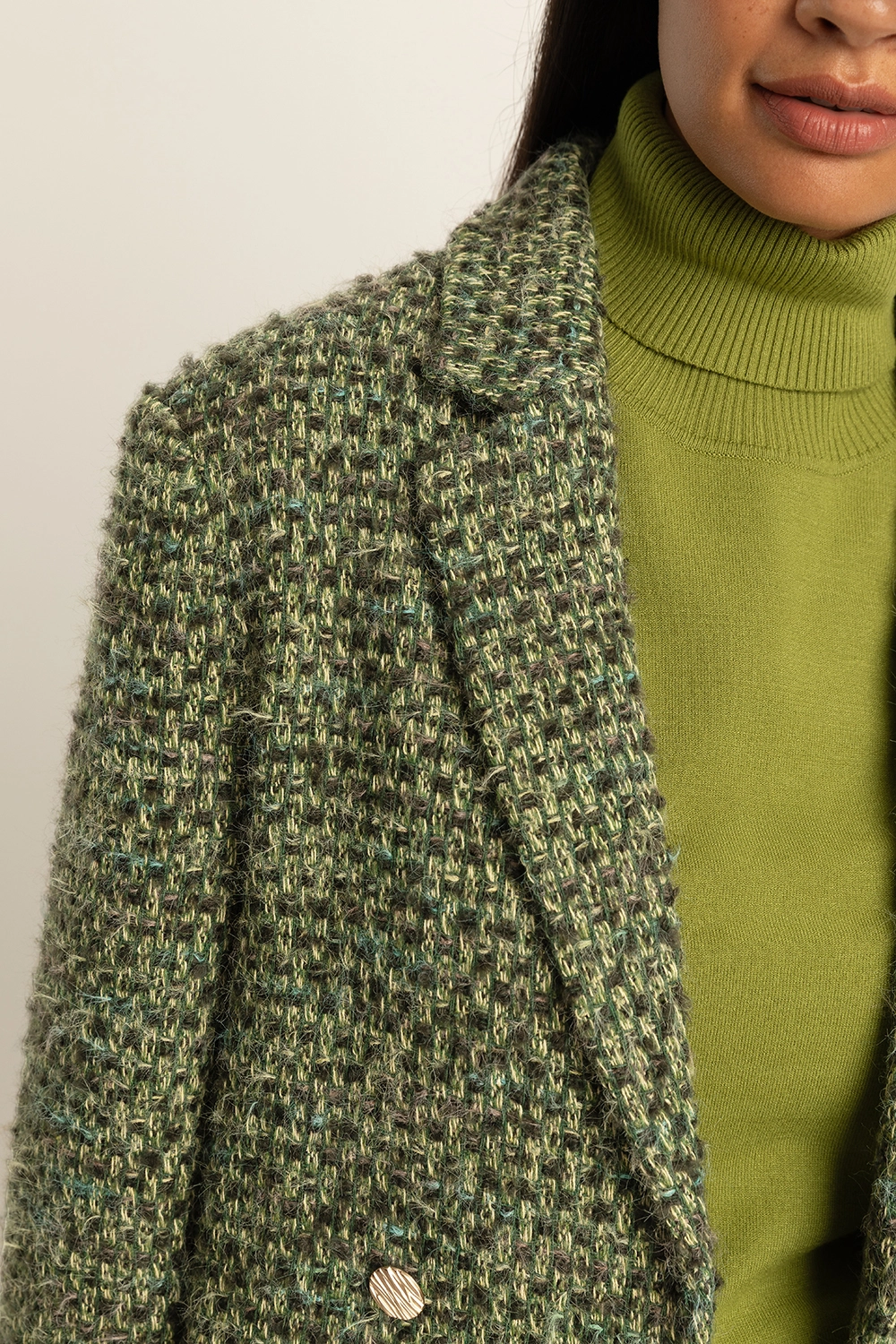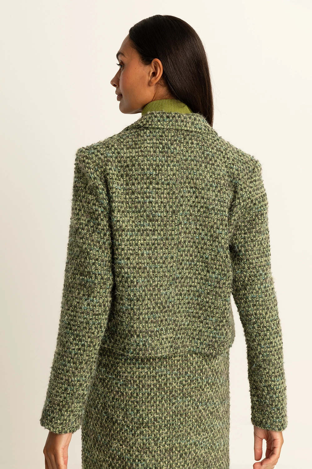Groene bouclé blazer – Kort en recht model met lange mouwen en dubbele rij goudkleurige knopen. De gestructureerde bouclé geeft dit jasje een moderne, luxueuze uitstraling, terwijl de cropped lengte zorgt voor een vrouwelijk en eigentijds silhouet.