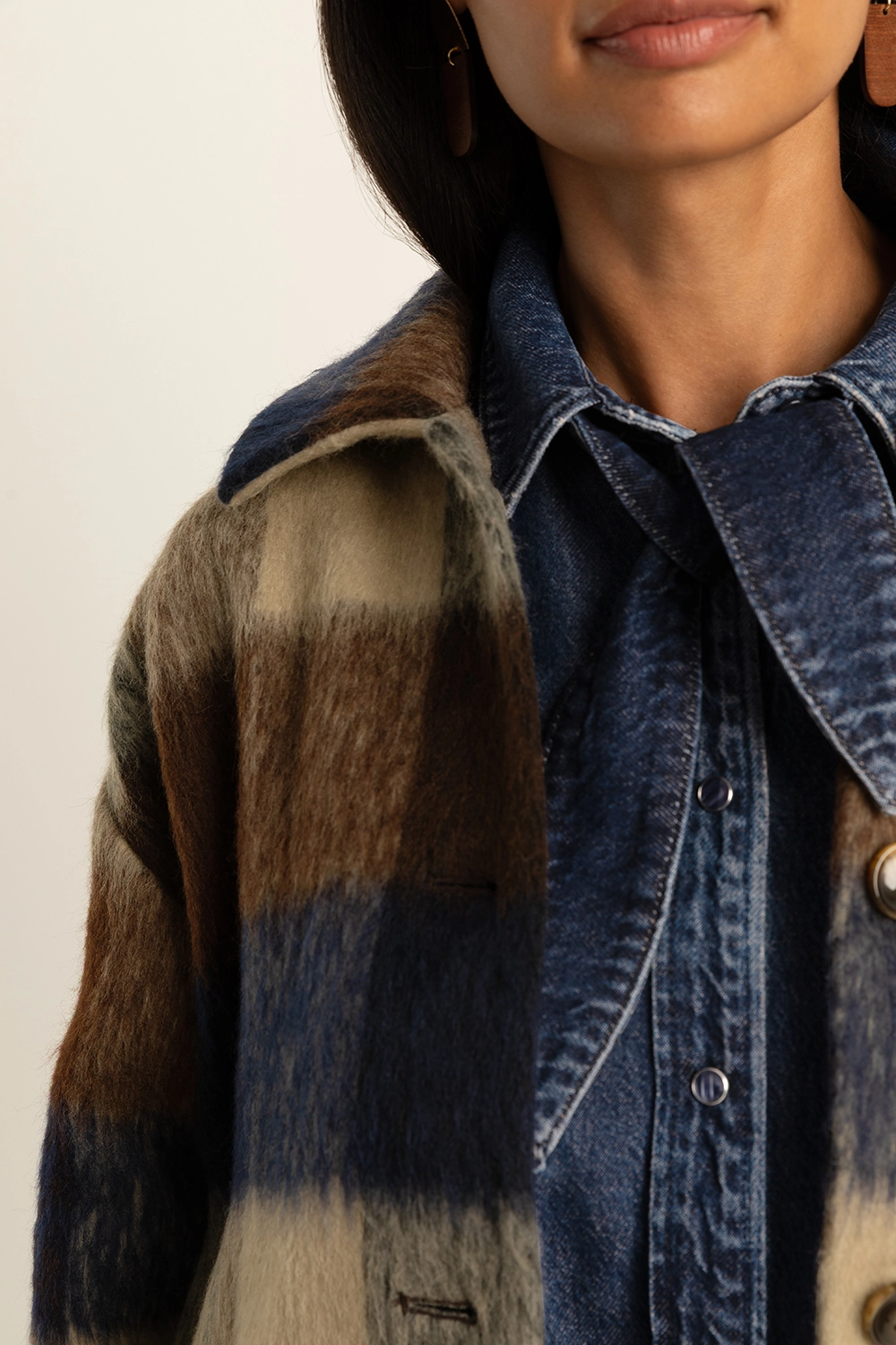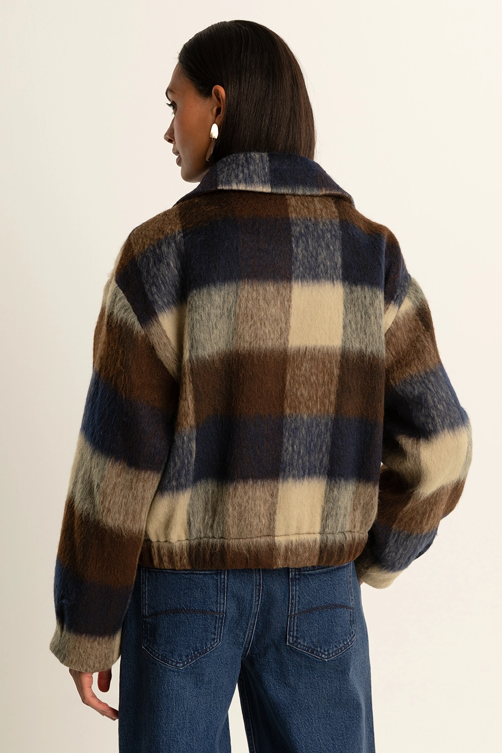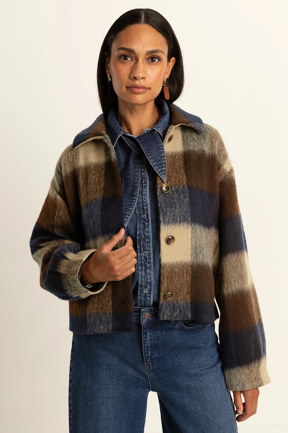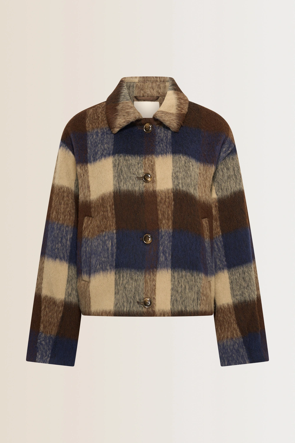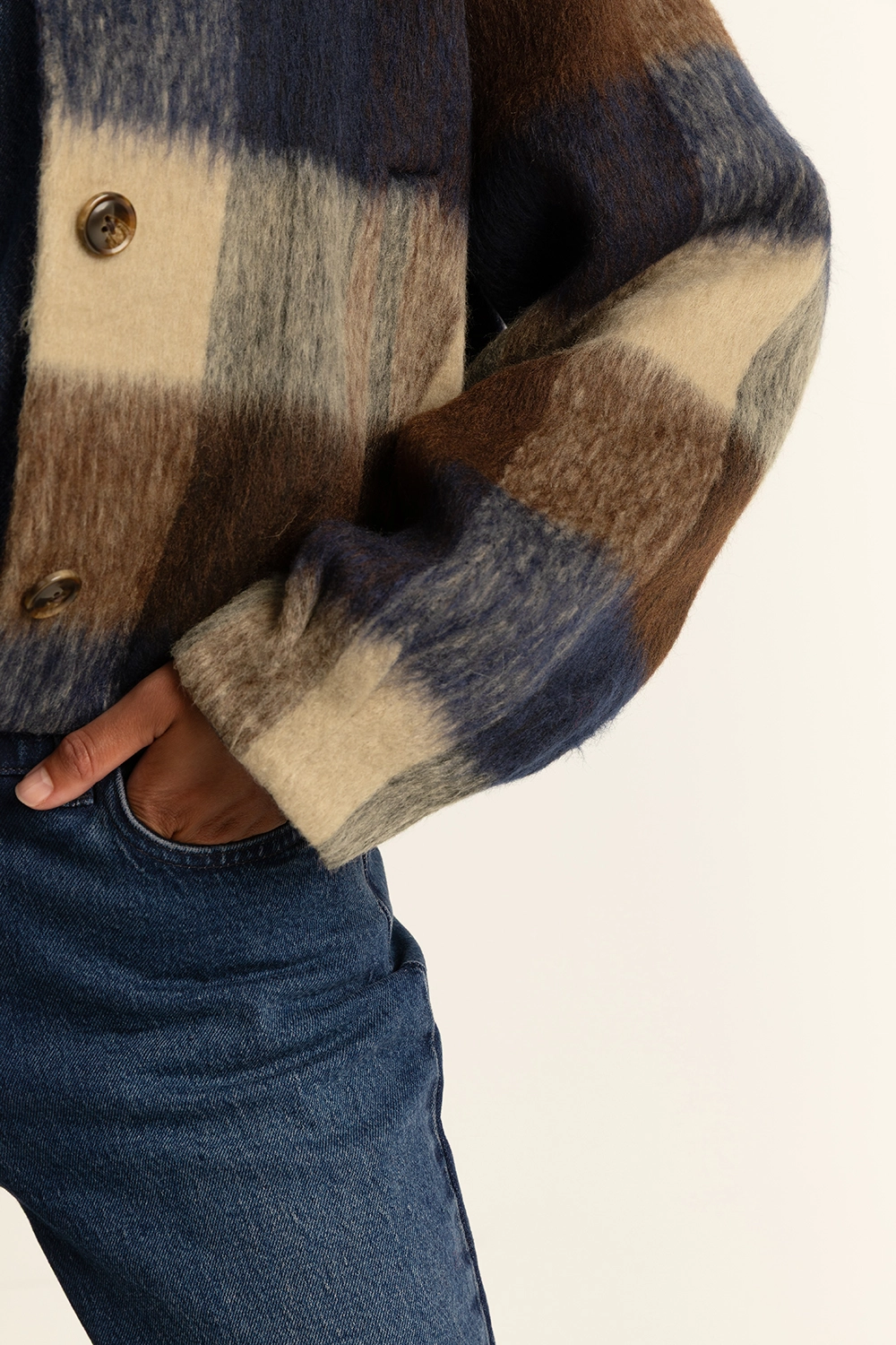 Geruite jas – Kort, rechtvallend model met klassieke kraag en lange mouwen. Het grove ruitdessin geeft deze jas een eigentijdse en speelse uitstraling, terwijl de zachte stof zorgt voor warmte en draagcomfort. Een statement piece dat je look meteen karakter geeft.