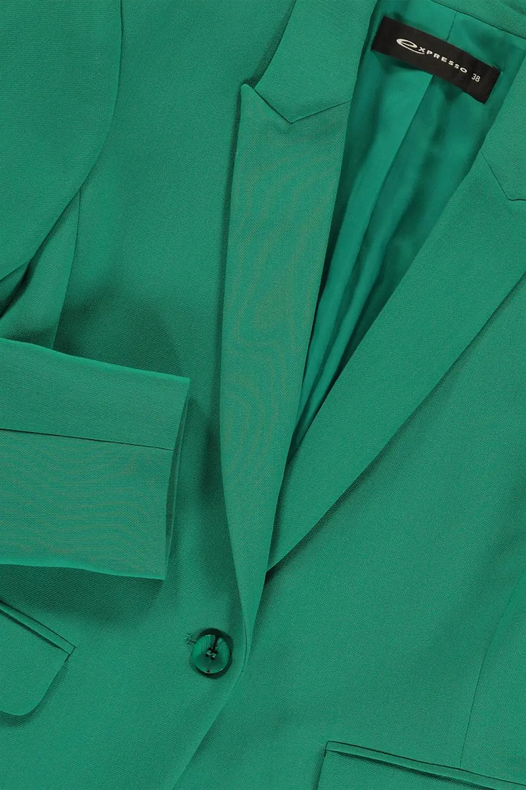 Flessengroene blazer – stretchkwaliteit met viscose. Getailleerd, single-breasted, heuplengte. Gemaakt van matte, soepelvallende stof. Deze lengte combineert goed met de meeste rokken en broeken, van wijd tot slim-fit. Tip: met de bijpassende tapse broek stel je een veelzijdige co-ord set samen.